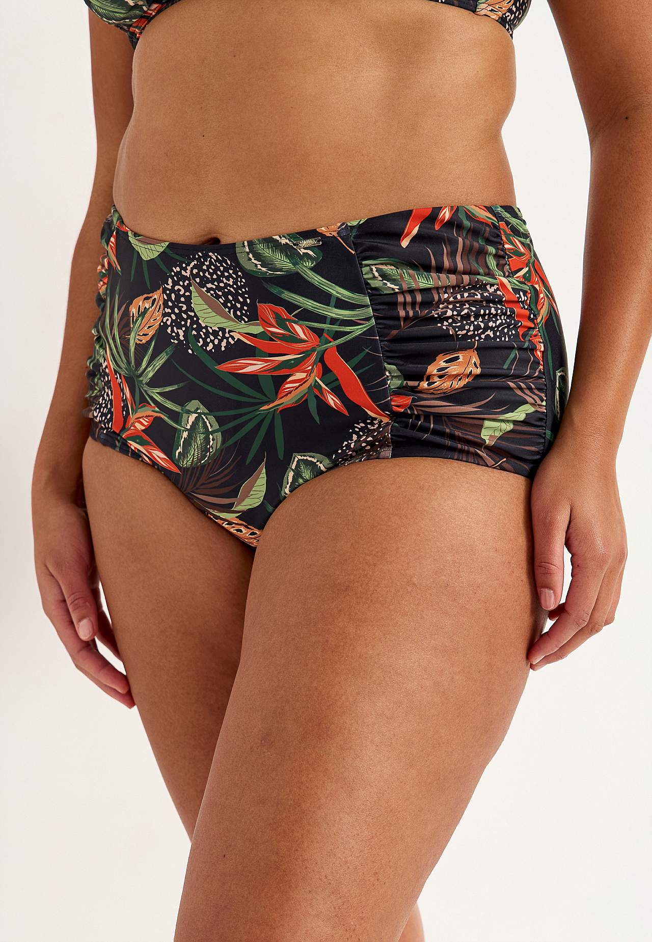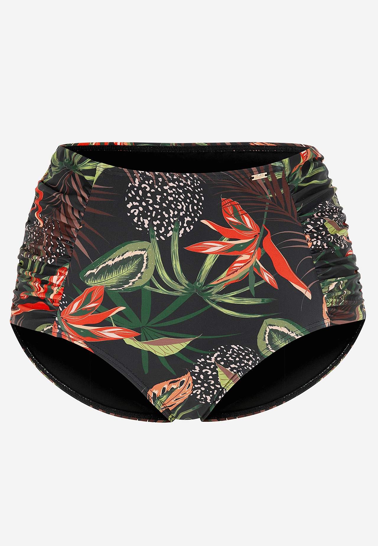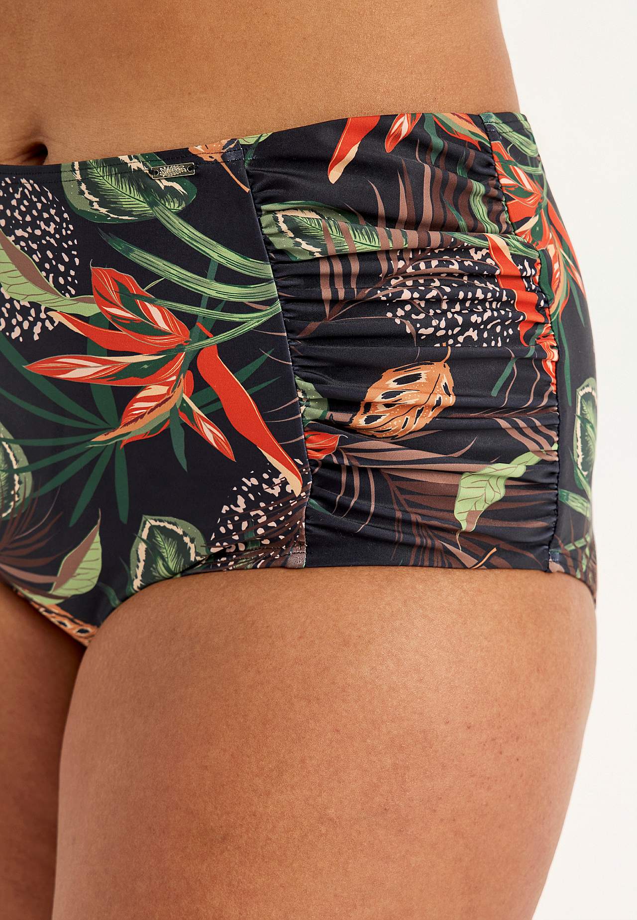 Bikiniunderdel i genindvundet polyester. Høj talje. Smukt mønster både foran og bagpå. Dekorativ drapering i siderne. Helforet inderside.