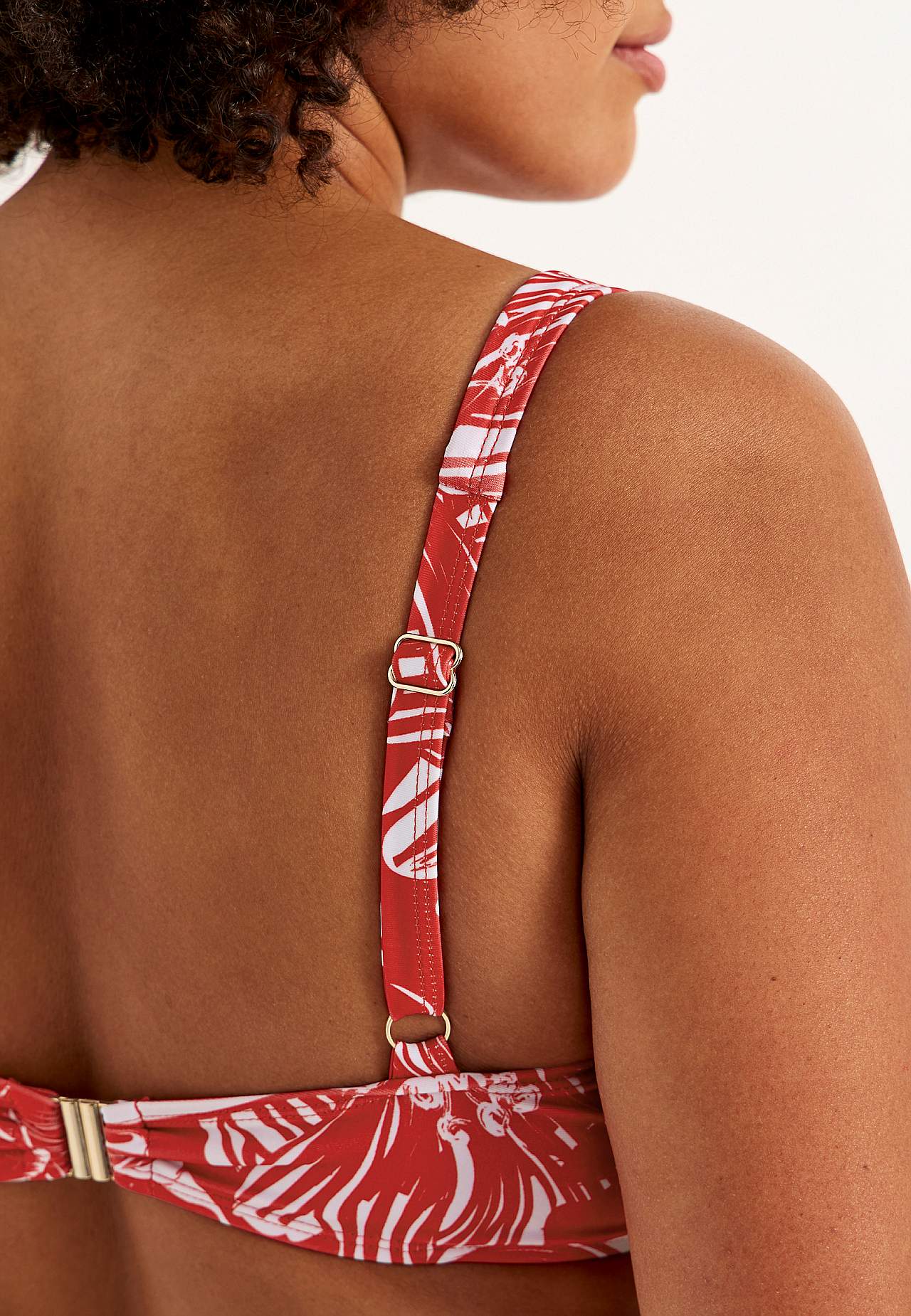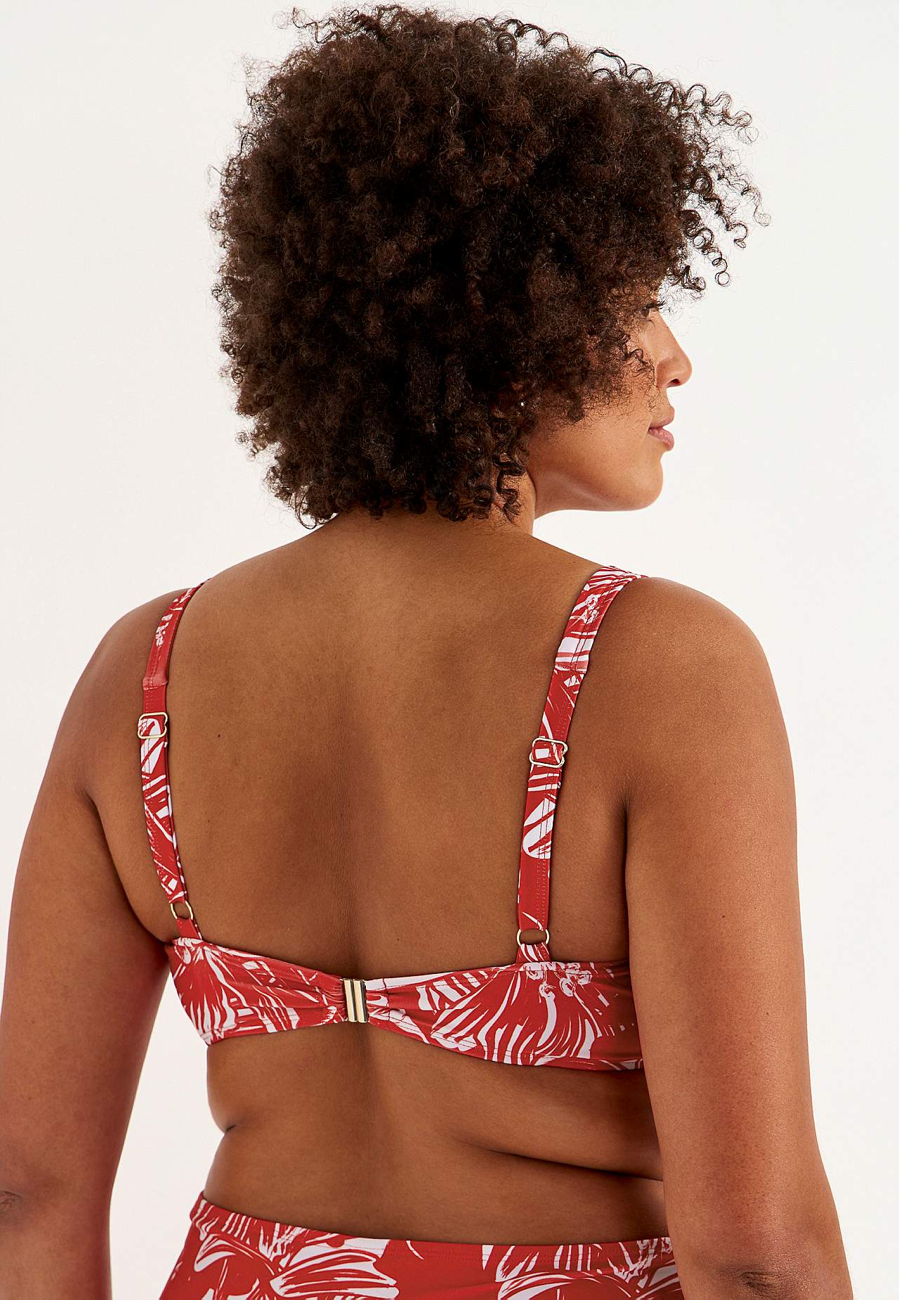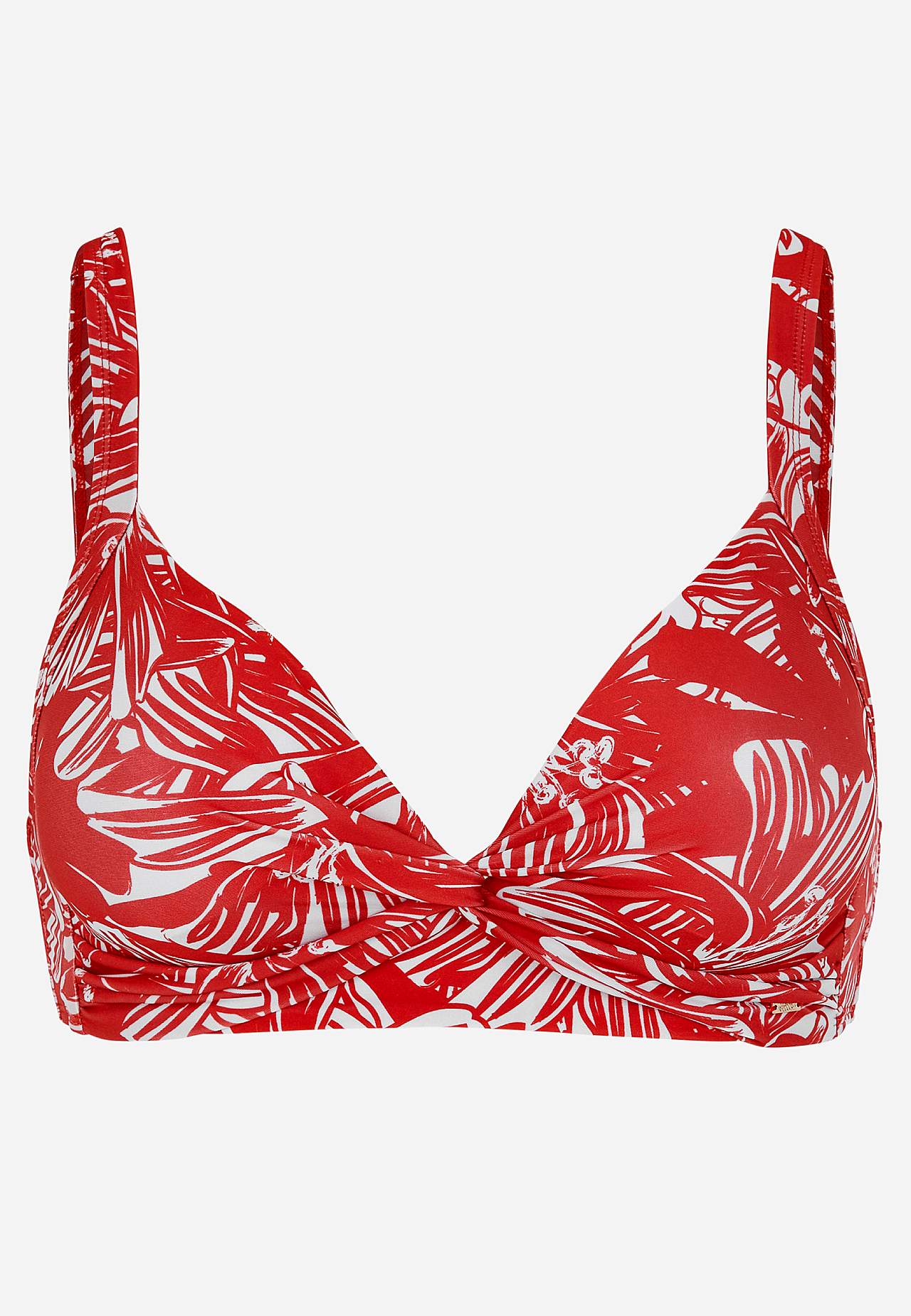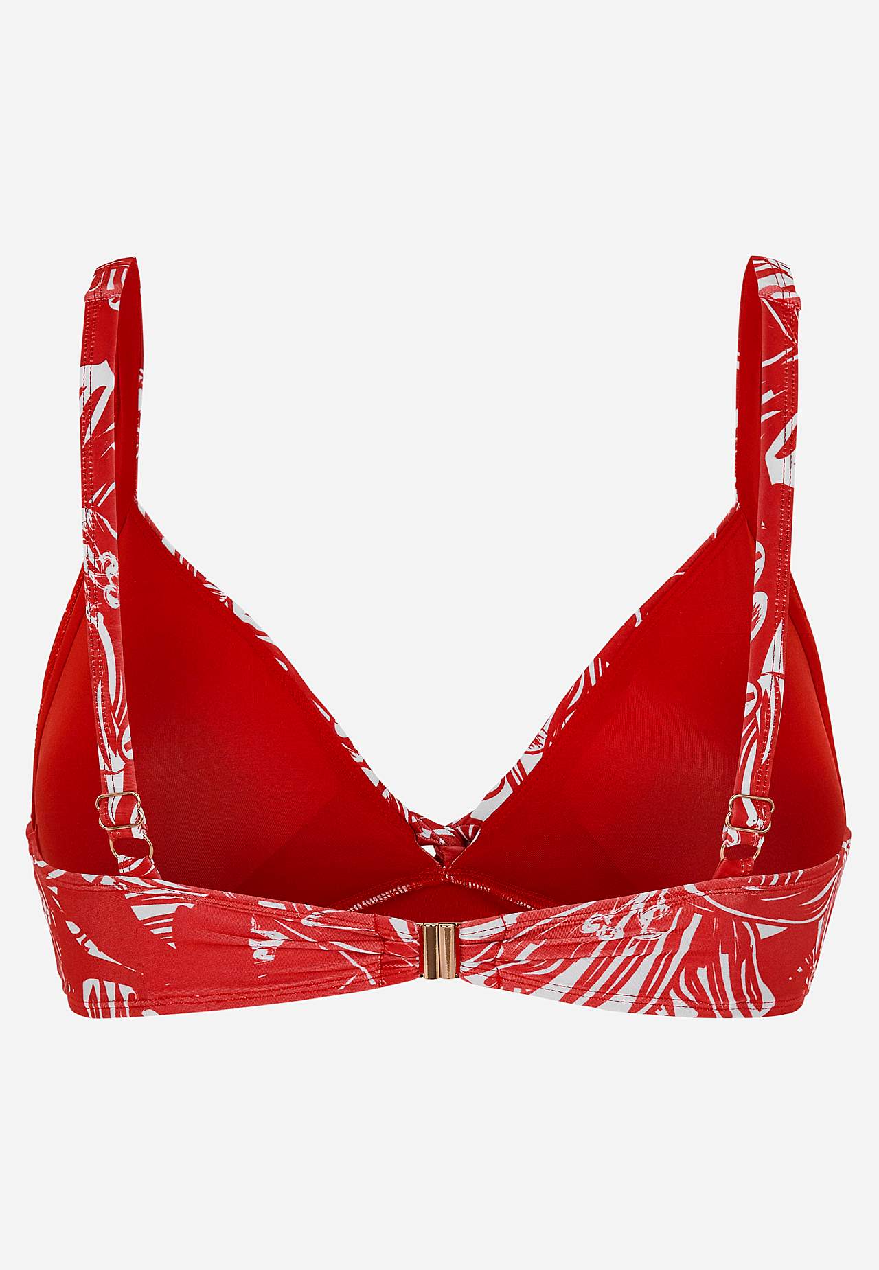 Blød bikini-bh uden bøjle med støtteskinne i siderne for ekstra støtte. Bikini i genindvundet polyester. Model med et blomstermønster. Skål med aftagelig polstring. Justerbare skulderstropper for den bedste pasform. Nem-at-lukke metallukning bagpå.