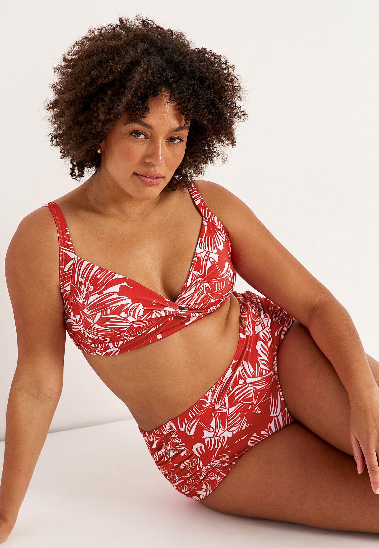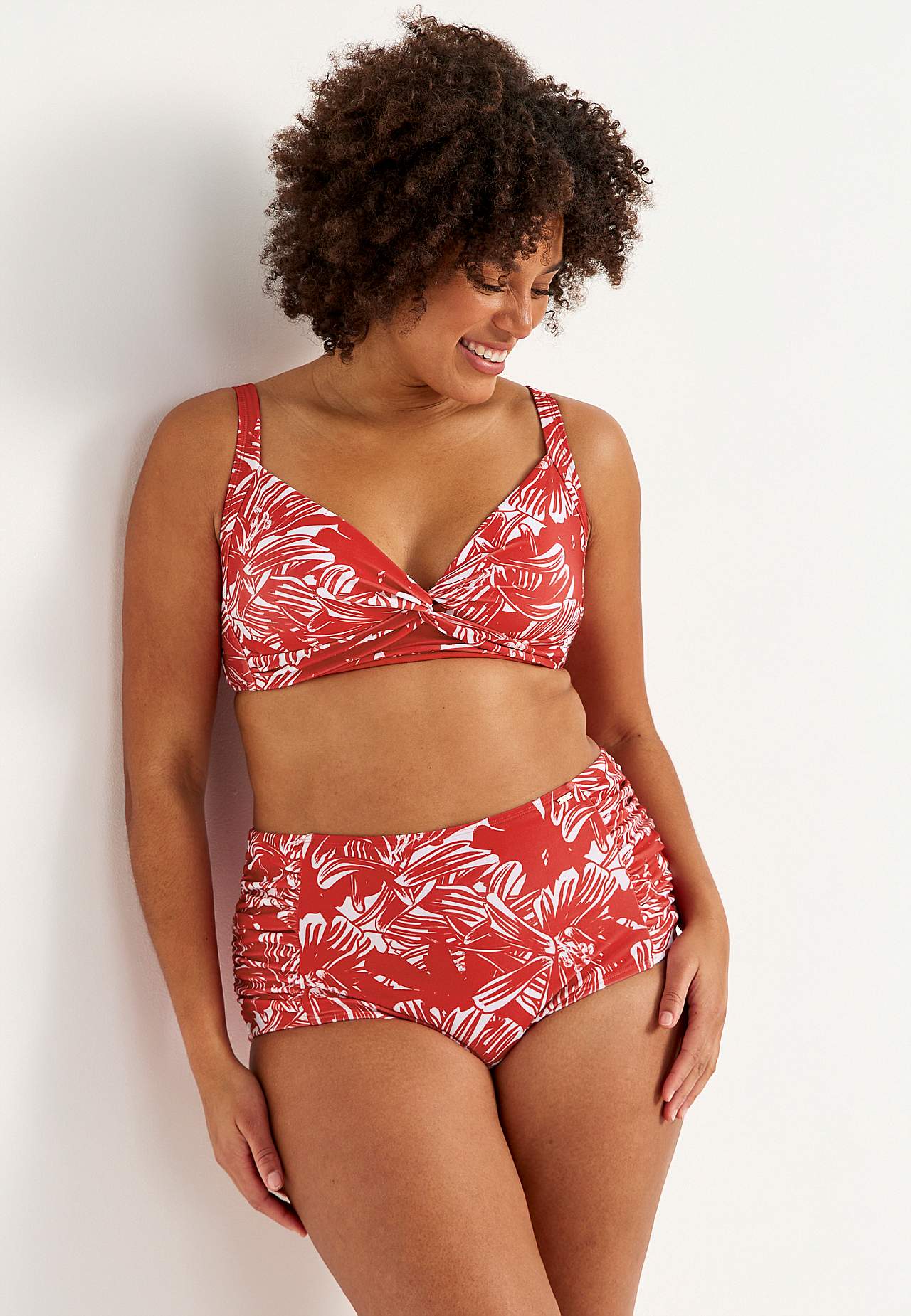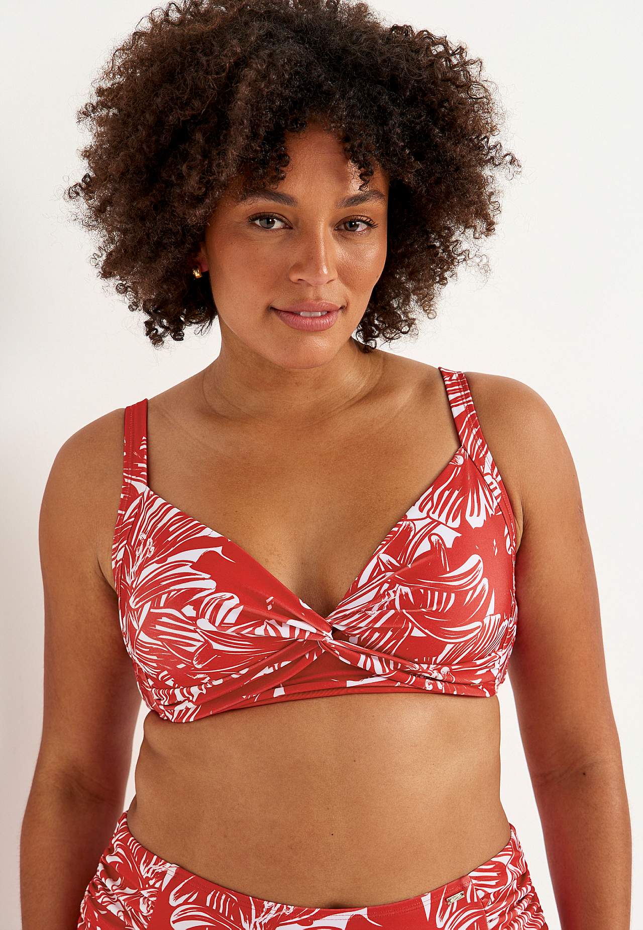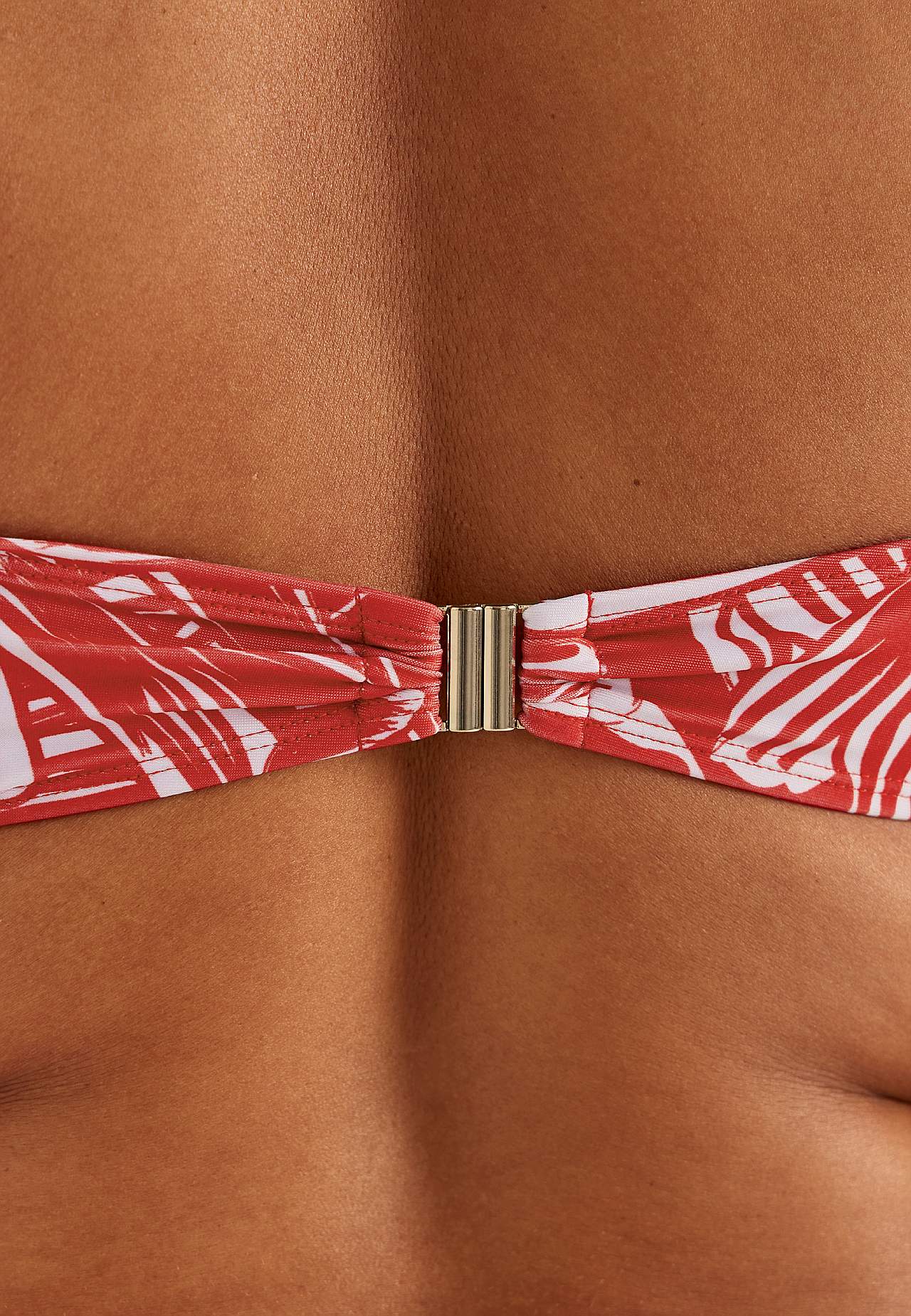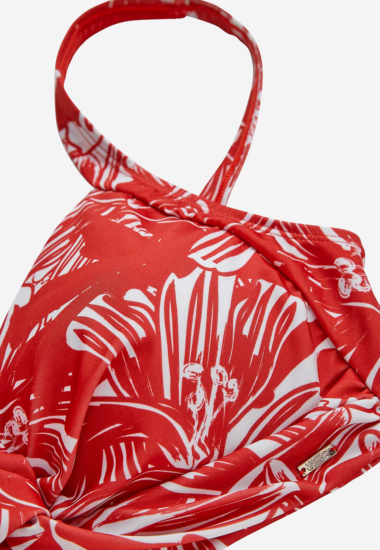 Blød bikini-bh uden bøjle med støtteskinne i siderne for ekstra støtte. Bikini i genindvundet polyester. Model med et blomstermønster. Skål med aftagelig polstring. Justerbare skulderstropper for den bedste pasform. Nem-at-lukke metallukning bagpå.