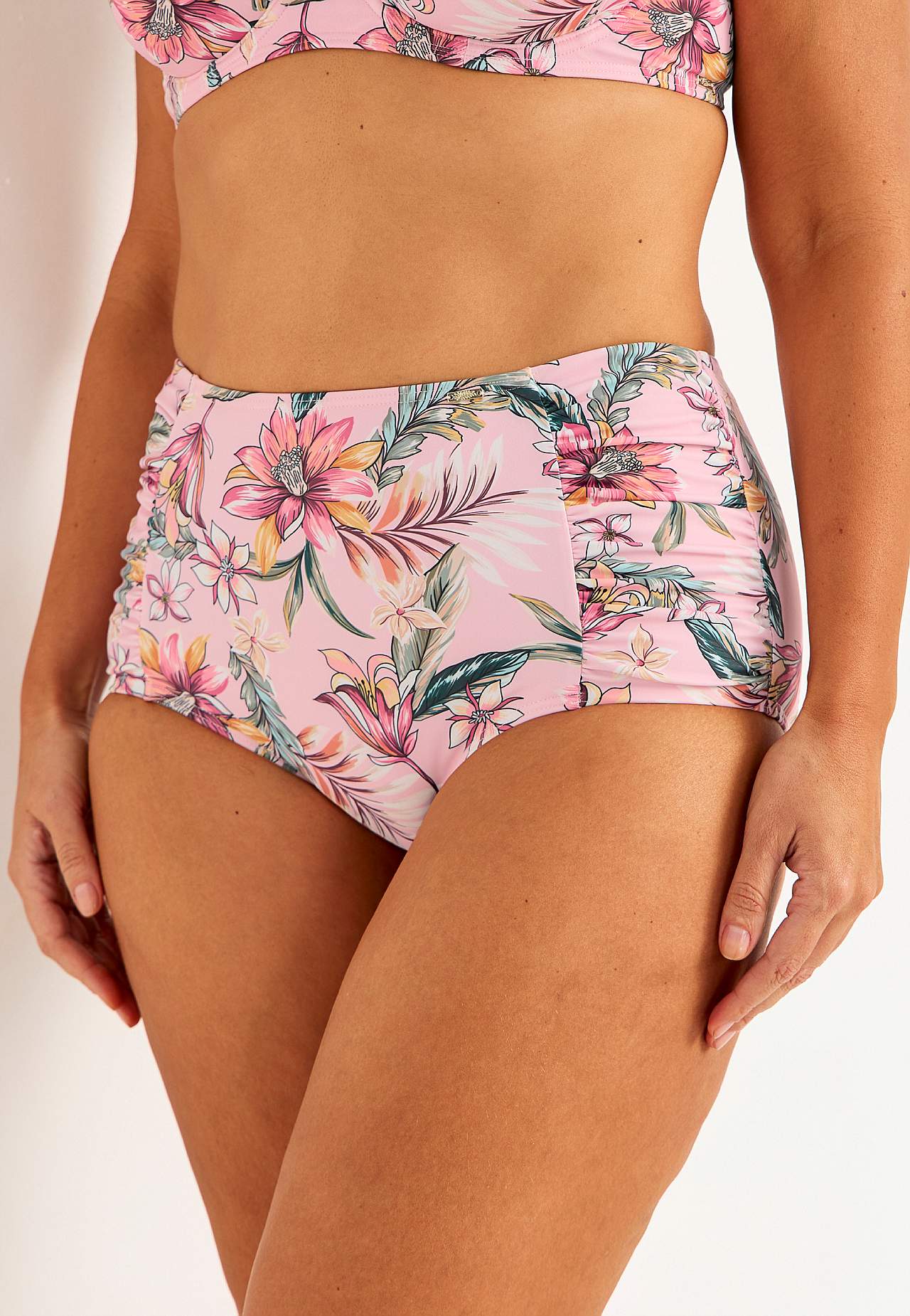 Blomstret bikiniunderdel i genindvundet polyester. Høj talje. Dekorativ drapering i siderne. Helforet inderside.
