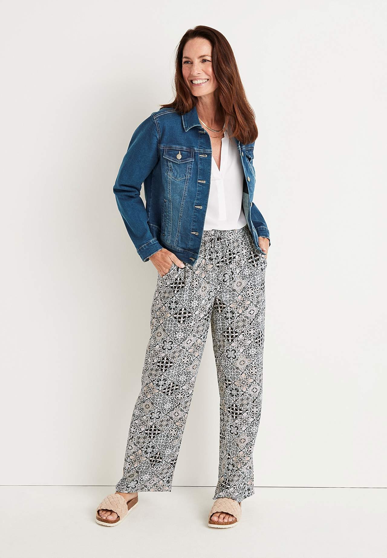 Vævede bukser med crepe kvalitet. Bred, blød elastisk linning med snoretræk. Skrå lomme på fronten. Skridthøjden følger størrelsen ca. 29-39 cm. Indvendig benlængde ca. 74 cm i alle størrelser.