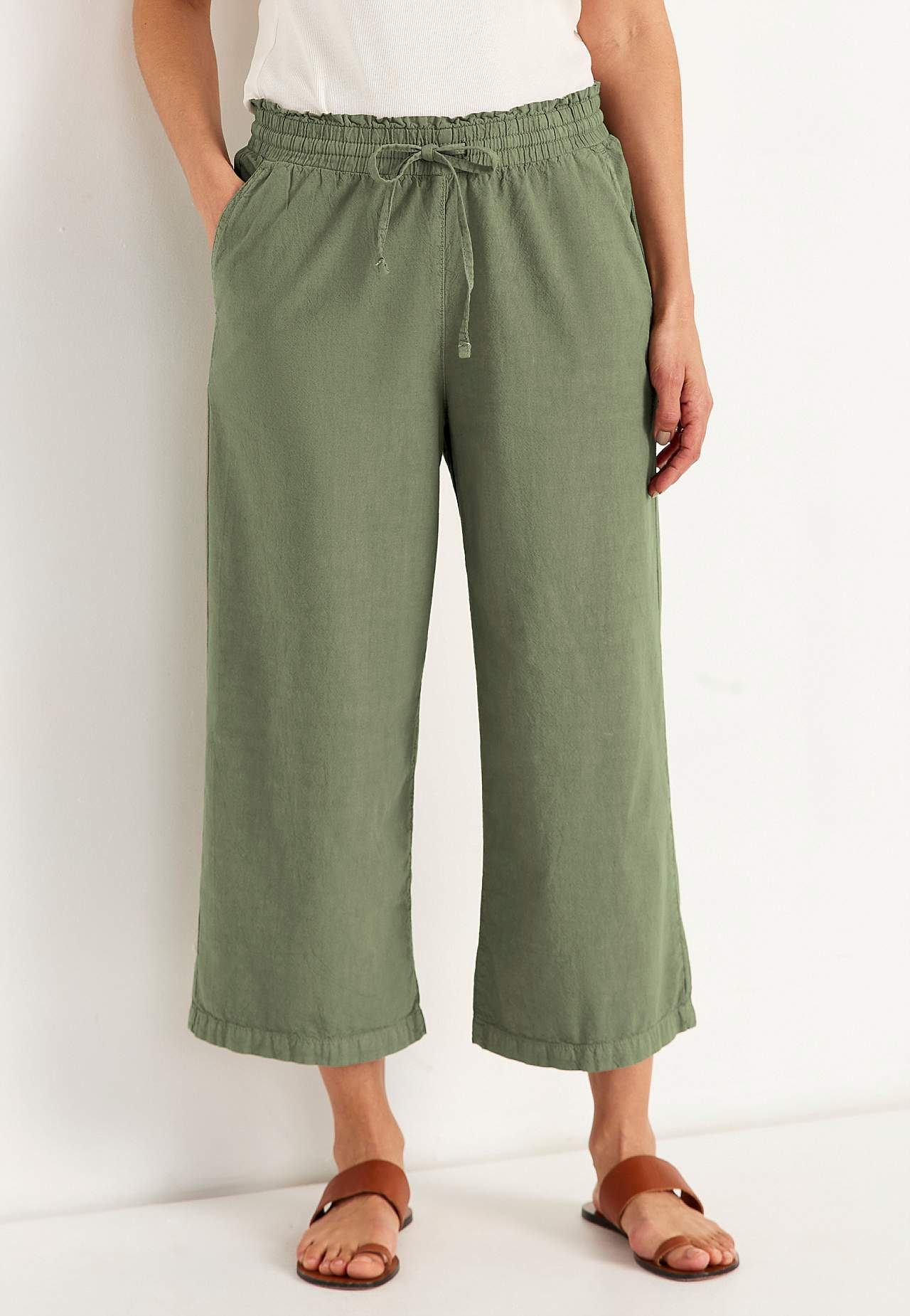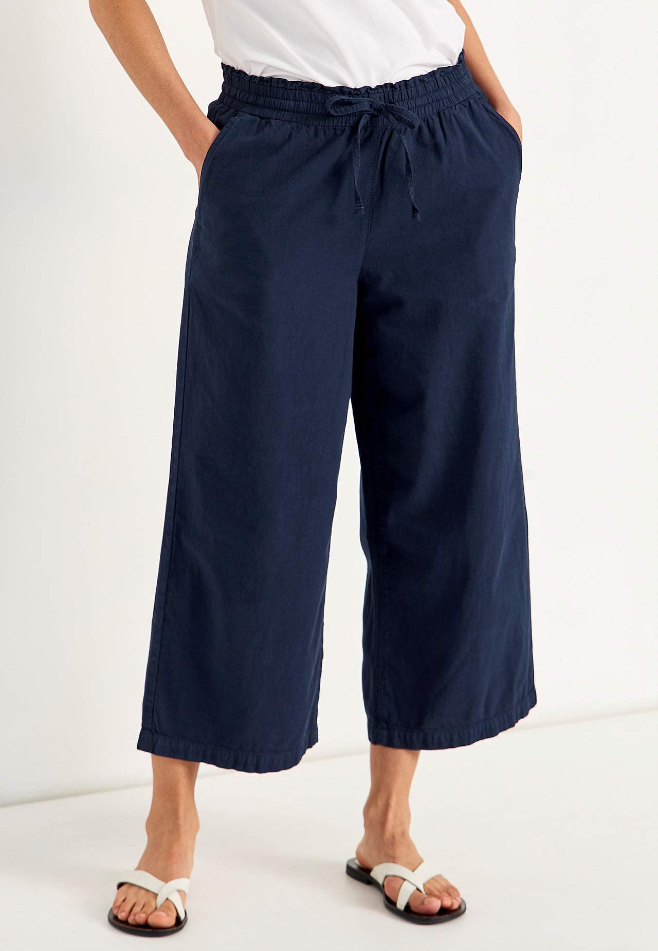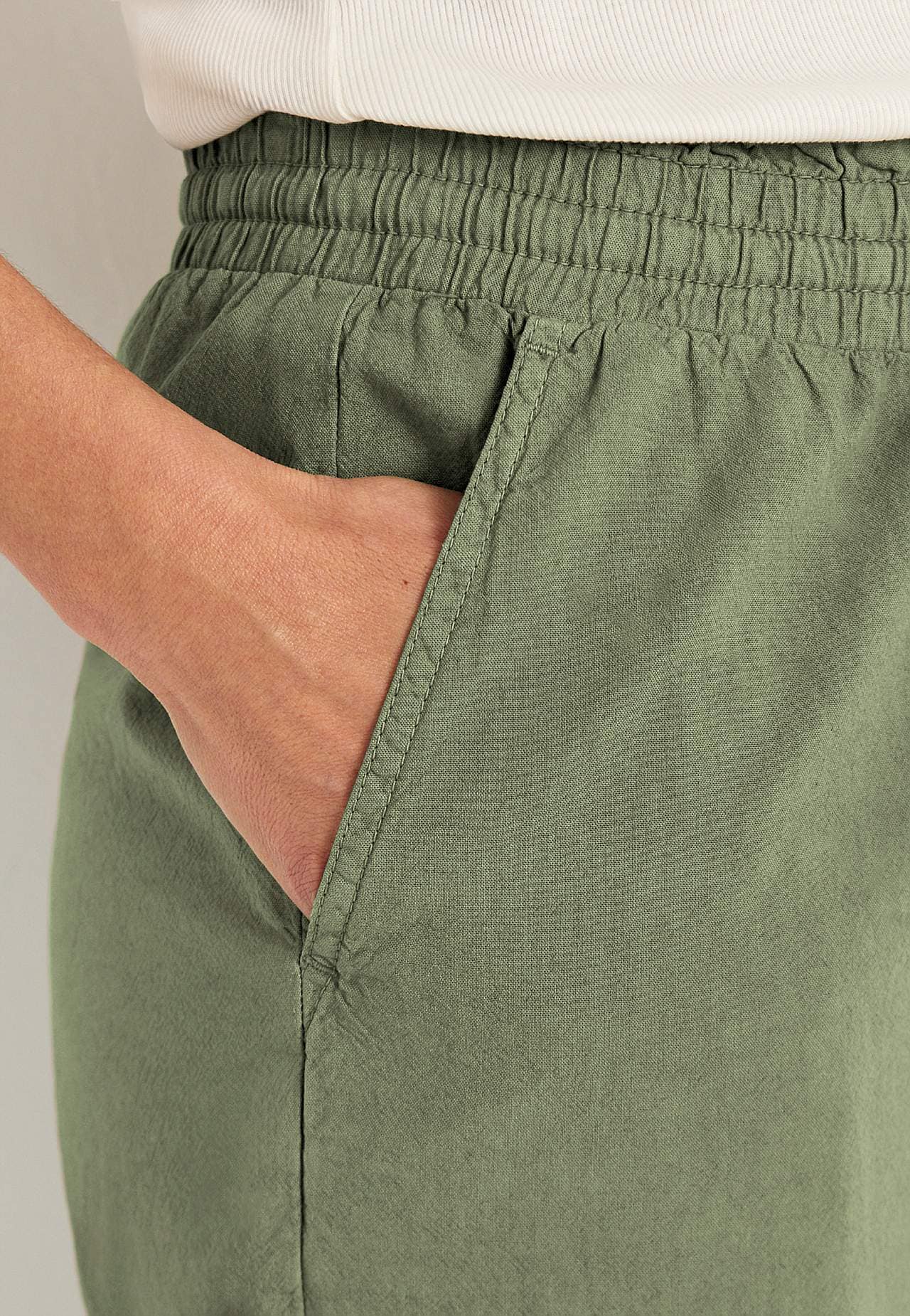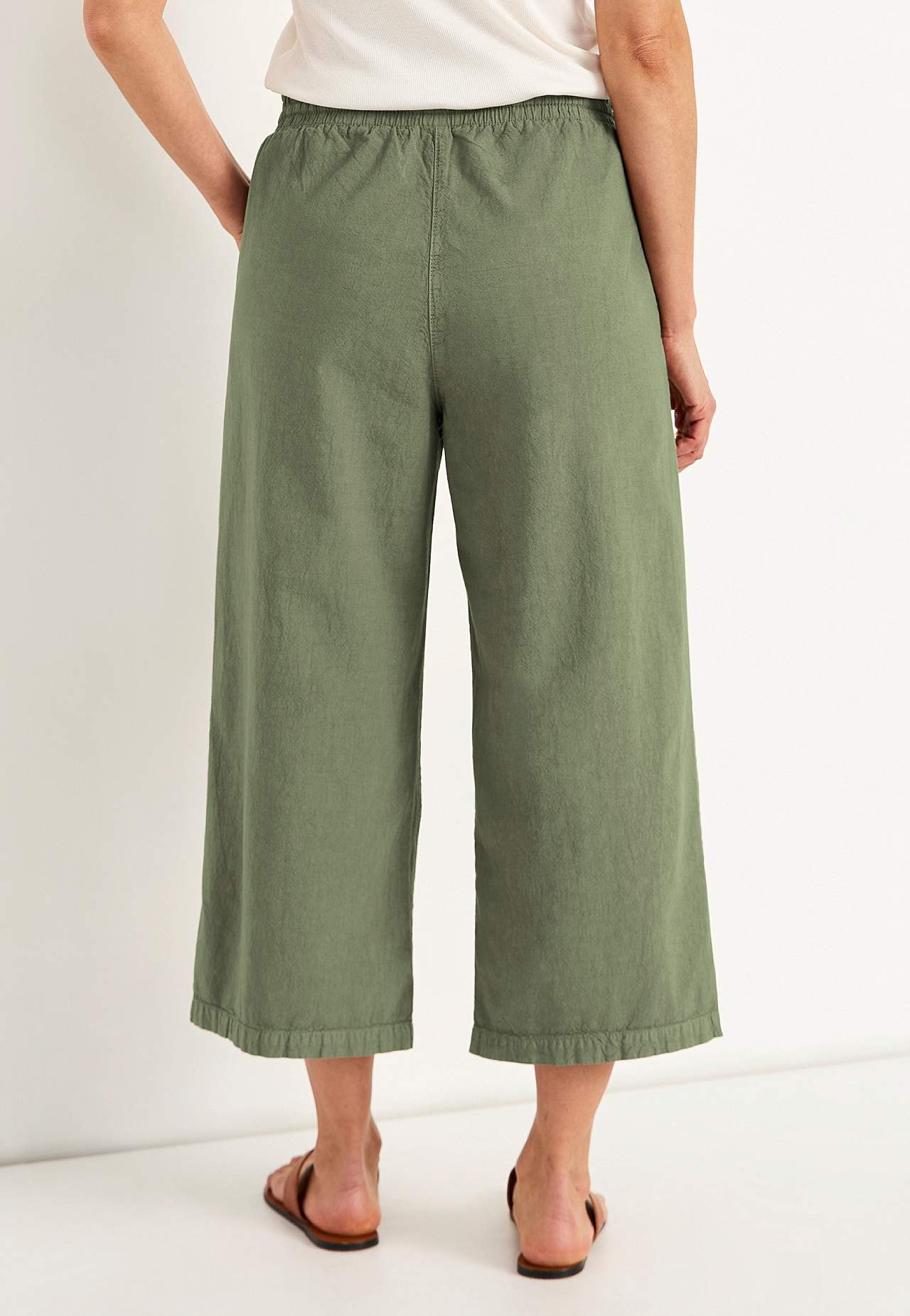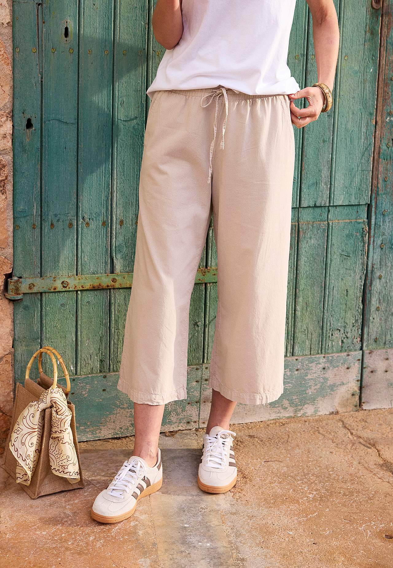 Afslappede culottebukser. Vævet materiale i vasket, smidig bomuld med naturlig følelse. Løs pasform. Bekvem, elastisk talje med snoretræk. Skrå forlommer. Brede, lige ben. Indvendig benlængde ca. 57 cm i alle størrelser. Skridthøjden følger størrelsen ca. 27-37 cm.