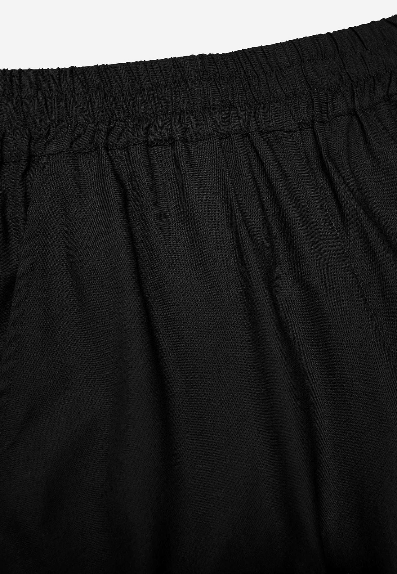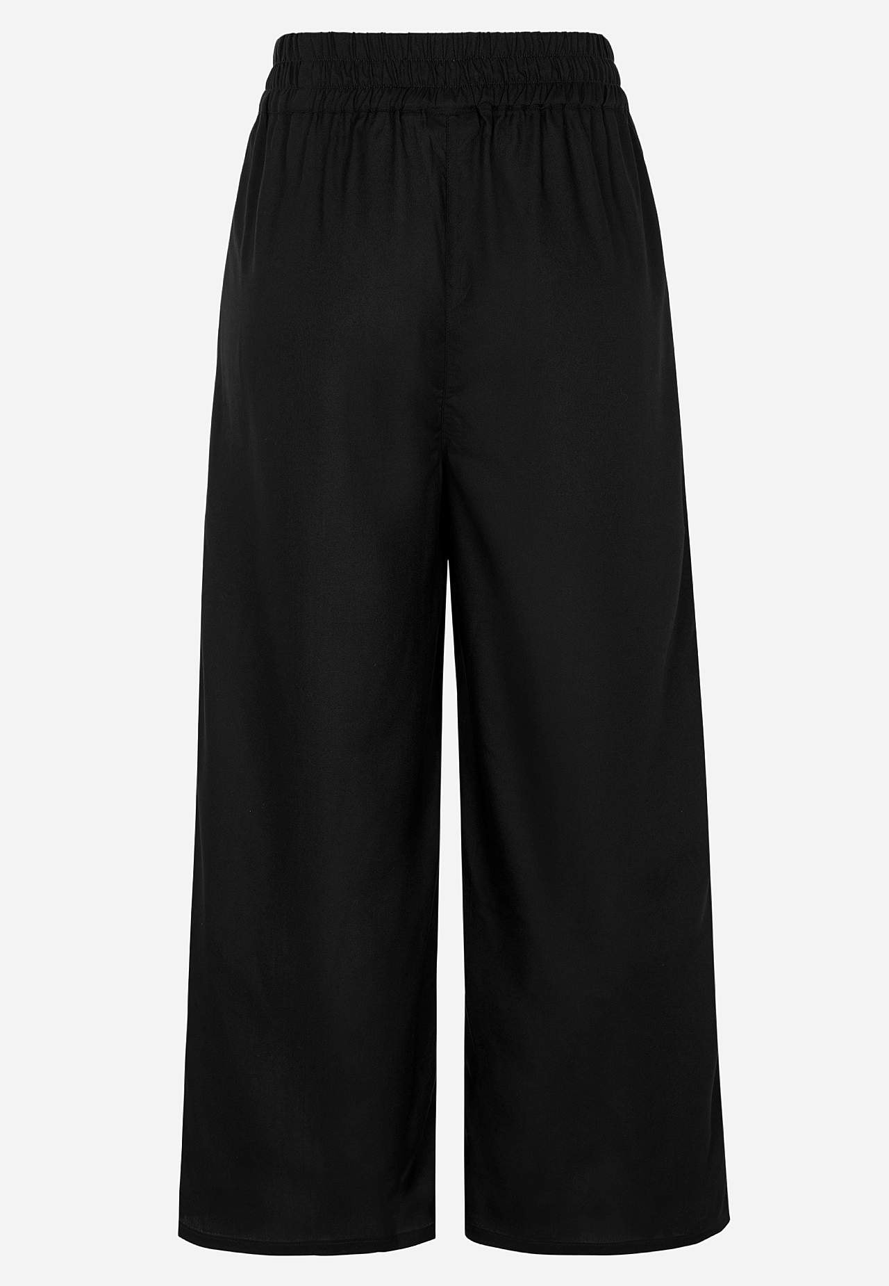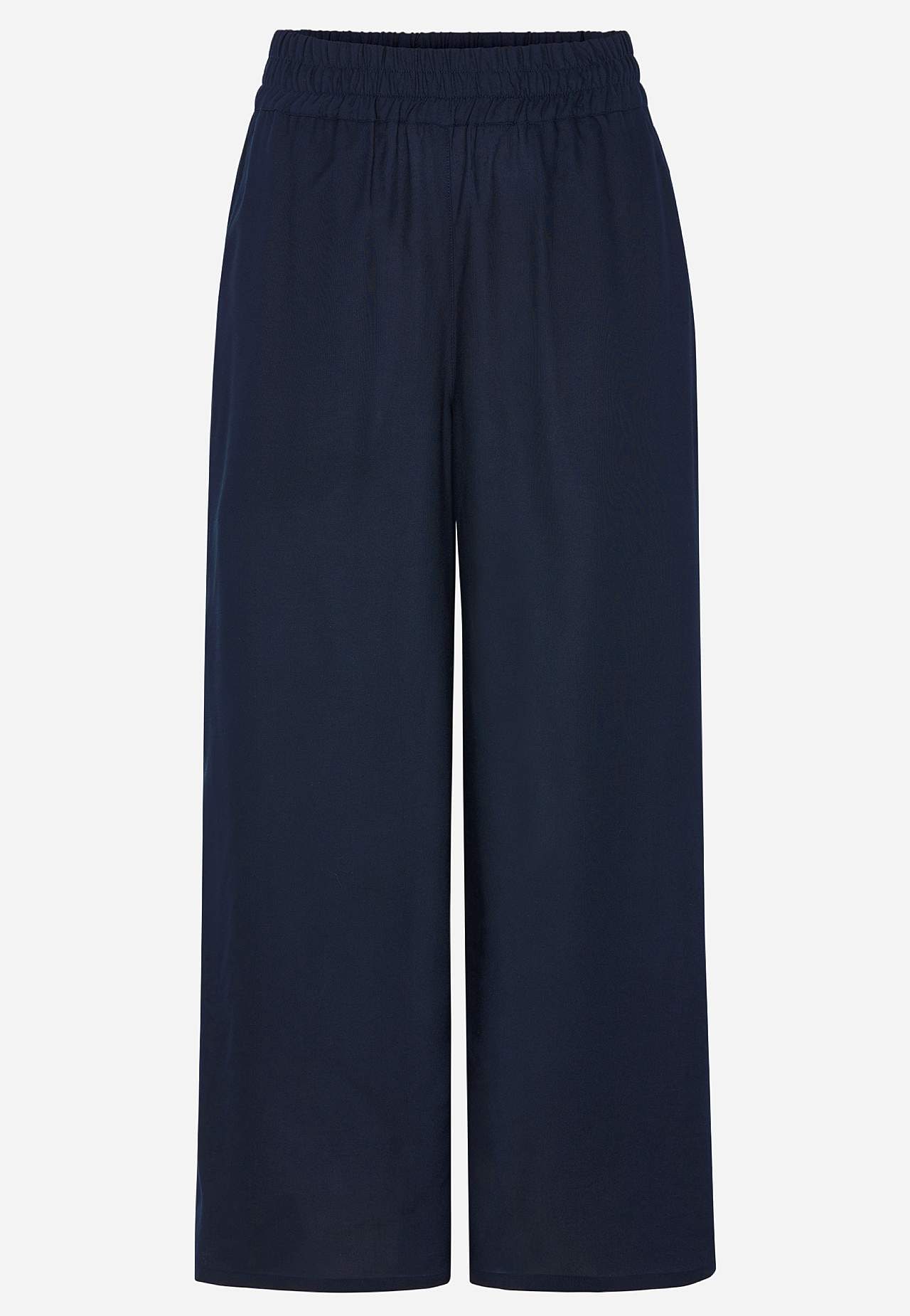 Vævede, luftige culottebukser. Glat, fleksibel, kølende viskose. Bred, blød elastisk linning. Skrå lommer på fronten. Indvendig benlængde ca. 60 cm i alle størrelser. Match gerne med 702443.