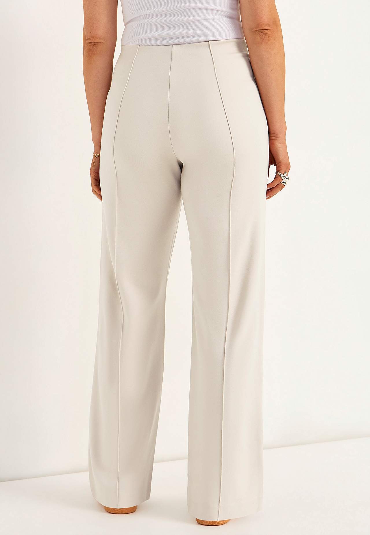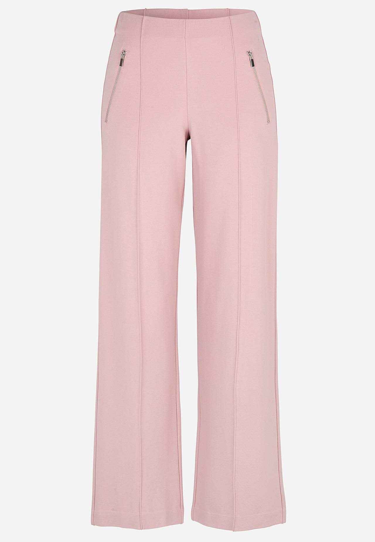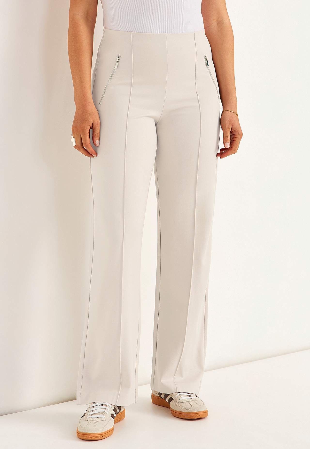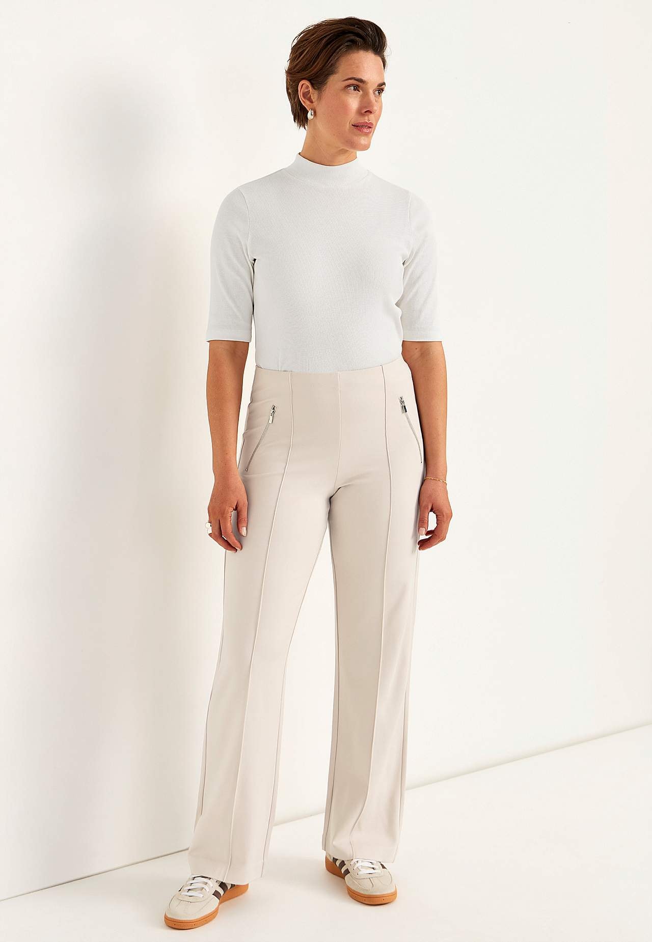 Fulde længder bukser i fast, elastisk jersey med syede pressefolder. Blødt, smidigt materiale med dejligt fald. Normal pasform med lige, brede ben. Normal talje med skjult elastik. Dekorative lynlåse på fronten. Syede pressefolder både foran og bagpå. Indvendig benlængde ca. 78 cm i alle størrelser. Skridthøjden følger stør... Læs mere
