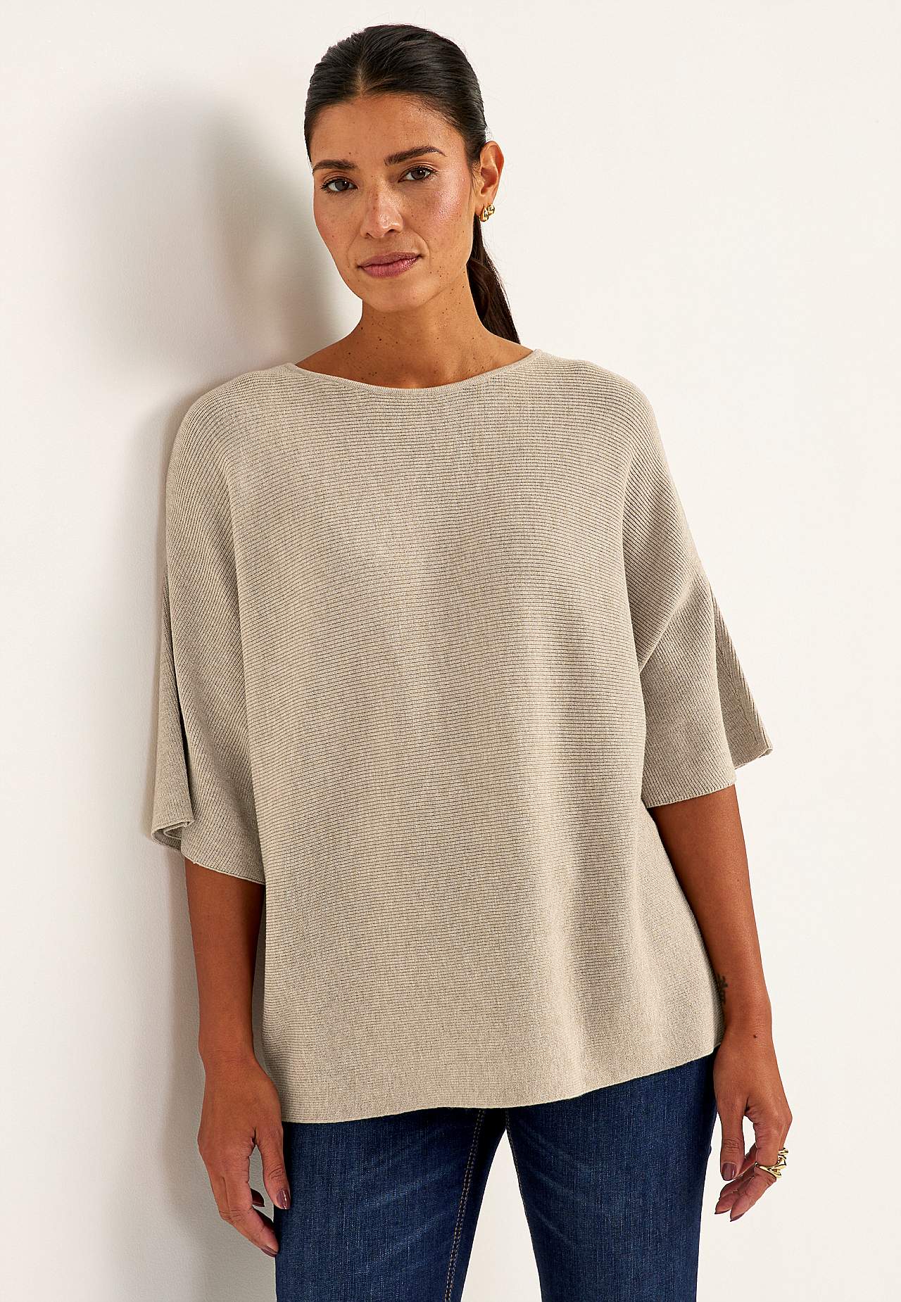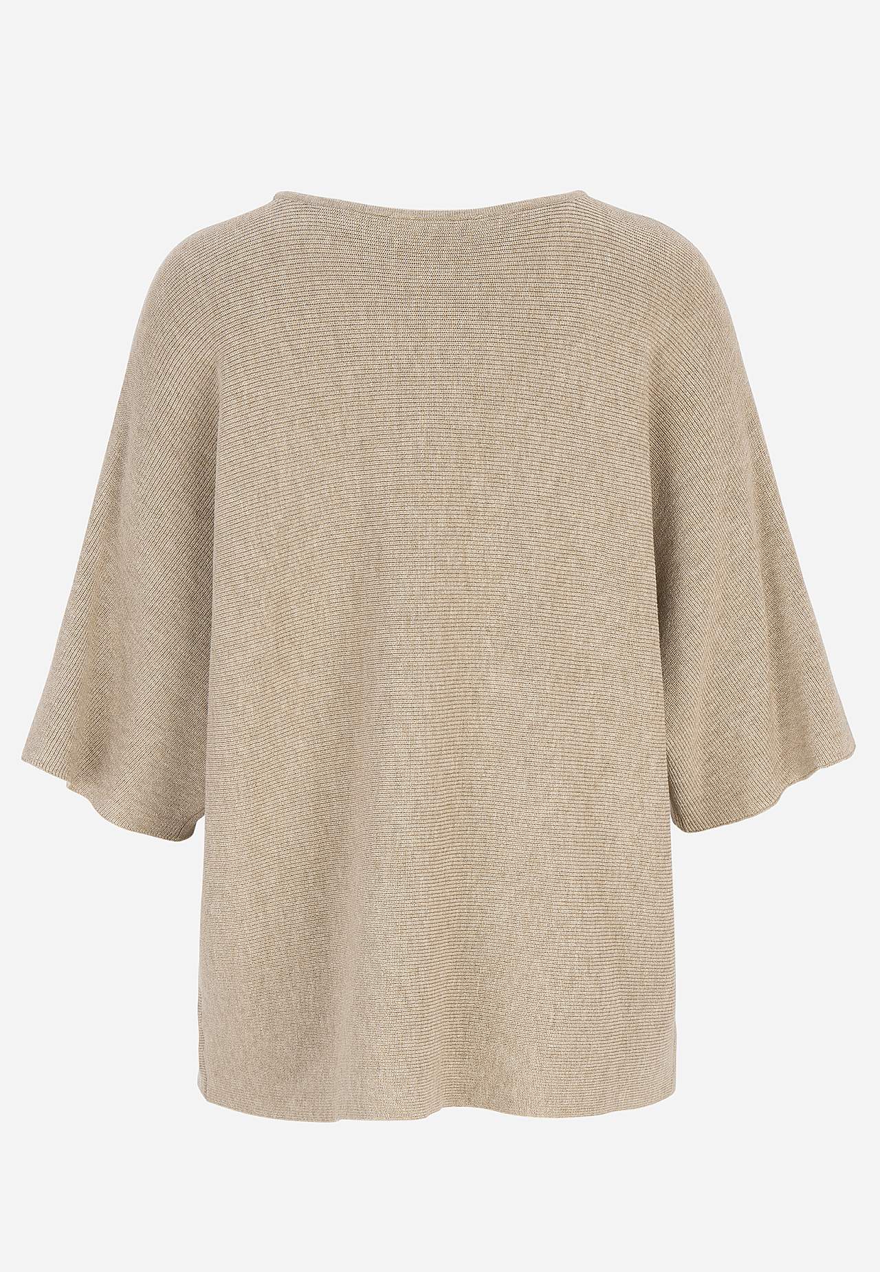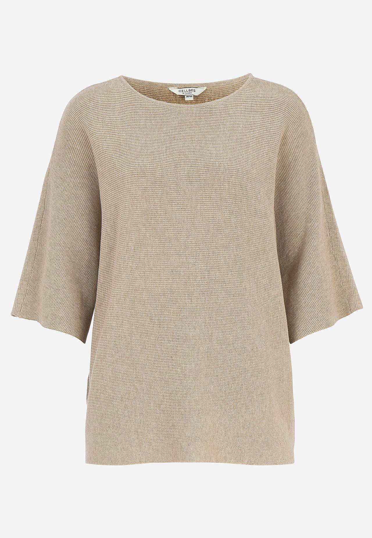 Blød, elastisk trøje. Horisontal sting. Løstsiddende og casual pasform. Halsudskæring med bådudskæring. 3/4 lange pingvinærmer. Længden følger størrelsen, ca. 59-66 cm fra skulderen.