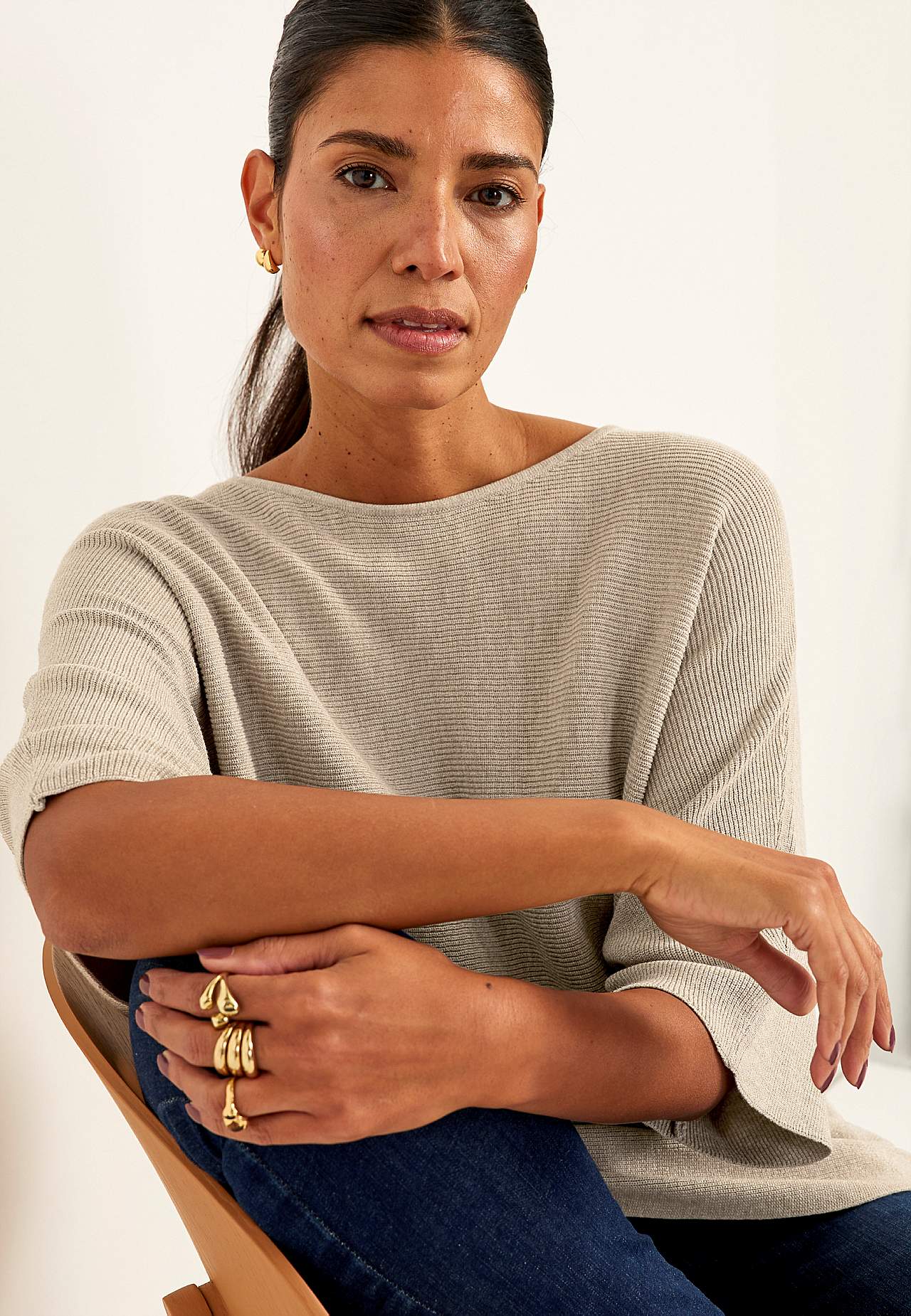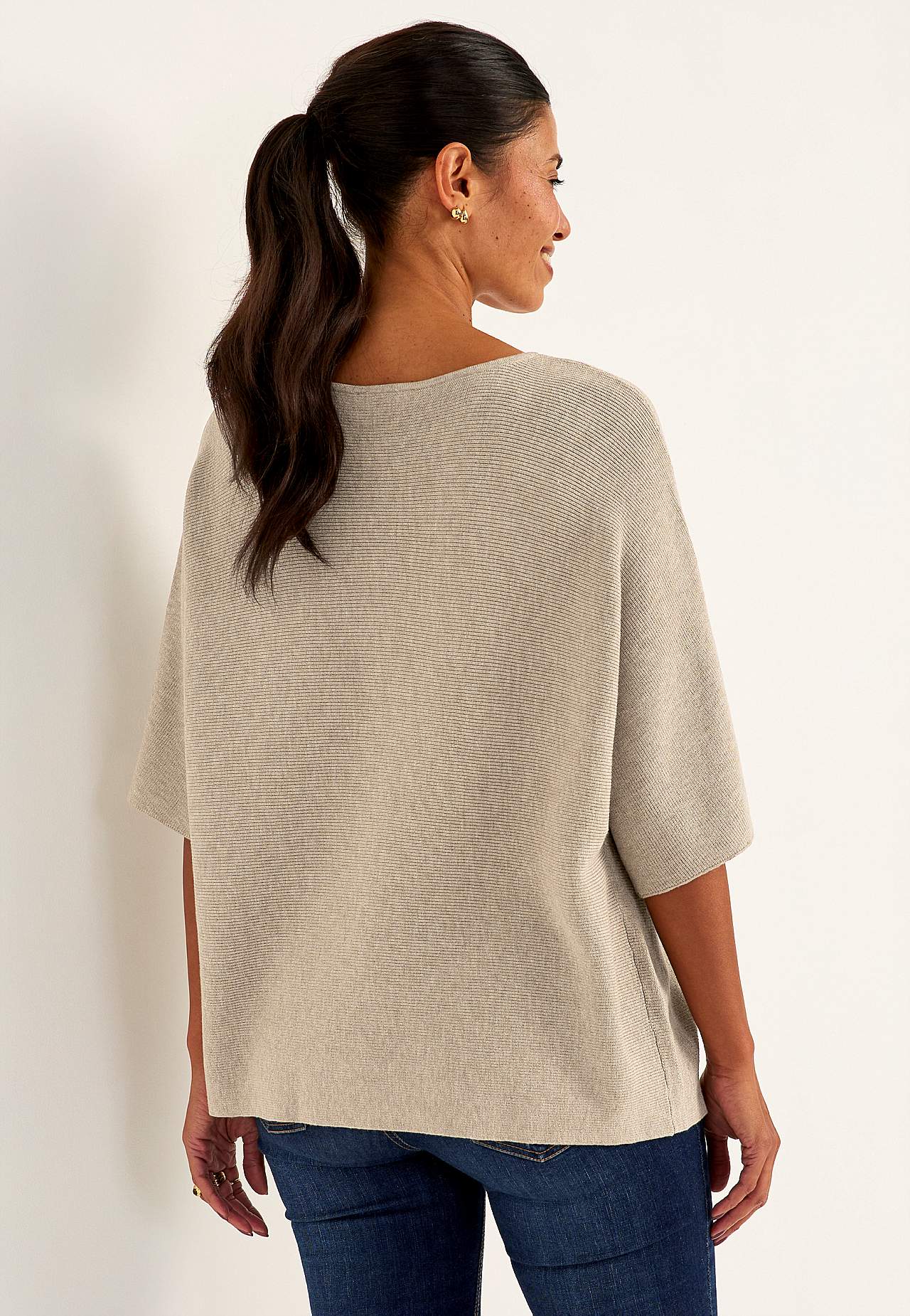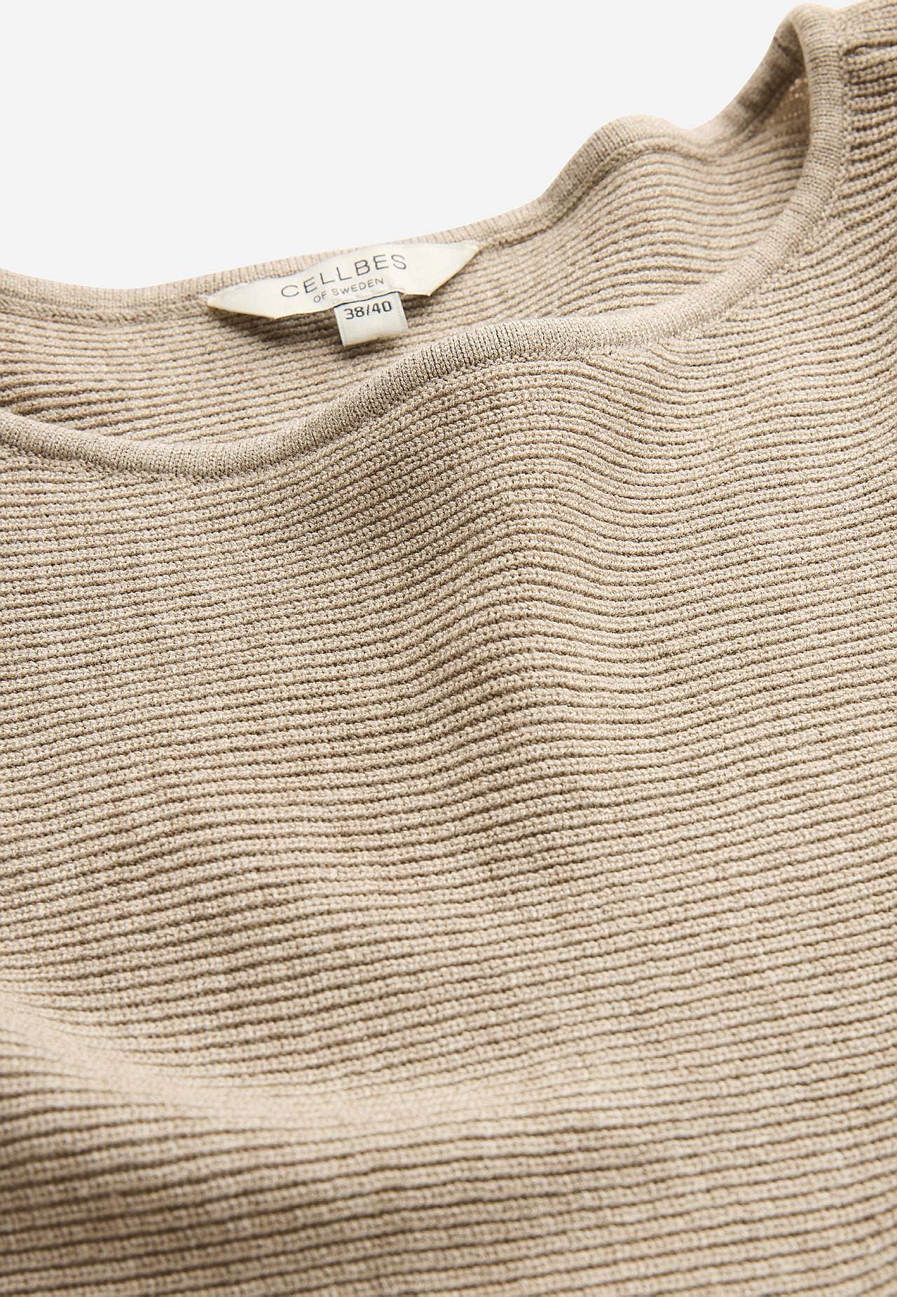 Blød, elastisk trøje. Horisontal sting. Løstsiddende og casual pasform. Halsudskæring med bådudskæring. 3/4 lange pingvinærmer. Længden følger størrelsen, ca. 59-66 cm fra skulderen.