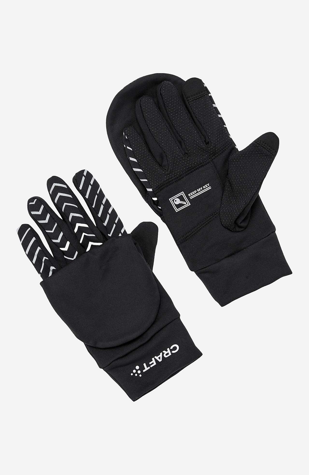 Handsker med reflekterende detaljer. Funktionel, blød jersey. Smart nøglelomme. 2-i-1 design med handske og overtræksvante.
