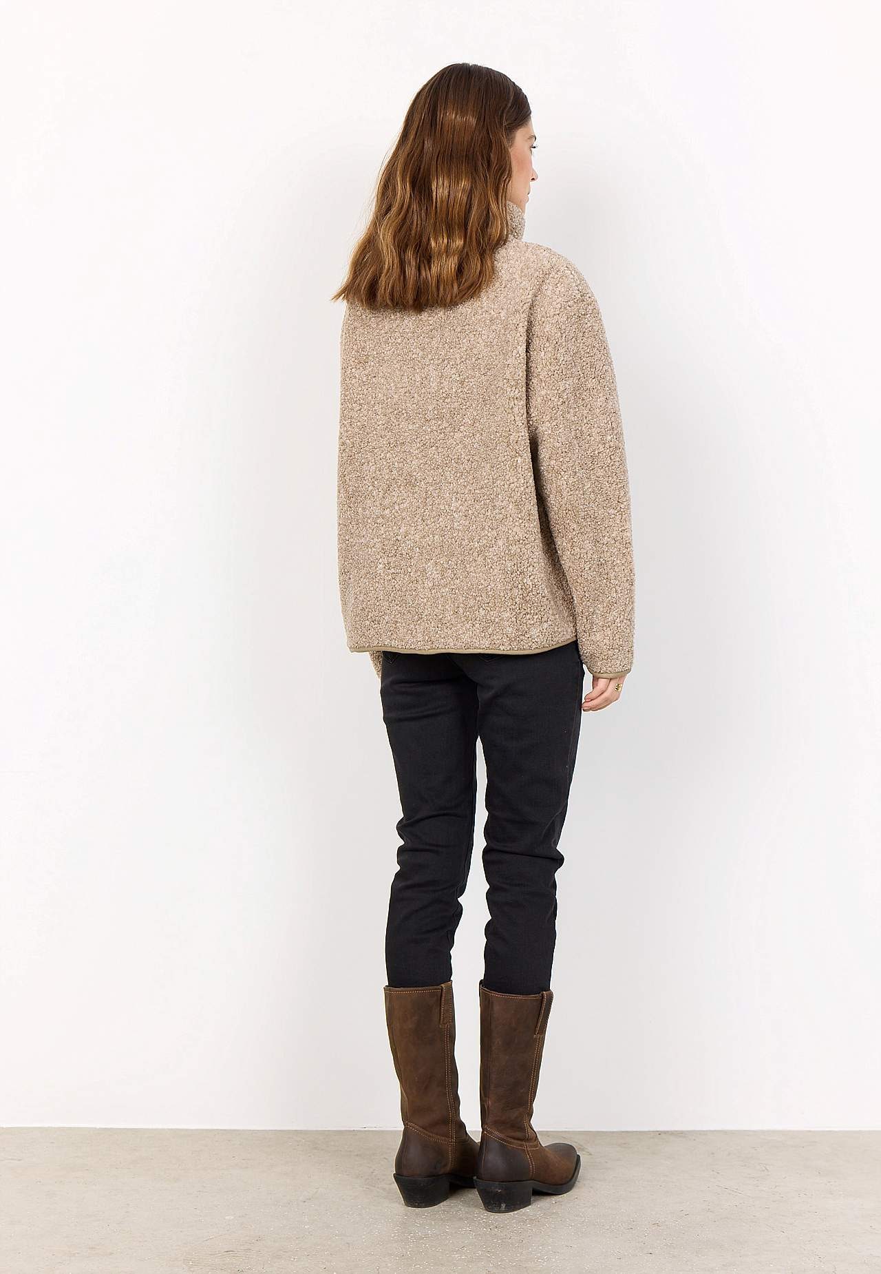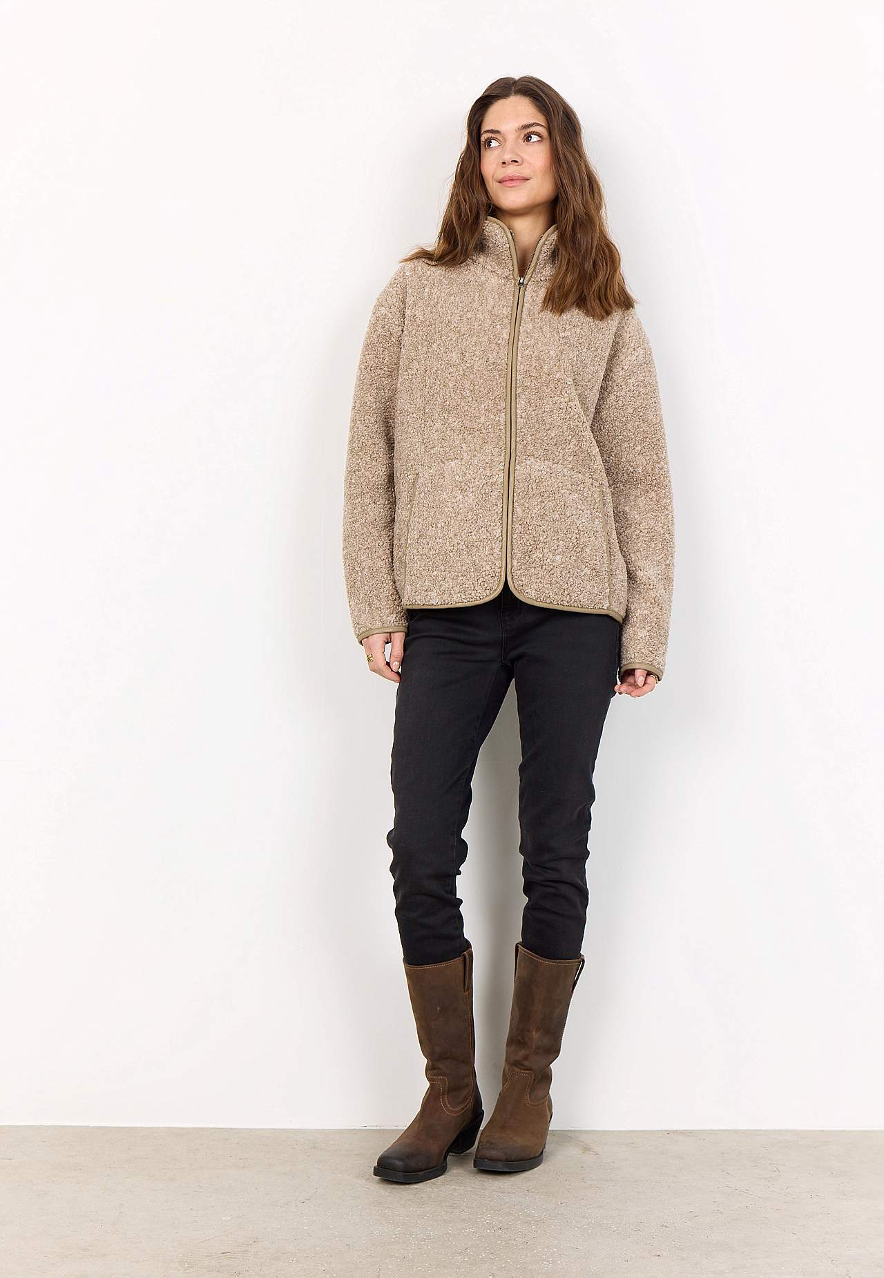 Superblød fleecejakke med blød fleeceforing. Oversized pasform. Hyggelig opretstående krave. Droppet skulder. Lynlåslukning. Lommer foran med blødt for. Lange ærmer med kantbånd på ærmeafslutningerne. Let afrundet søm med kantbånd. Længde ca. 62 cm i størrelse M (40).