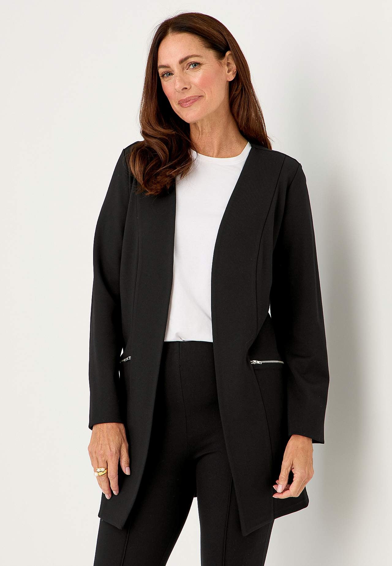 Uformel, åben habitjakke. Kraftig, elastisk jerseykvalitet. Komfortabel, lang model. Lommer med sølvfarvede lynlåse. Lange, lige ærmer. Let afrundet søm. Uden for. Ryglængden følger størrelsen, ca. 78-89 cm.