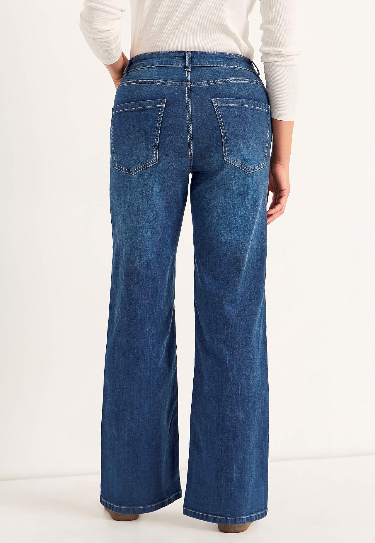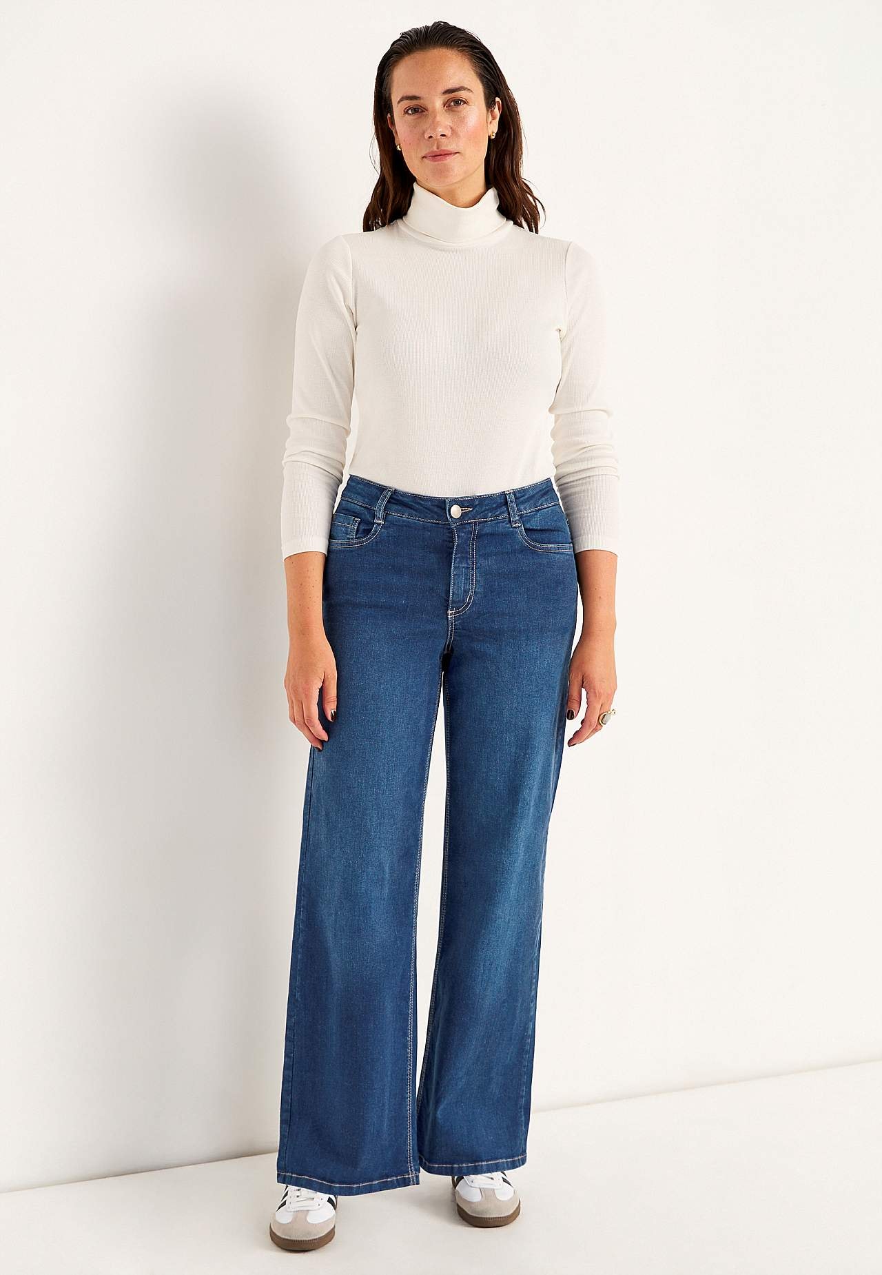 5-lomme bukser. Høj talje. Lige design. Brede ben. Lynlås med knap. Linning med bæltestropper. Indvendig benlængde ca. 80 cm i alle størrelser. Skridthøjden følger størrelsen ca. 24-35 cm. Fås også med en indvendig benlængde på 85 cm, se varenr. 700142.