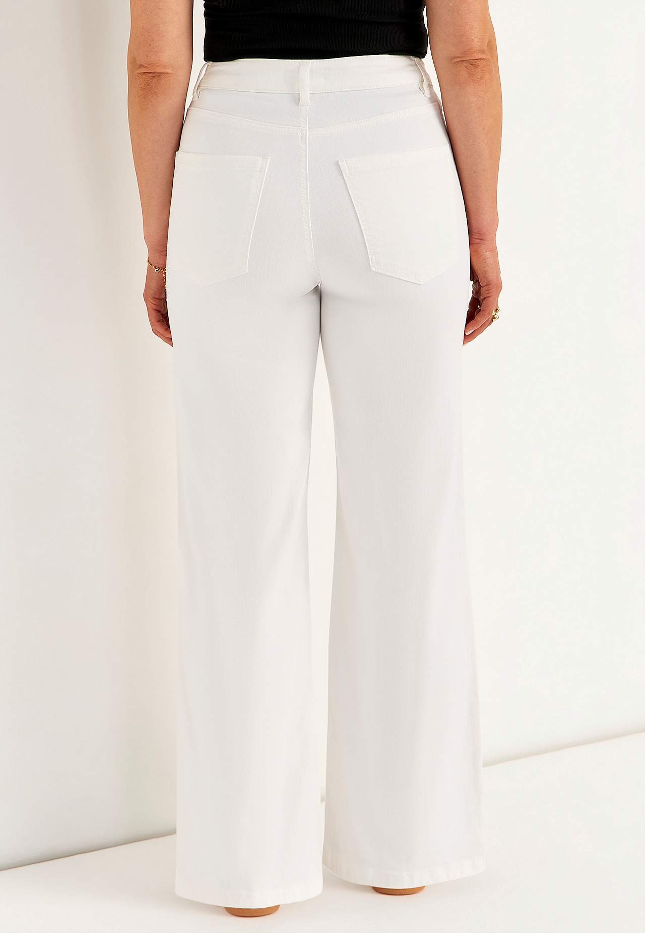5-lomme bukser. Høj talje. Lige design. Brede ben. Lynlås med knap. Linning med bæltestropper. Indvendig benlængde ca. 80 cm i alle størrelser. Skridthøjden følger størrelsen ca. 24-35 cm. Fås også med en indvendig benlængde på 85 cm, se varenr. 700142.