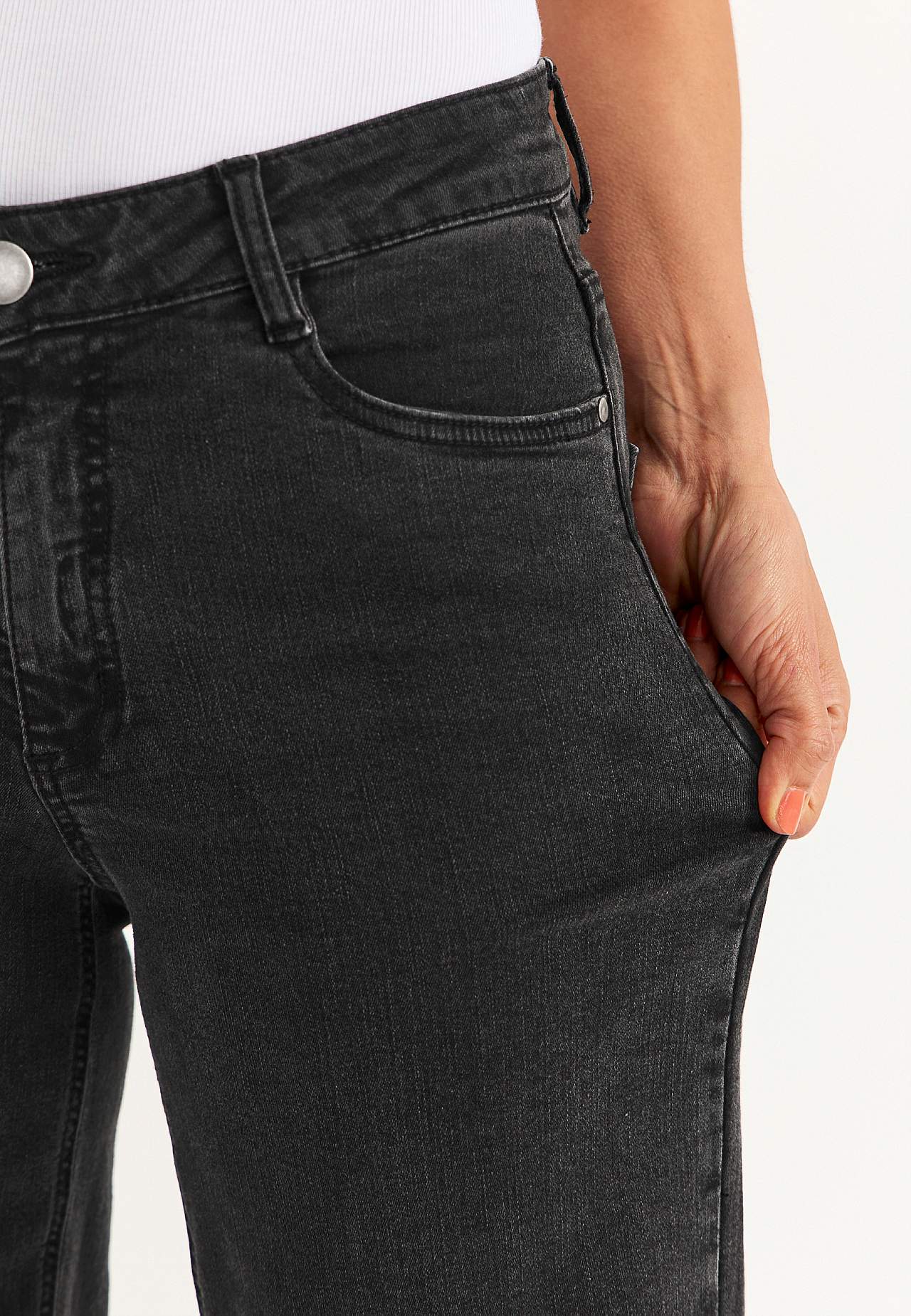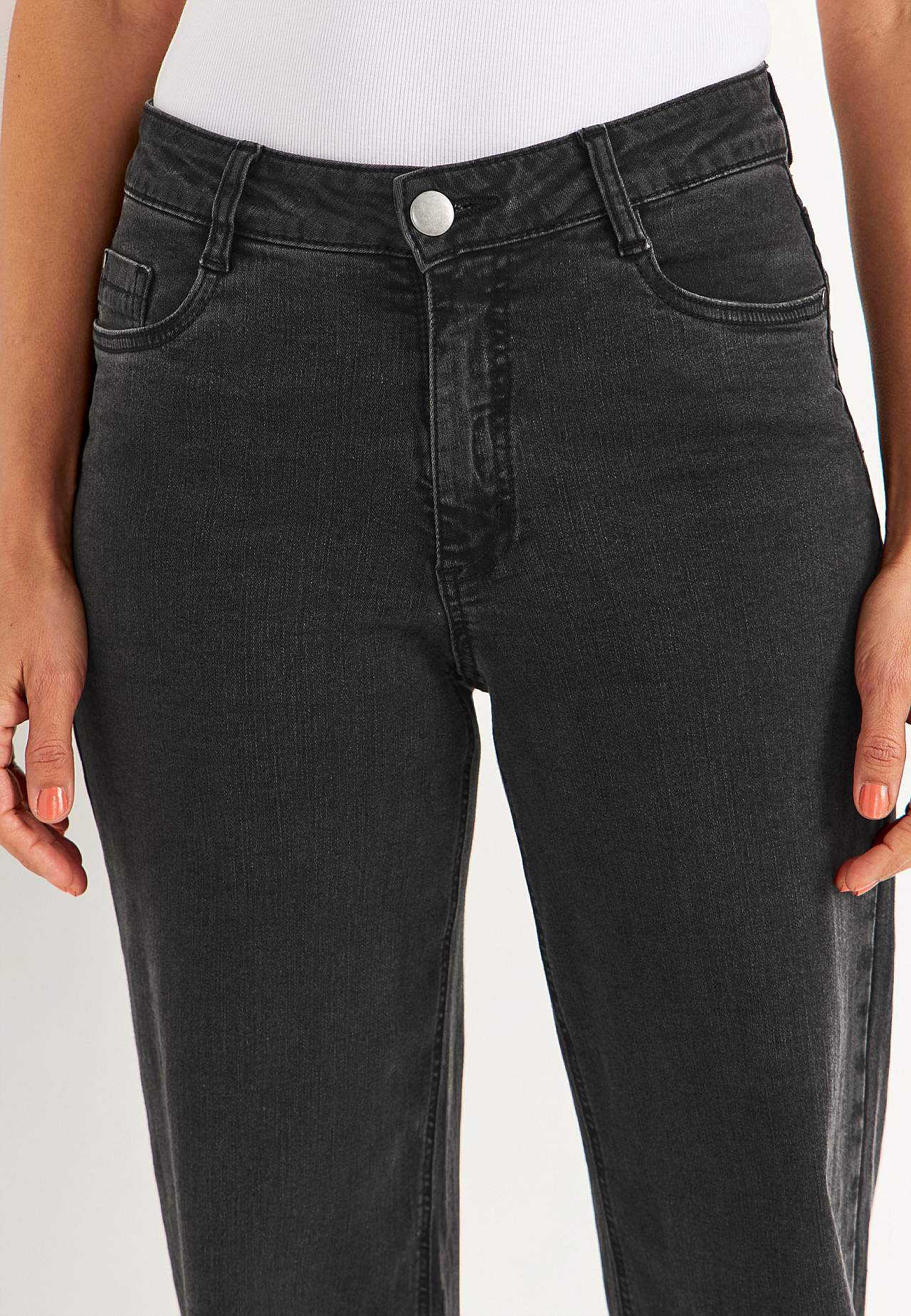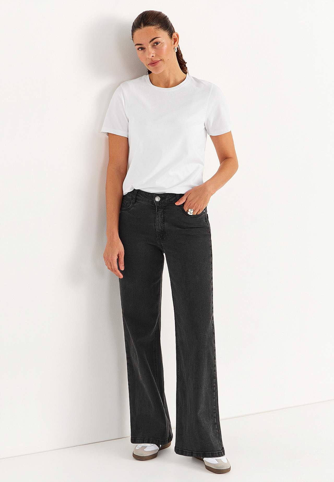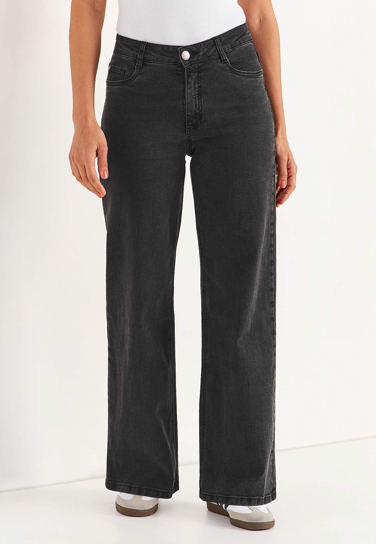 5-lomme bukser. Høj talje. Lige design. Brede ben. Lynlås med knap. Linning med bæltestropper. Indvendig benlængde ca. 80 cm i alle størrelser. Skridthøjden følger størrelsen ca. 24-35 cm. Fås også med en indvendig benlængde på 85 cm, se varenr. 700142.