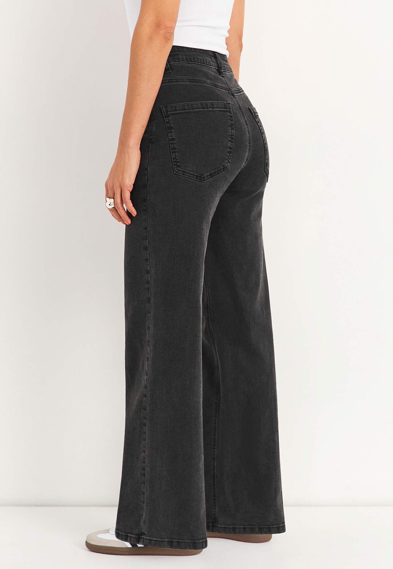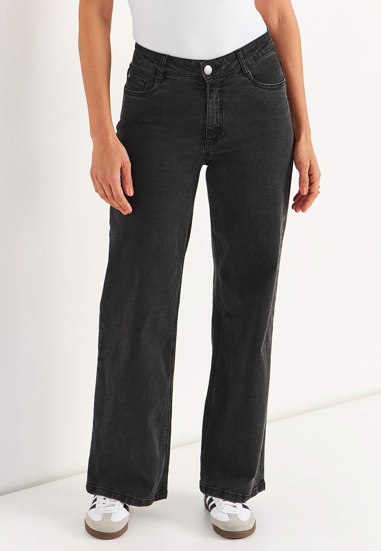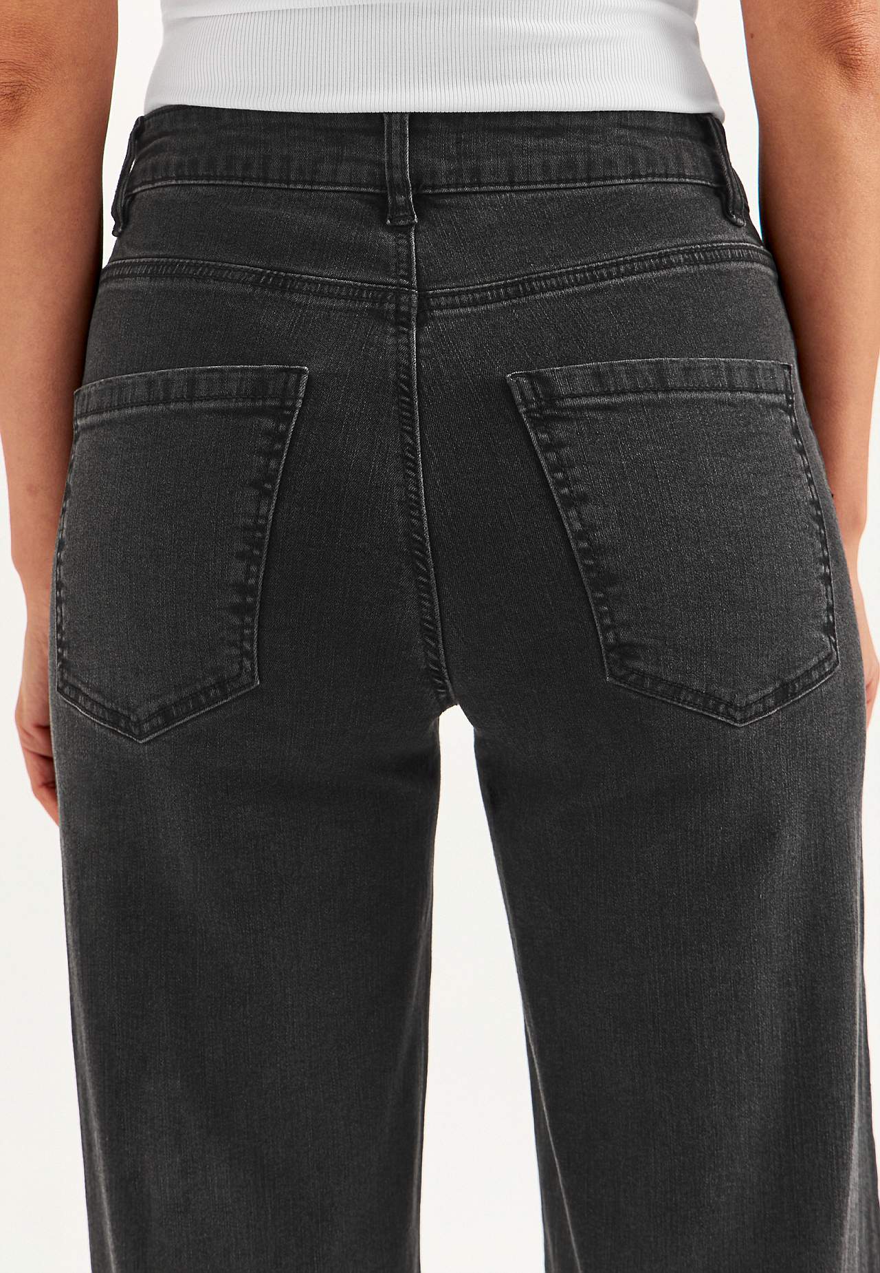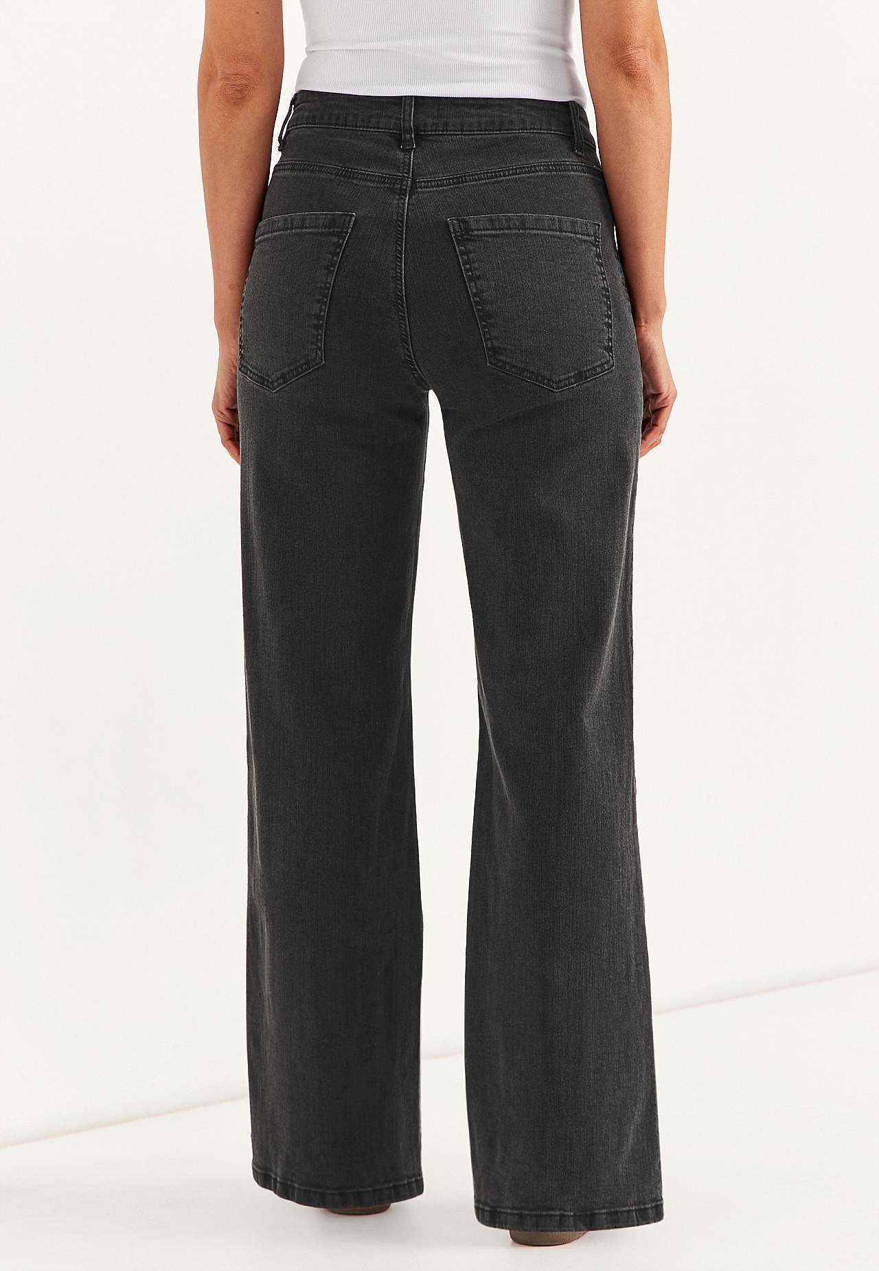 5-lomme bukser. Høj talje. Lige design. Brede ben. Lynlås med knap. Linning med bæltestropper. Indvendig benlængde ca. 80 cm i alle størrelser. Skridthøjden følger størrelsen ca. 24-35 cm. Fås også med en indvendig benlængde på 85 cm, se varenr. 700142.