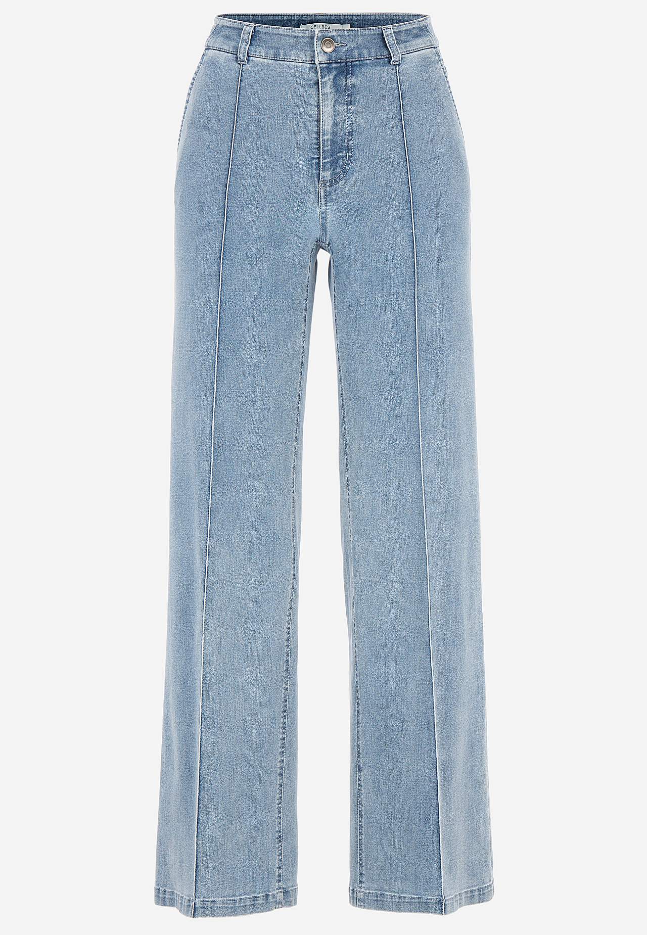 Jeans i elastisk denim. Syede pressefolder foran. Normal talje. Lige design. Brede ben. Linning med bæltestropper. Lynlås med knap. Skrå sidelommer foran. To baglommer. Findes i to længder. To indre benlængder: Normal ca. 80 cm. Lang ca. 85 cm. Skridthøjden følger størrelsen ca. 25-35 cm.
