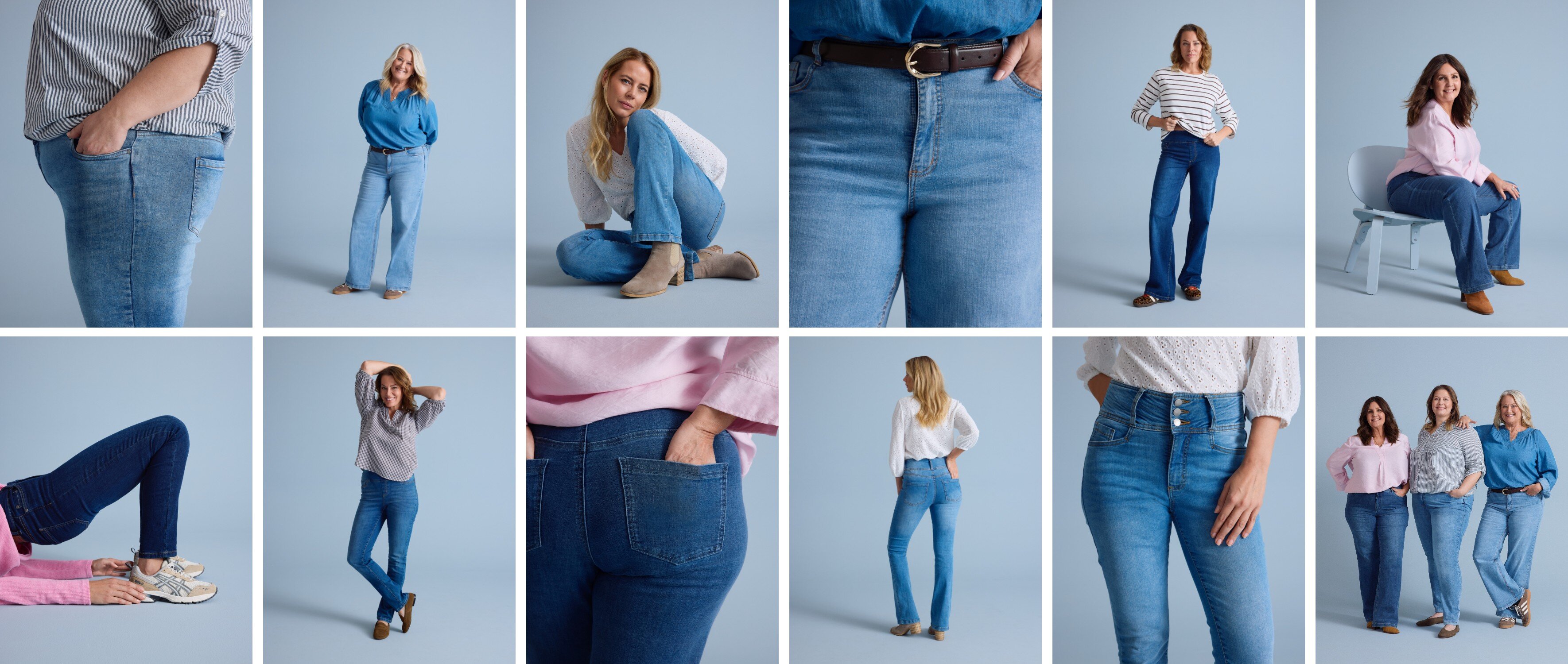 Ja, jeans er virkelig altid på mode, år efter år. Der er få materialer, der er så elskede og konstant tilbagevendende i moden som jeans. Her finder du virkelig velsiddende jeans til kvinder. De fleste af vores jeans er lavet af behageligt stretchmateriale, hvilket gør dem virkelig behagelige at have på. De tilpasser sig din krop og dine bevægelser, og du kan have dem på hele dagen uden at føle dig stiv eller ubehagelig. De er designet til at passe alle former og fås i størrelserne 34-64.