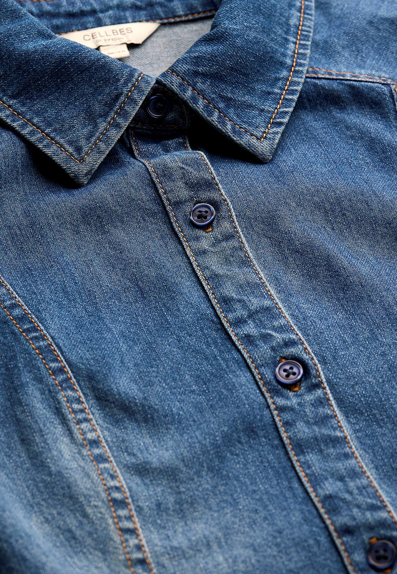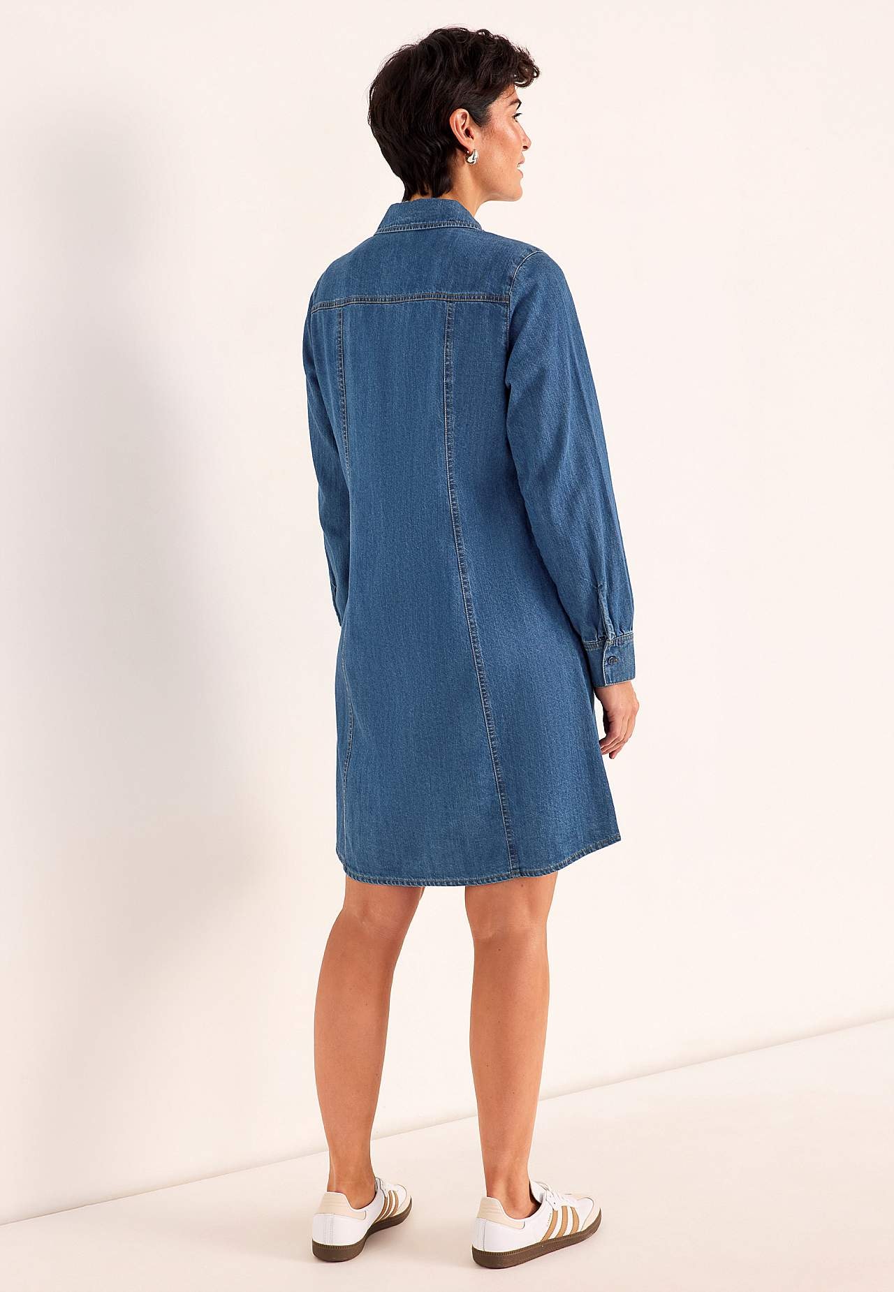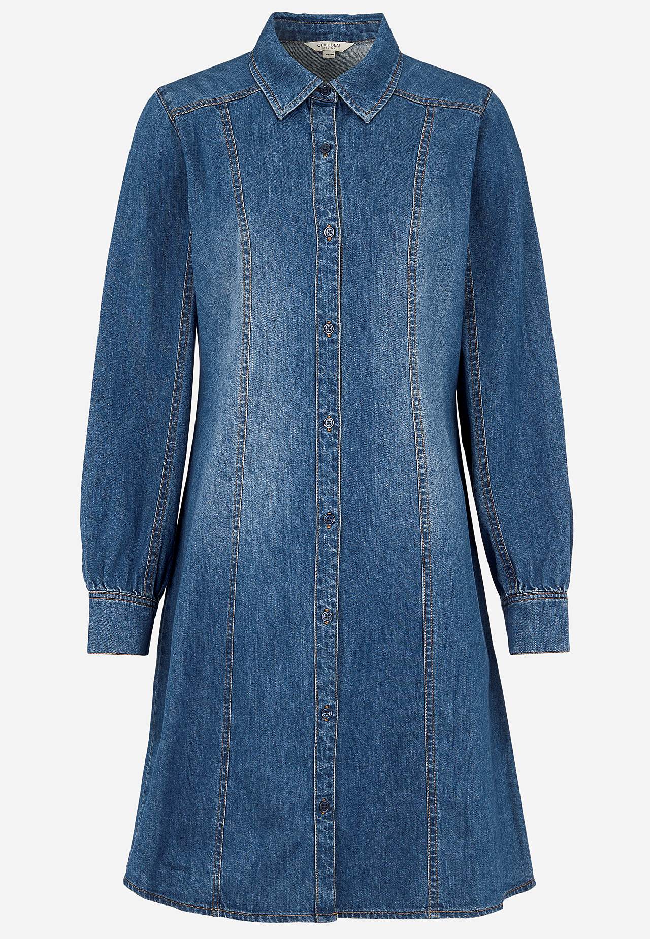 Cowboykjole i blød, lidt kraftigere, smidig denim. Normal pasform. Gennemknappet model med klassisk krave. Lange ærmer med manchet og knap ved manchetterne. Flatterende dekorative sting foran og bagpå. Bærestykke bagpå. Afrundet, lidt længere bagtil søm. Længden følger størrelsen, ca. 96-110 cm fra skulderen.