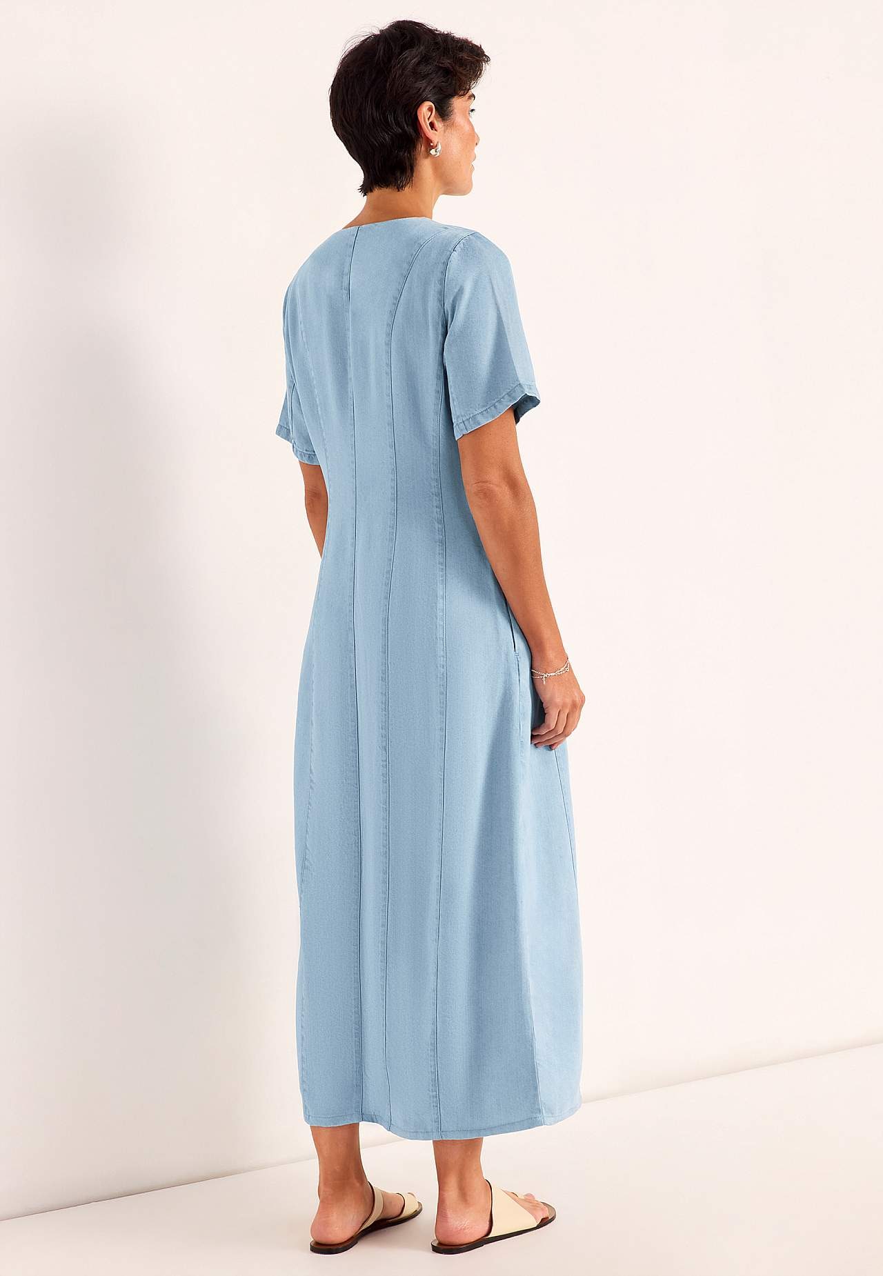 Kjole i denim med en blød, fantastisk behagelig lyocell. Jævnt materiale med dejligt fald. Normal pasform. Flatterende detaljesømme foran og bagpå for en flot form. V-udskåret halsudskæring og trykknapper. Praktiske lommer i siderne. Korte, brede ærmer. Lige søm. For at tøjet skal genvinde sin bløde fornemmelse, anbefales ... Læs mere