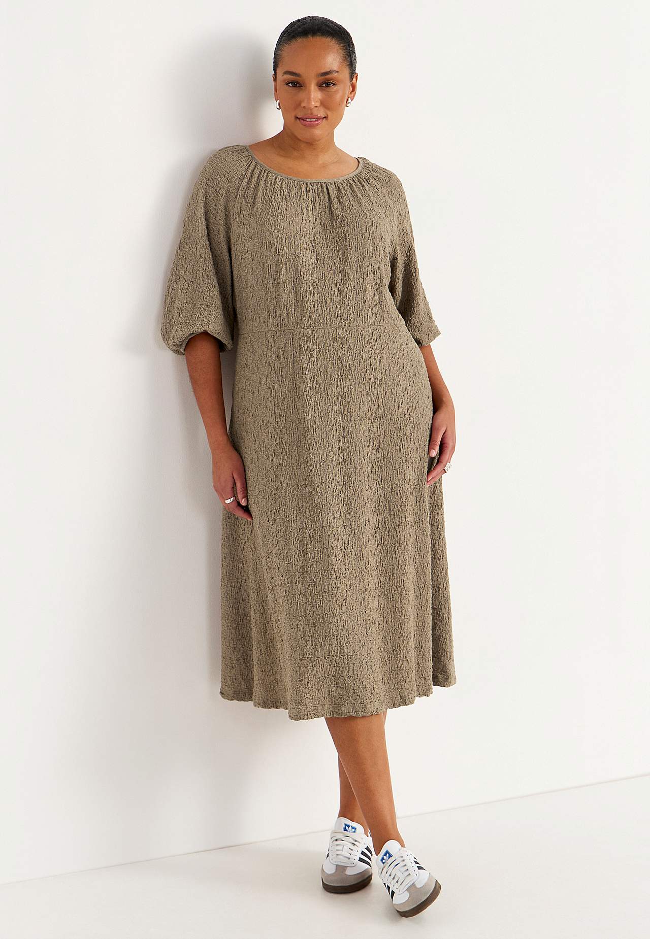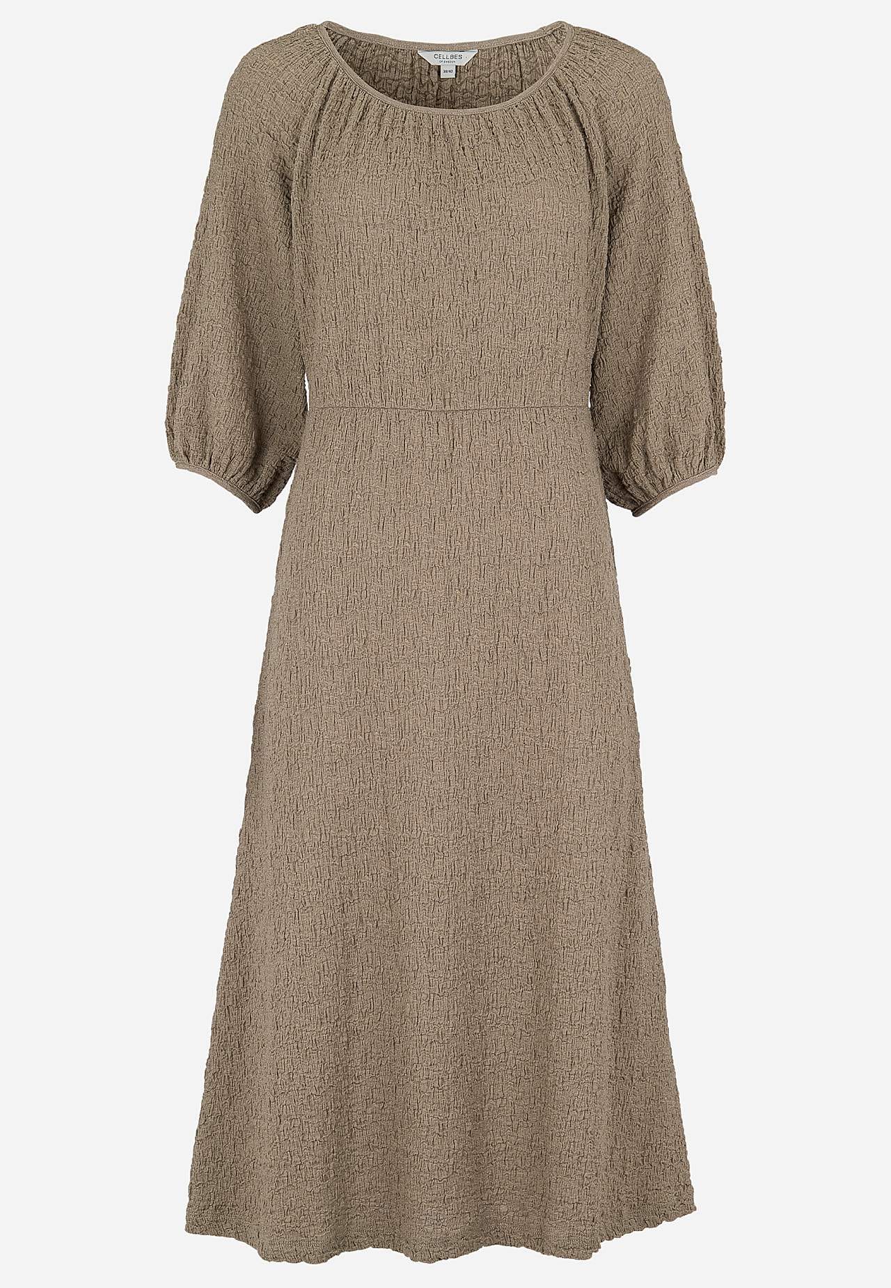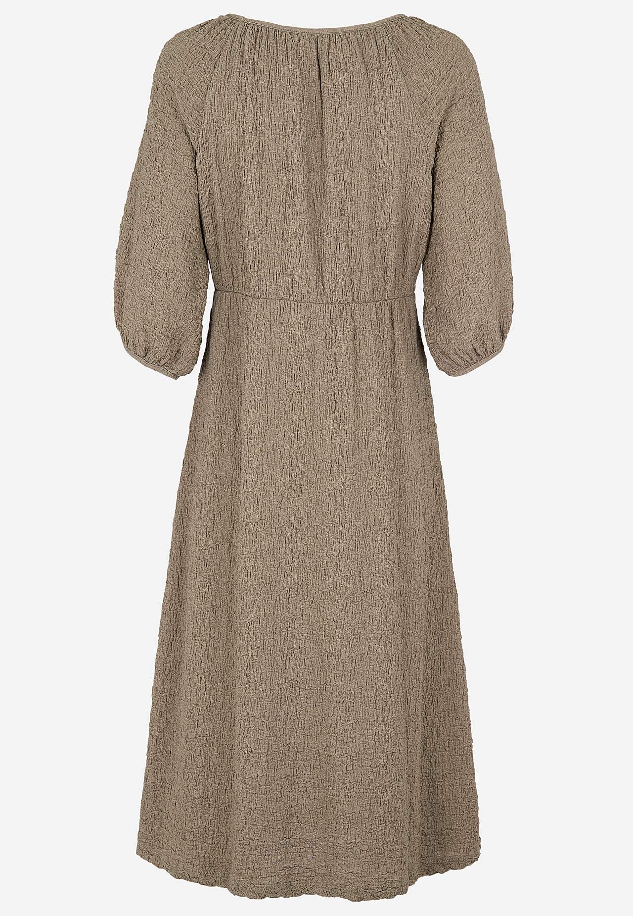 Kjole i komfortabel, elastisk bomuldsblanding med struktur. Normal pasform. Let figursyet foroven med mere vidde i skørtet. Rund, bred halsudskæring med samling hele vejen rundt. 3/4 lange, brede raglanærmer med samling og tyndt kantbånd på ærmeafslutningerne. Søm ved taljen med skjult elastiksøm og samling bagpå. Lige søm.... Læs mere