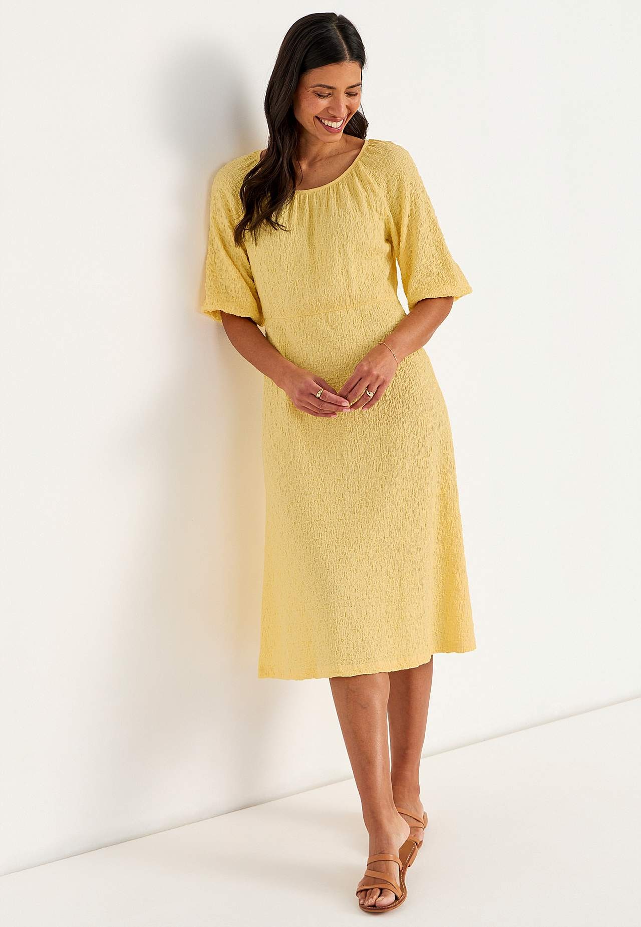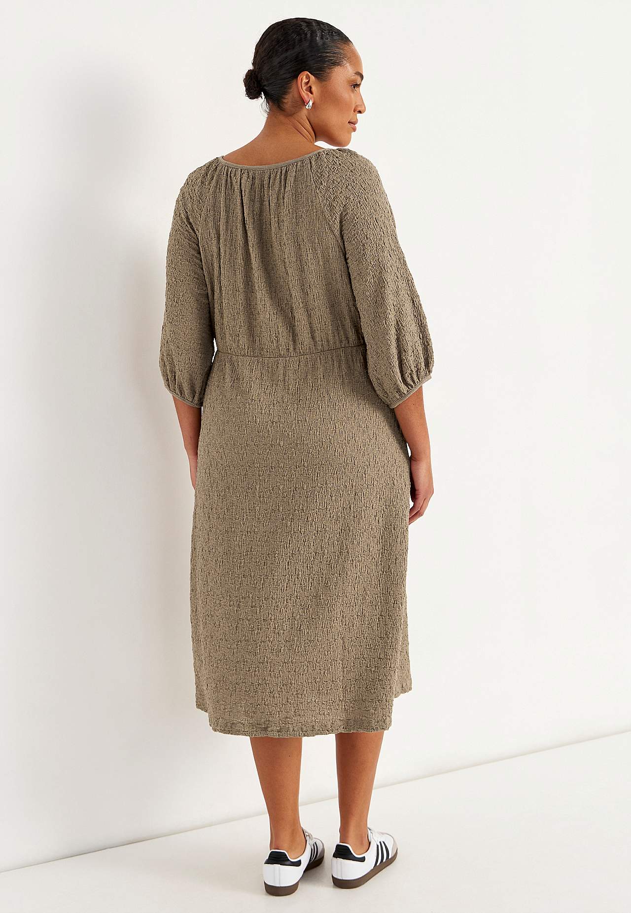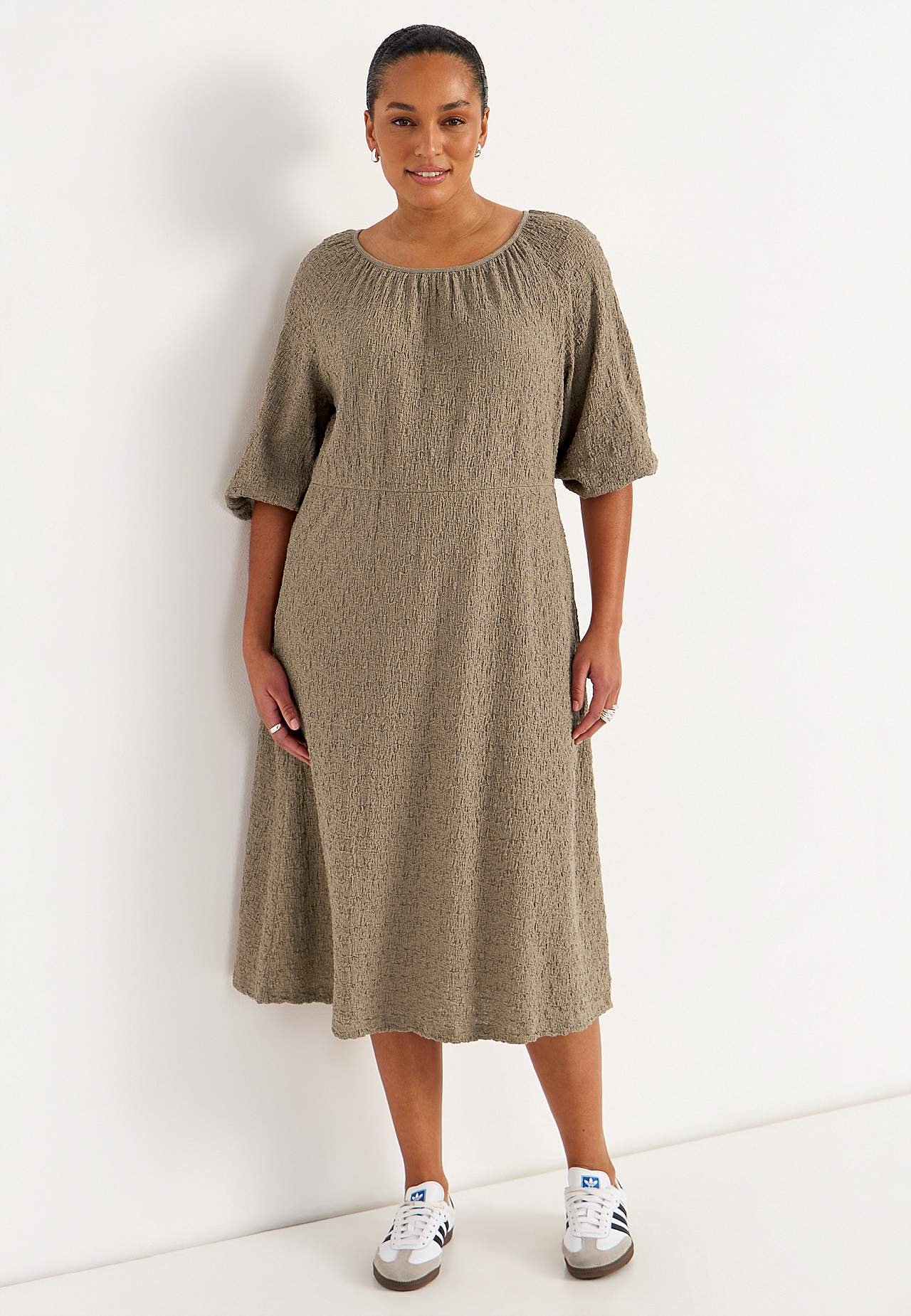 Kjole i komfortabel, elastisk bomuldsblanding med struktur. Normal pasform. Let figursyet foroven med mere vidde i skørtet. Rund, bred halsudskæring med samling hele vejen rundt. 3/4 lange, brede raglanærmer med samling og tyndt kantbånd på ærmeafslutningerne. Søm ved taljen med skjult elastiksøm og samling bagpå. Lige søm.... Læs mere