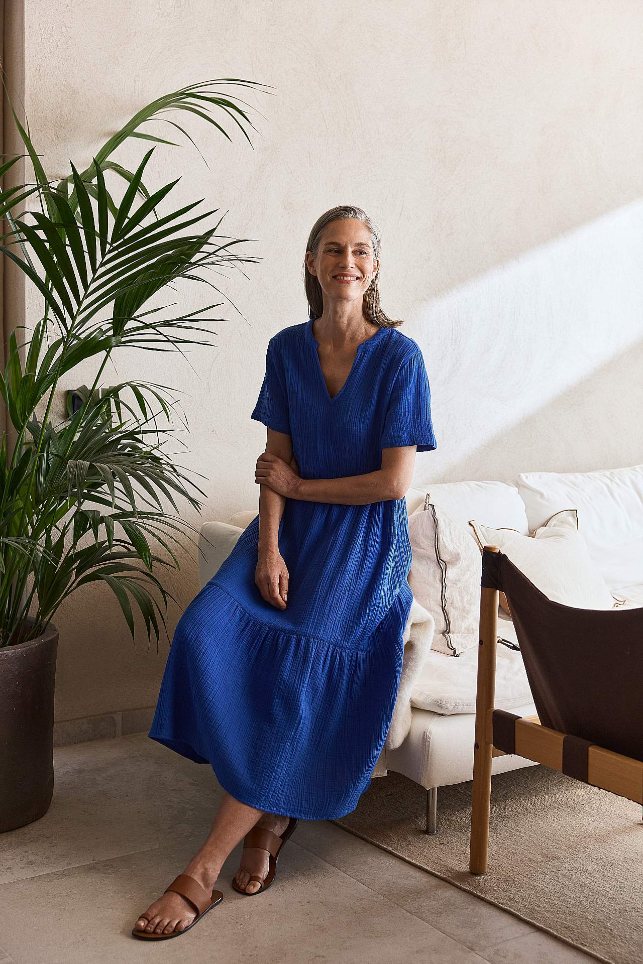 Flæsekjole i herligt bomuldsmusselin med naturlig struktur. Vævet, blødt materiale med luftig, kølende følelse. Rummelig pasform med vidde nederst. Rund halsudskæring med lille v-udskæring. Korte ærmer. Søm ved taljen. Volant nederst. Lige søm. Ryglængden følger størrelsen, ca. 125 cm.