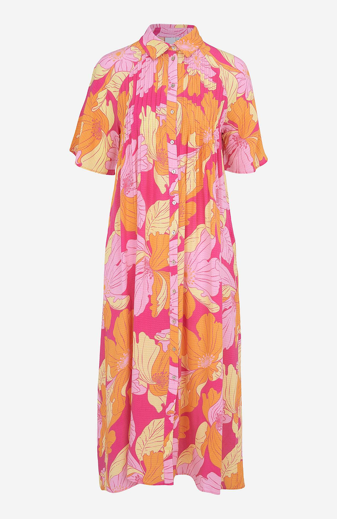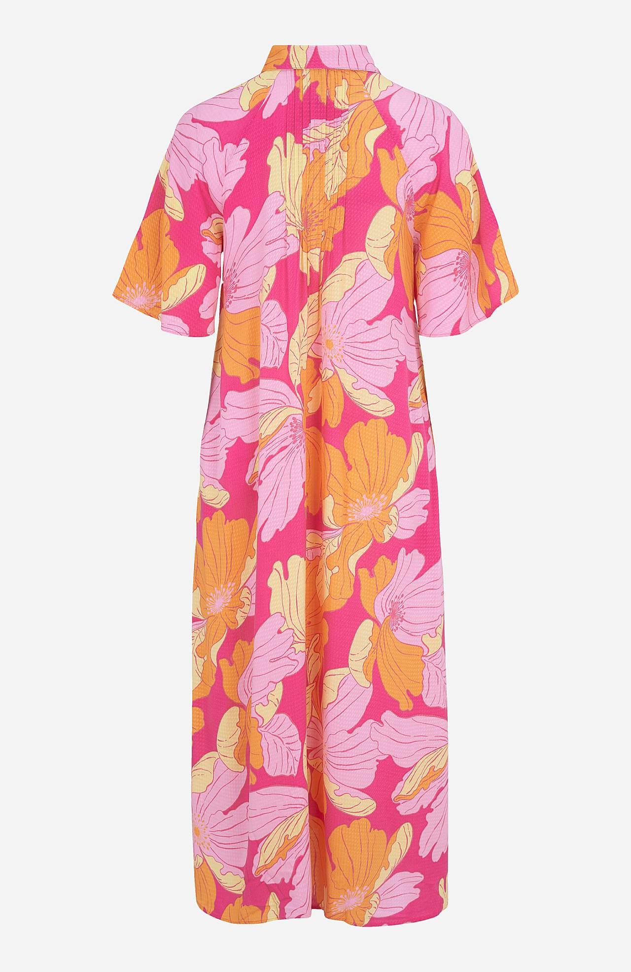 Lige, gennemknappet model med skjorte krave. Blødt, smidigt, vævet materiale med struktur. Dekorativ fold både foran og bagpå. Korte ærmer med smuk vidde. Sidelommer. Længde fra skulder ca. 126 cm i størrelse S (36).
