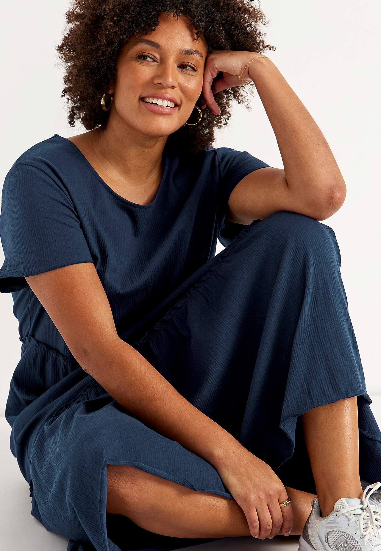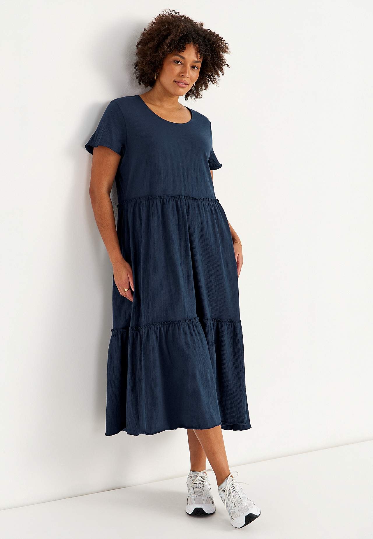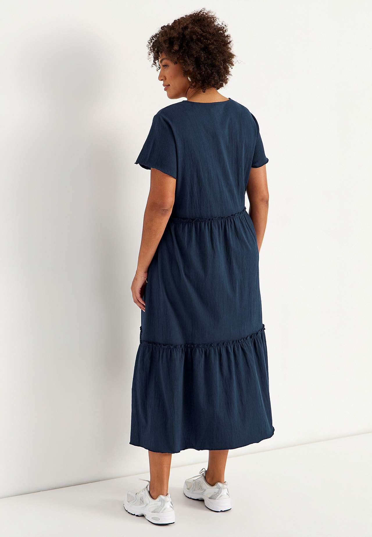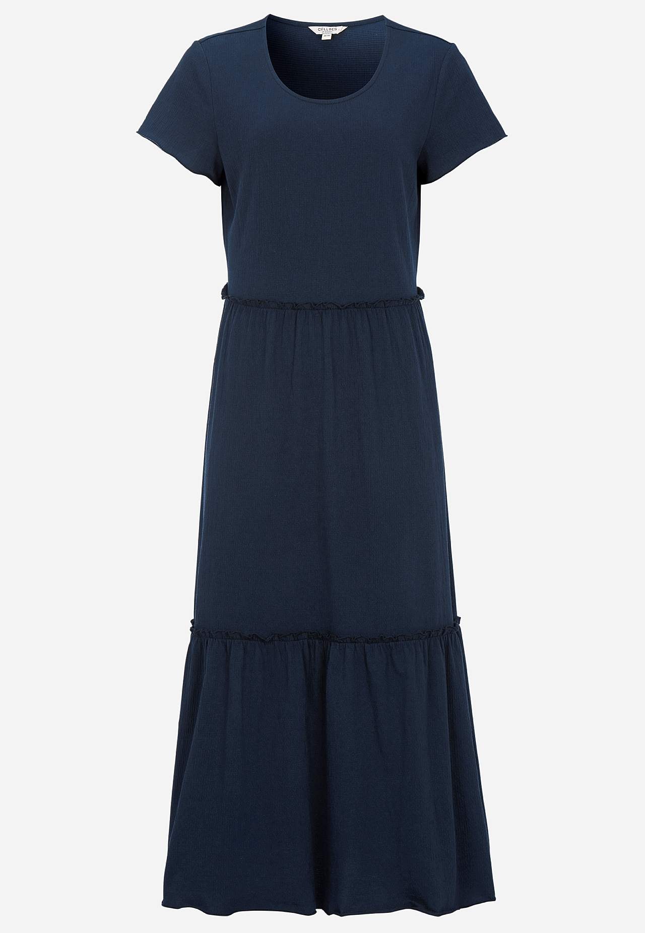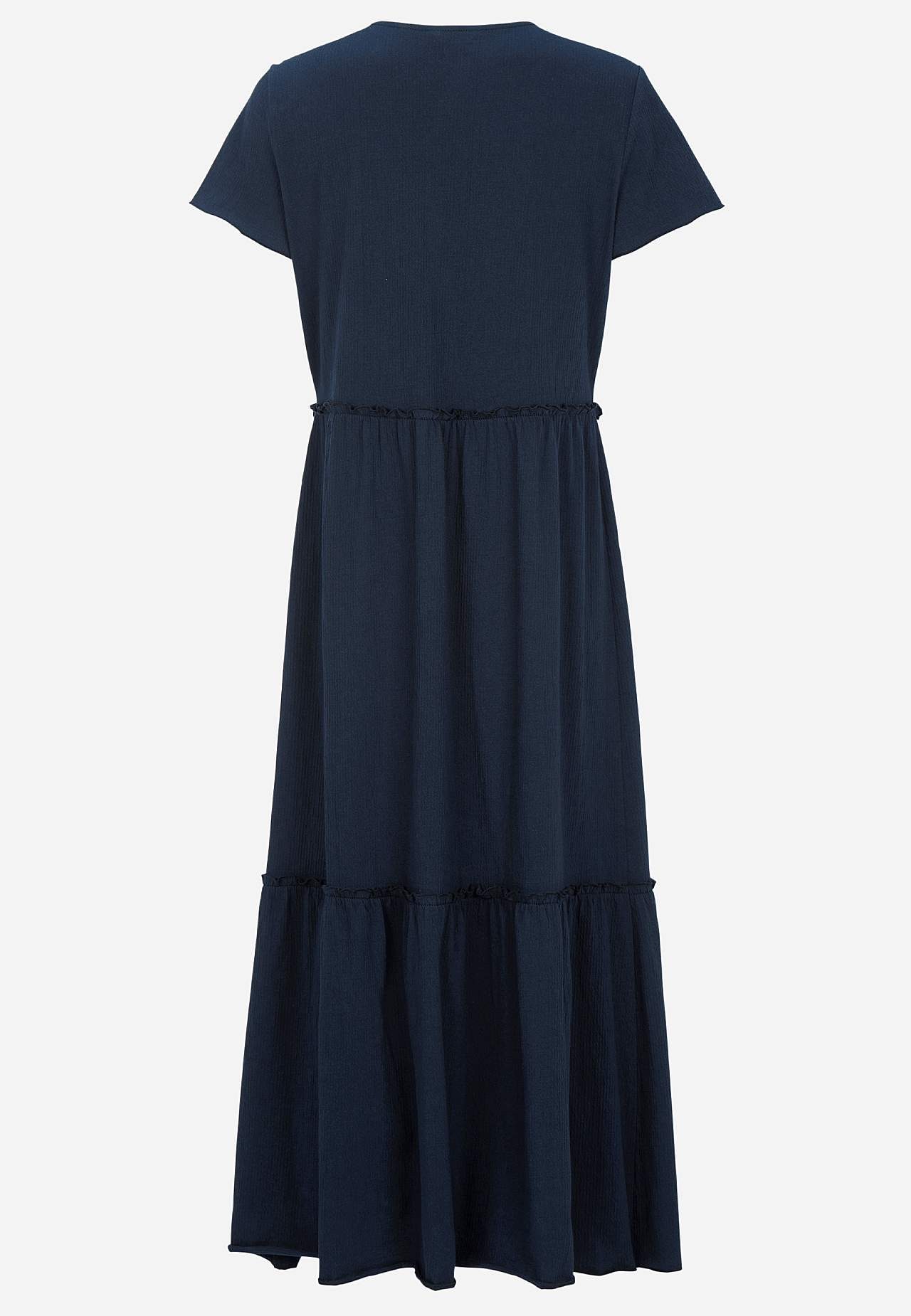 Elastisk, blød flæsekjole med bølget struktur. Uformel, a-linjeformet pasform. Skørtdel med herlig vidde. Overlocket, bølget, tynd søm nederst, i kanten af flæsen og ved manchetterne. Afrundet halsudskæring. Korte korte ærmer. Let afrundet søm. Ryglængden er ca. 128 cm i alle størrelser.