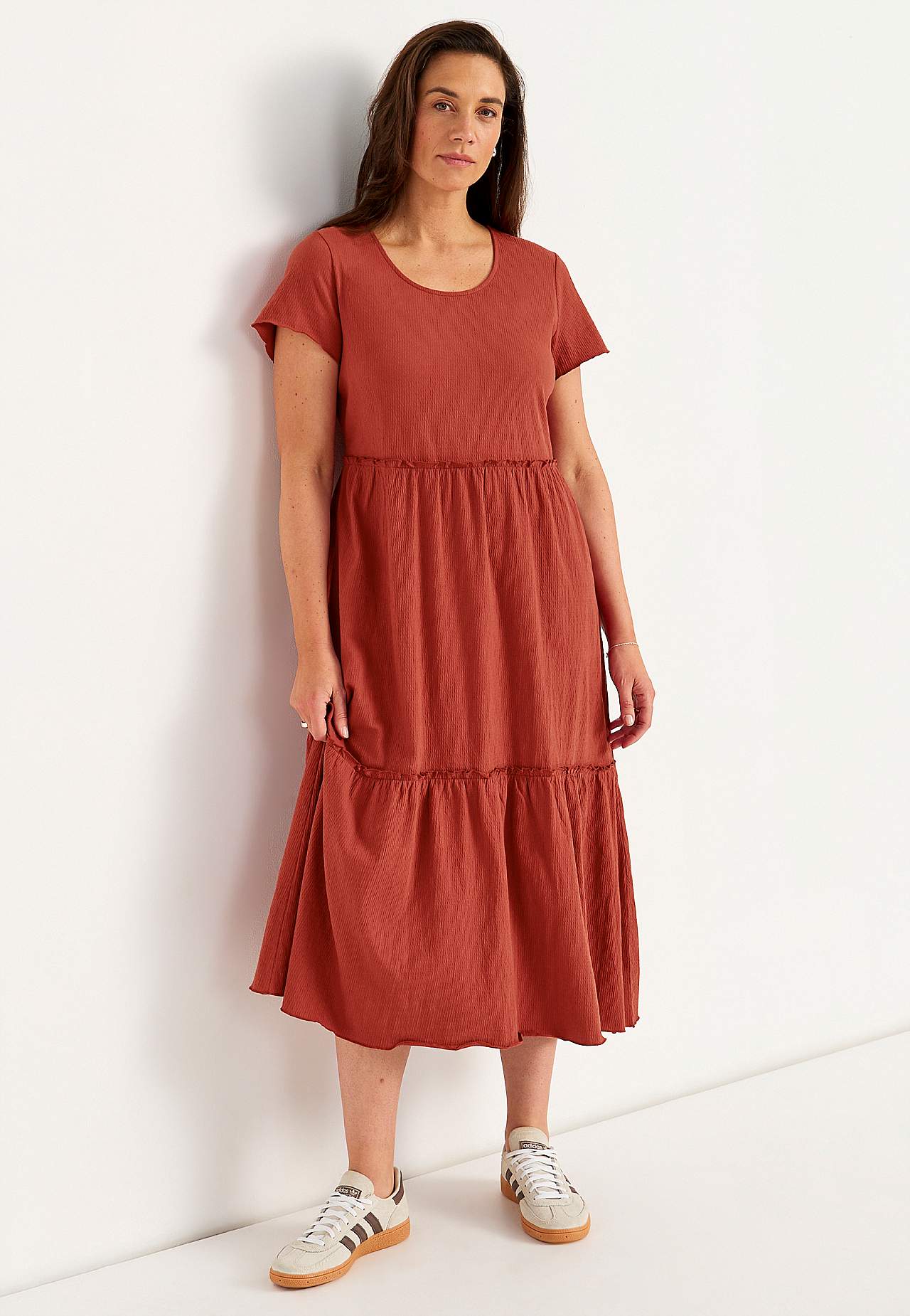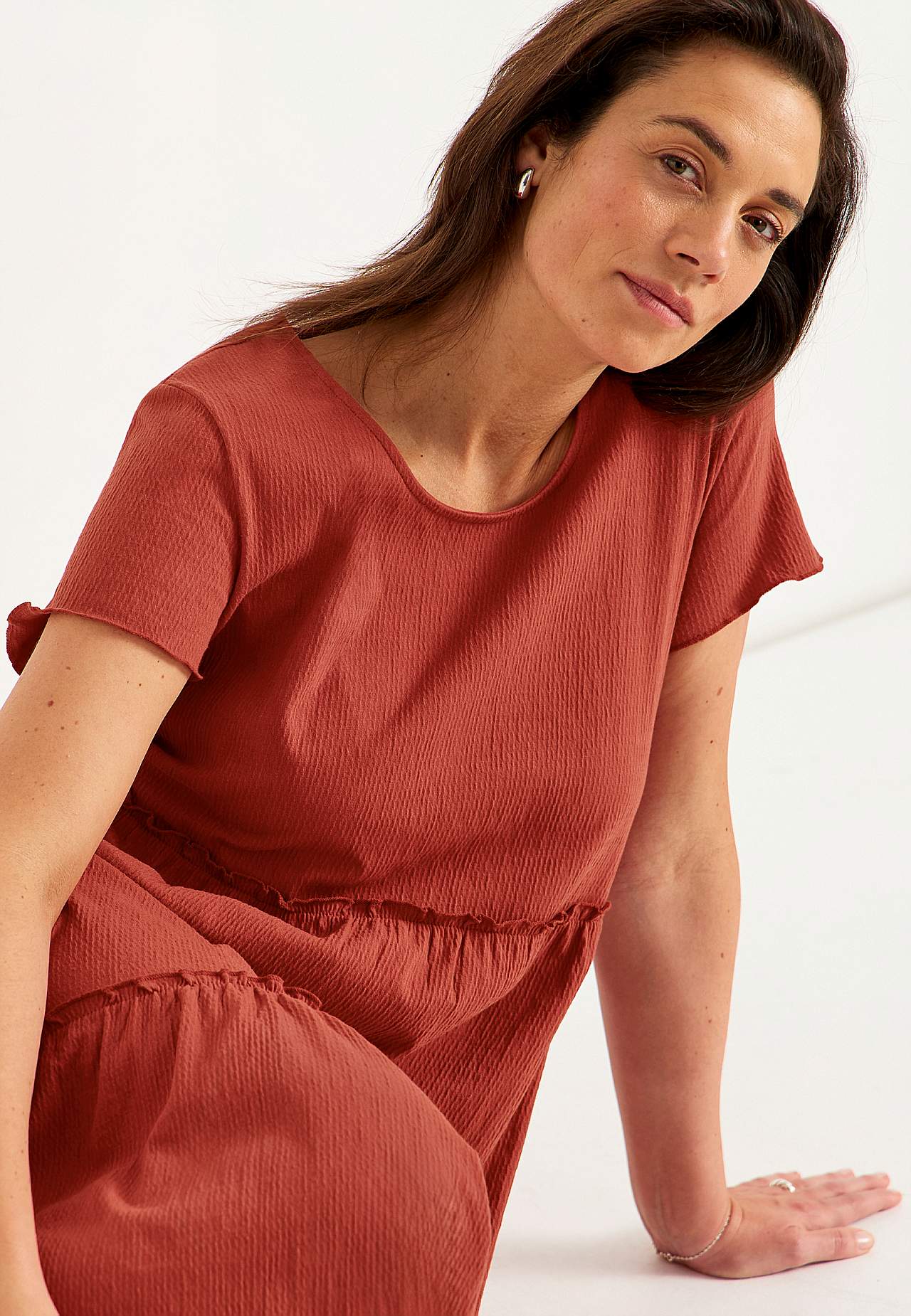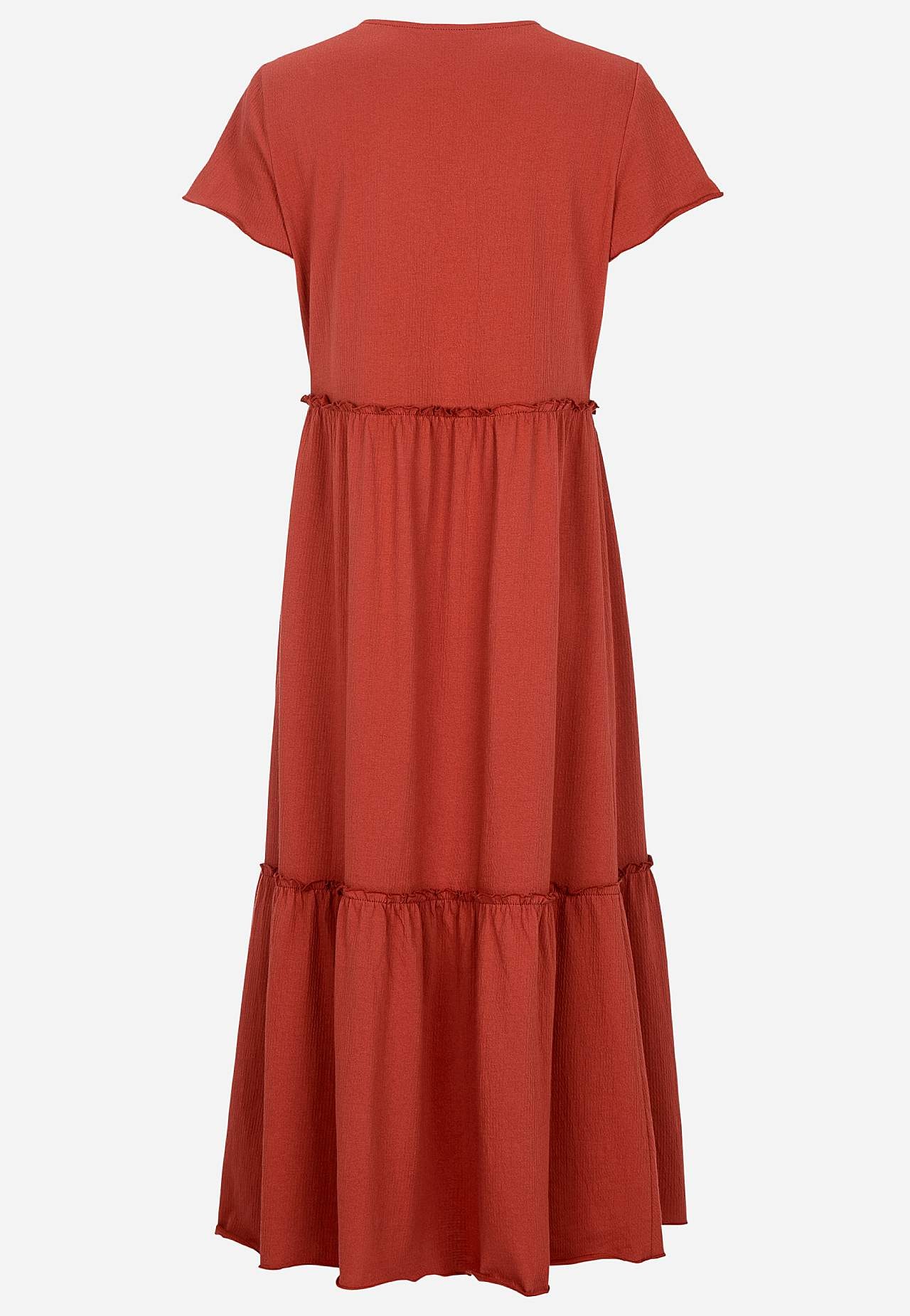 Elastisk, blød flæsekjole med bølget struktur. Uformel, a-linjeformet pasform. Skørtdel med herlig vidde. Overlocket, bølget, tynd søm nederst, i kanten af flæsen og ved manchetterne. Afrundet halsudskæring. Korte korte ærmer. Let afrundet søm. Ryglængden er ca. 128 cm i alle størrelser.