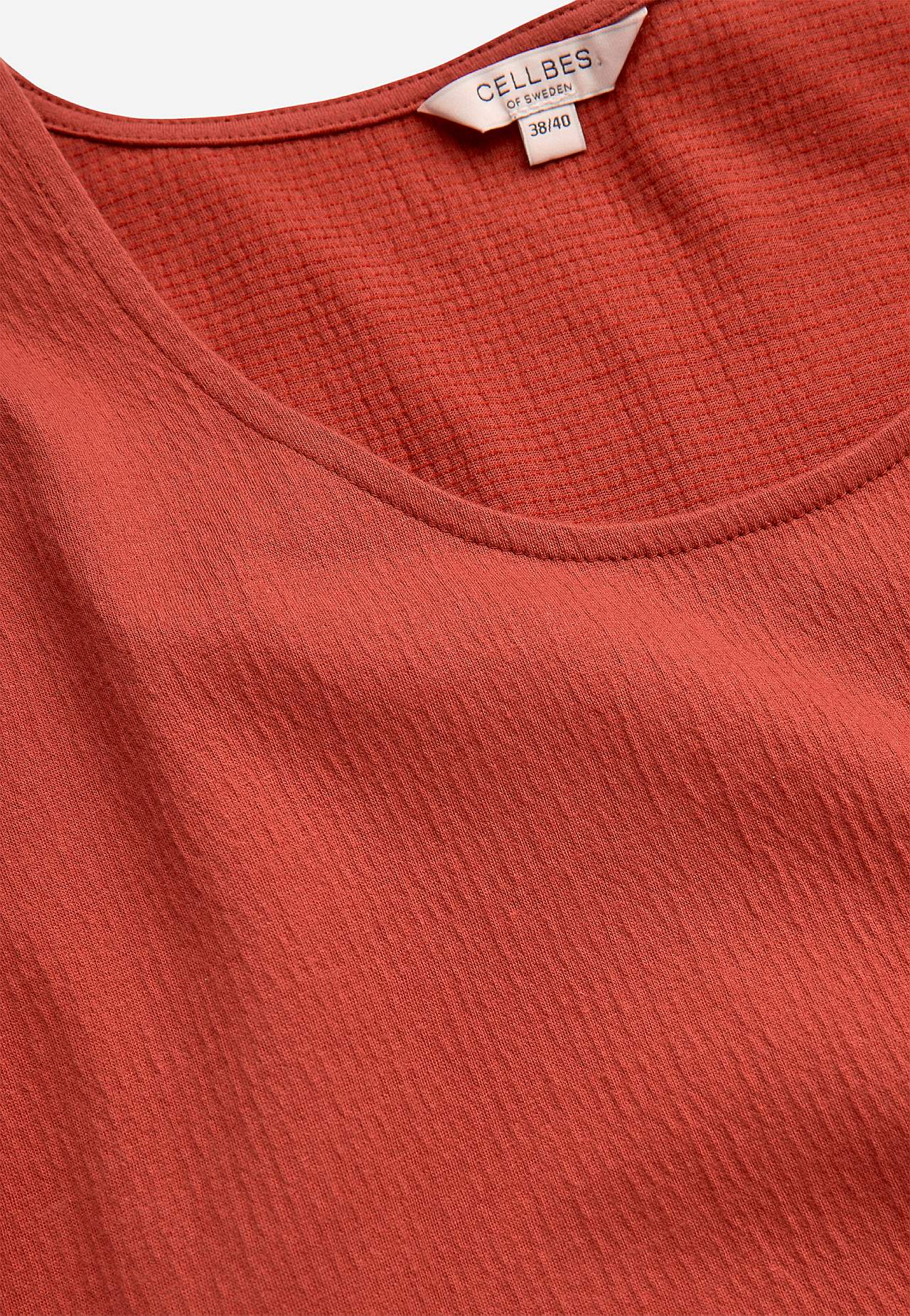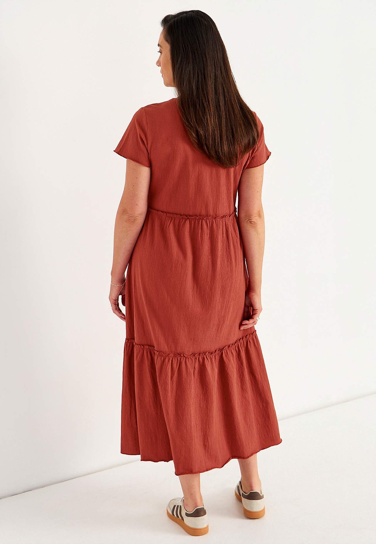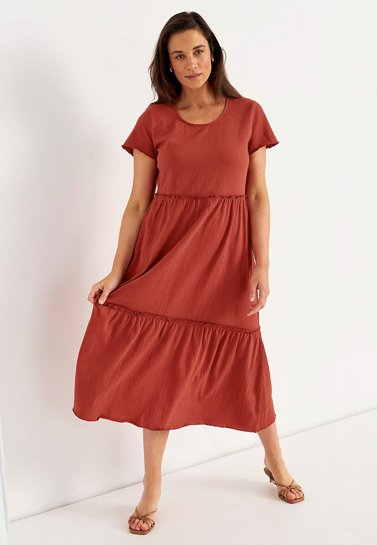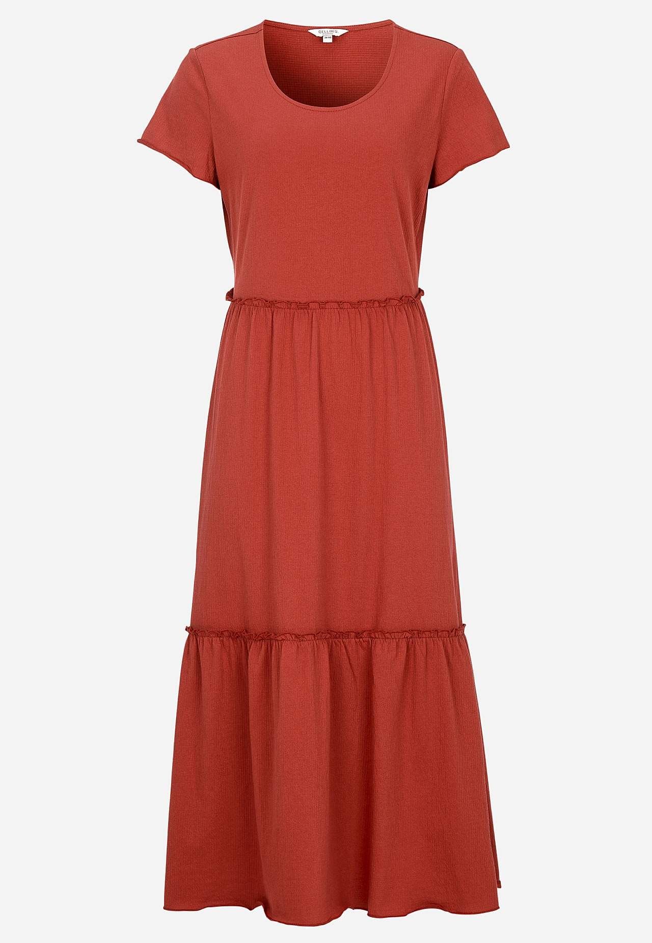 Elastisk, blød flæsekjole med bølget struktur. Uformel, a-linjeformet pasform. Skørtdel med herlig vidde. Overlocket, bølget, tynd søm nederst, i kanten af flæsen og ved manchetterne. Afrundet halsudskæring. Korte korte ærmer. Let afrundet søm. Ryglængden er ca. 128 cm i alle størrelser.