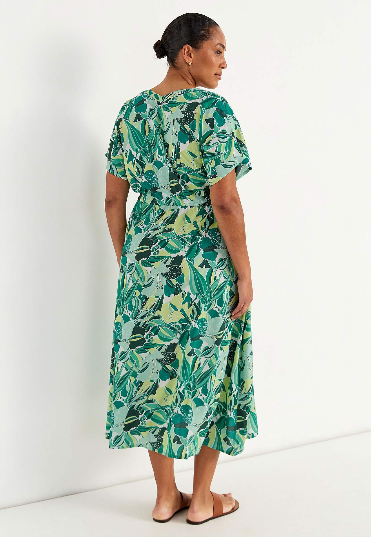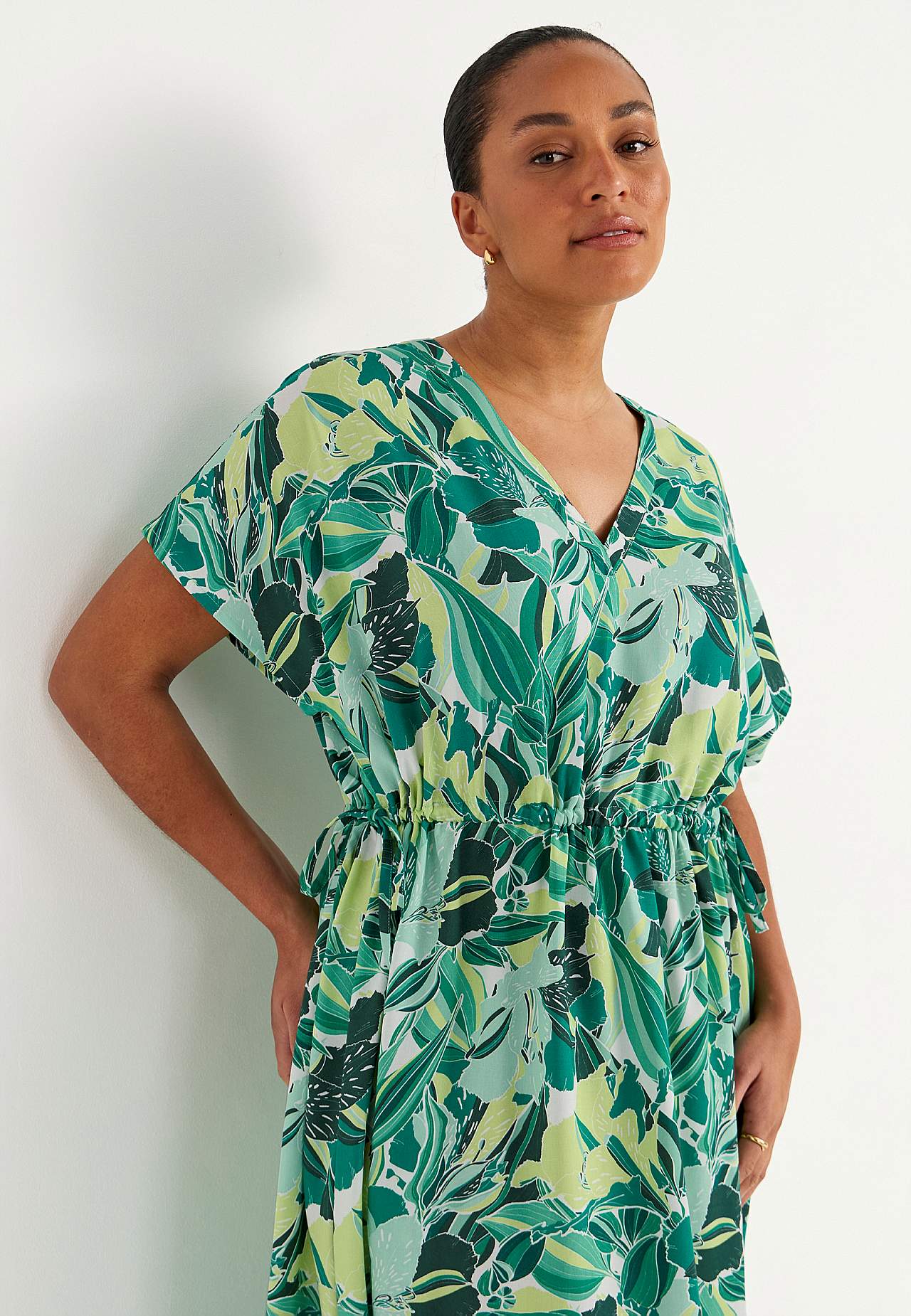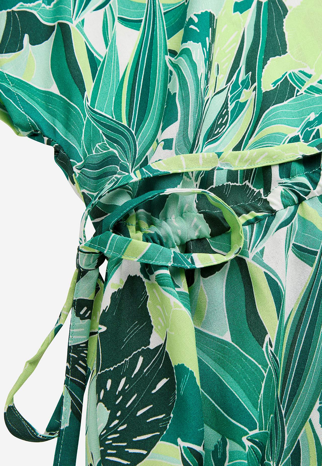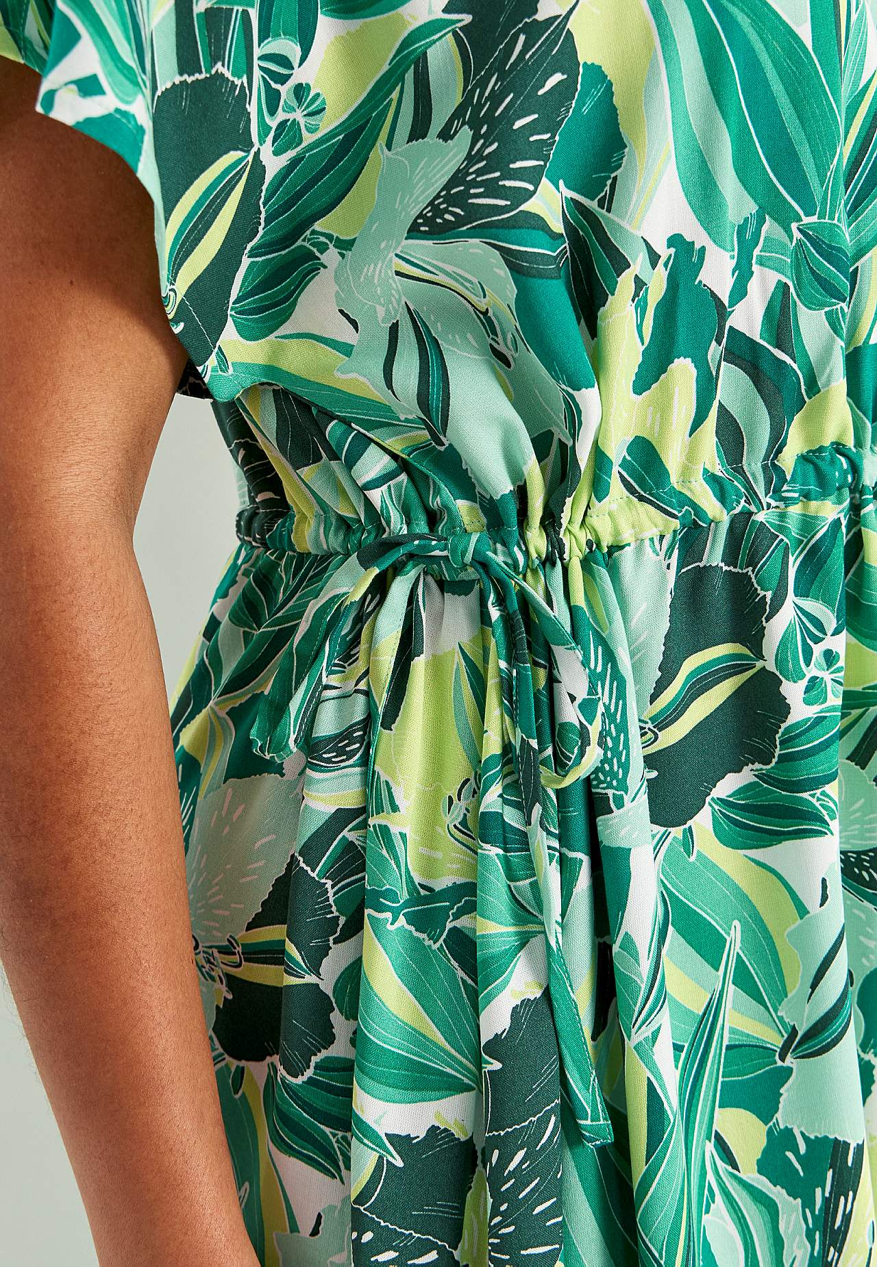 Luftigt, kølende materiale med mat overflade. Uformel, løs pasform. Brede korte ærmer. Skjulte bindebånd i taljen. Kan nemt justeres og bindes i begge sider. Vælg selv, en løs eller mere stram pasform. Let afrundet søm. Ryglængden følger størrelsen, ca. 128 cm.