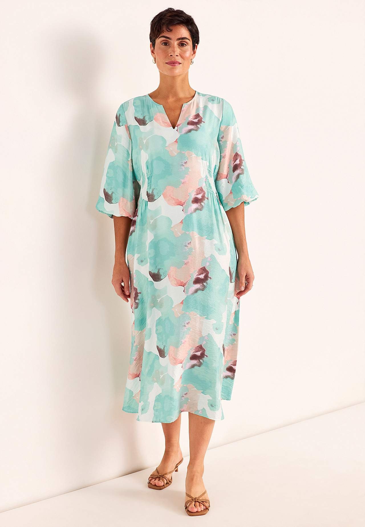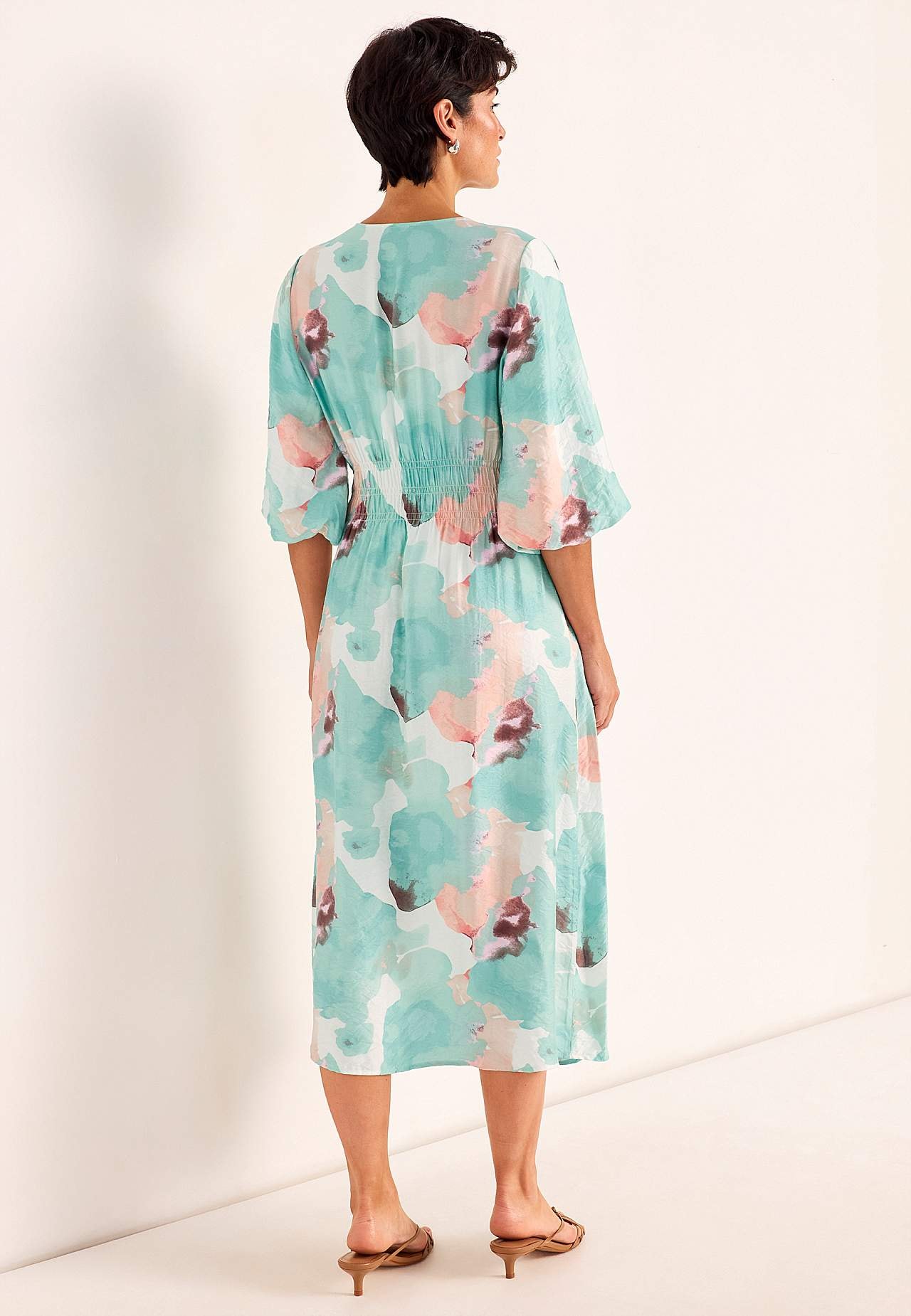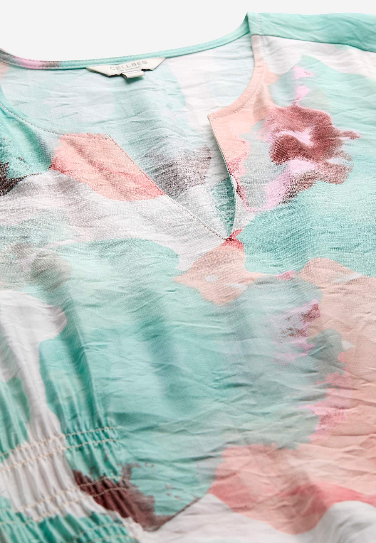 Festkjole i viskose med dejligt fald og kølende følelse. Lidt blankt strukturvævet stof. Flatterende pasform med let figurformet talje. Afrundet halsudskæring med v-udskæring foran. Rynkeeffekt bag på taljen og i siderne. Let afrundet søm. Ryglængden følger størrelsen, ca. 126 cm.