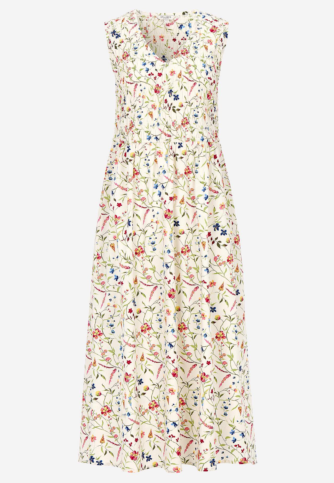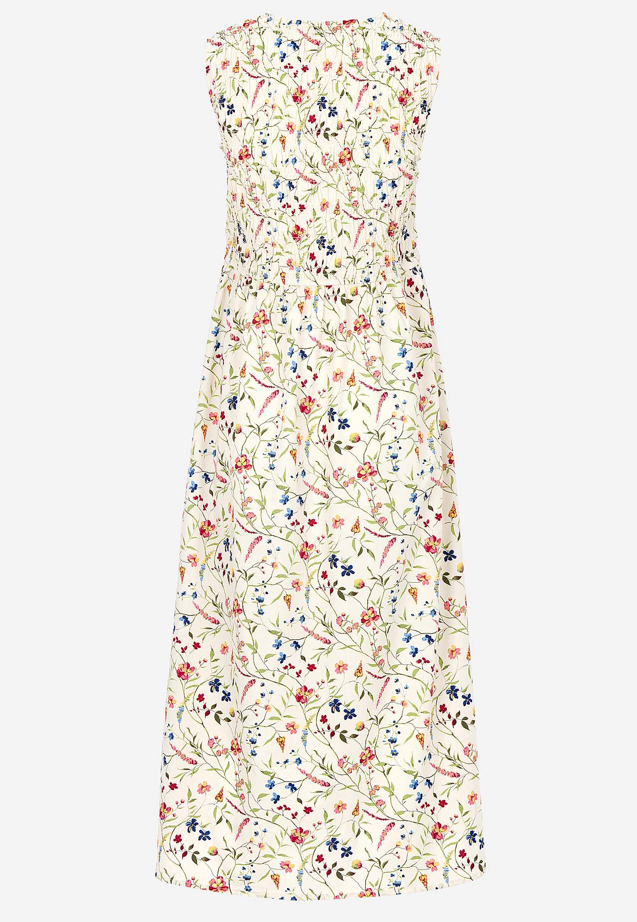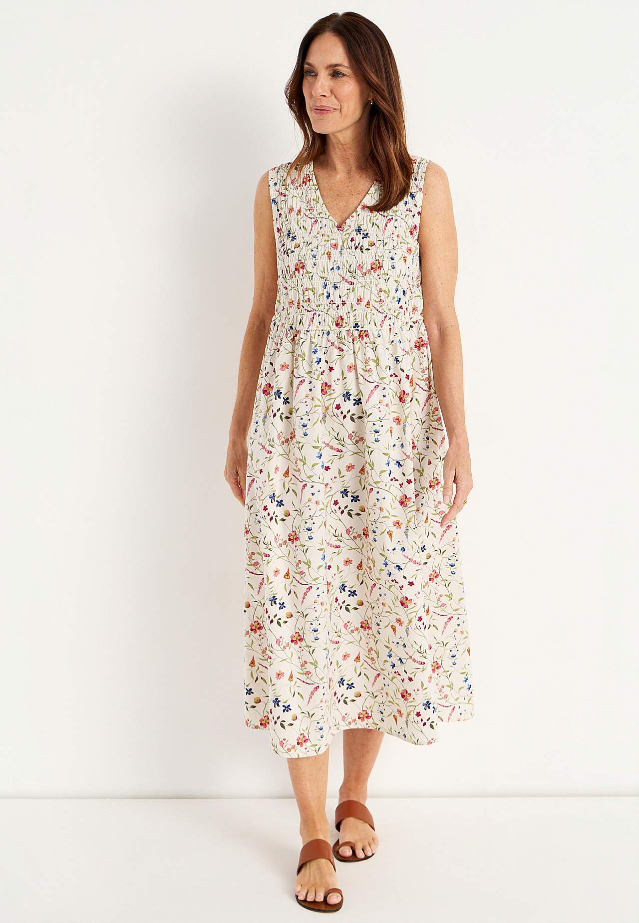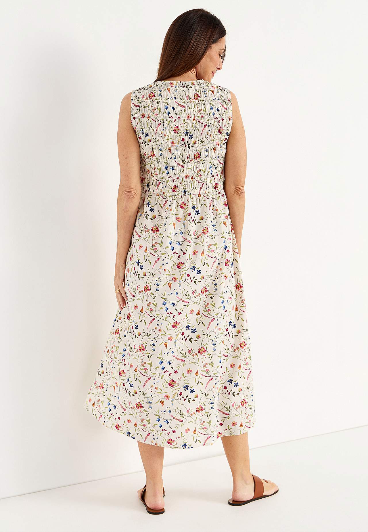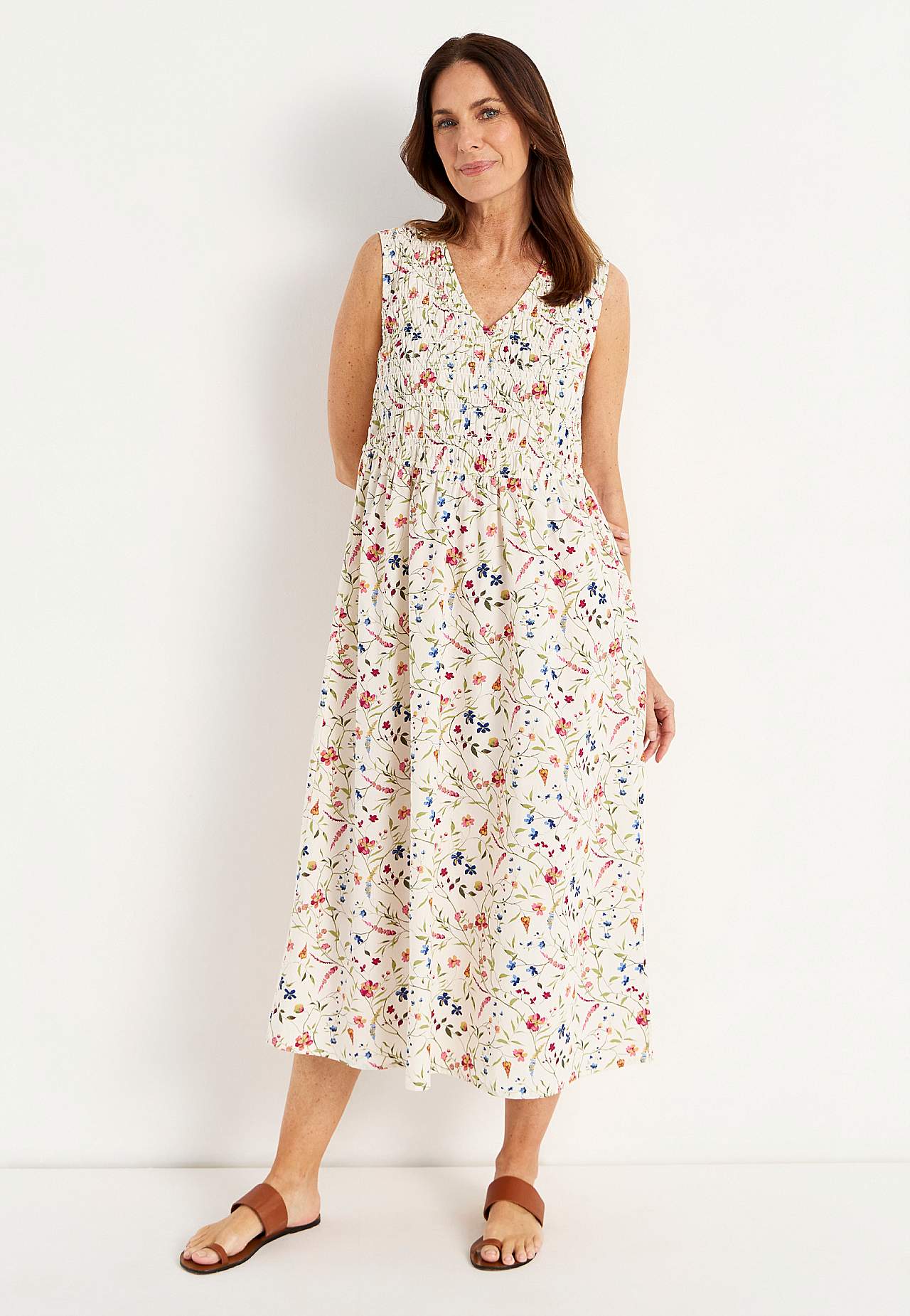 Smockkjole til sommerens fester. Nem at style stilfuldt med sandaler og smykker, eller kan bruges mere afslappet med flip-flops på en varm sommerdag. Herlig, ærmeløs kjole med smock på toppen. Blød, kølende poplin med glat overflade og let, stabil følelse. Smocket øvre del med fleksibel, flatterende pasform og uformel vid... Læs mere