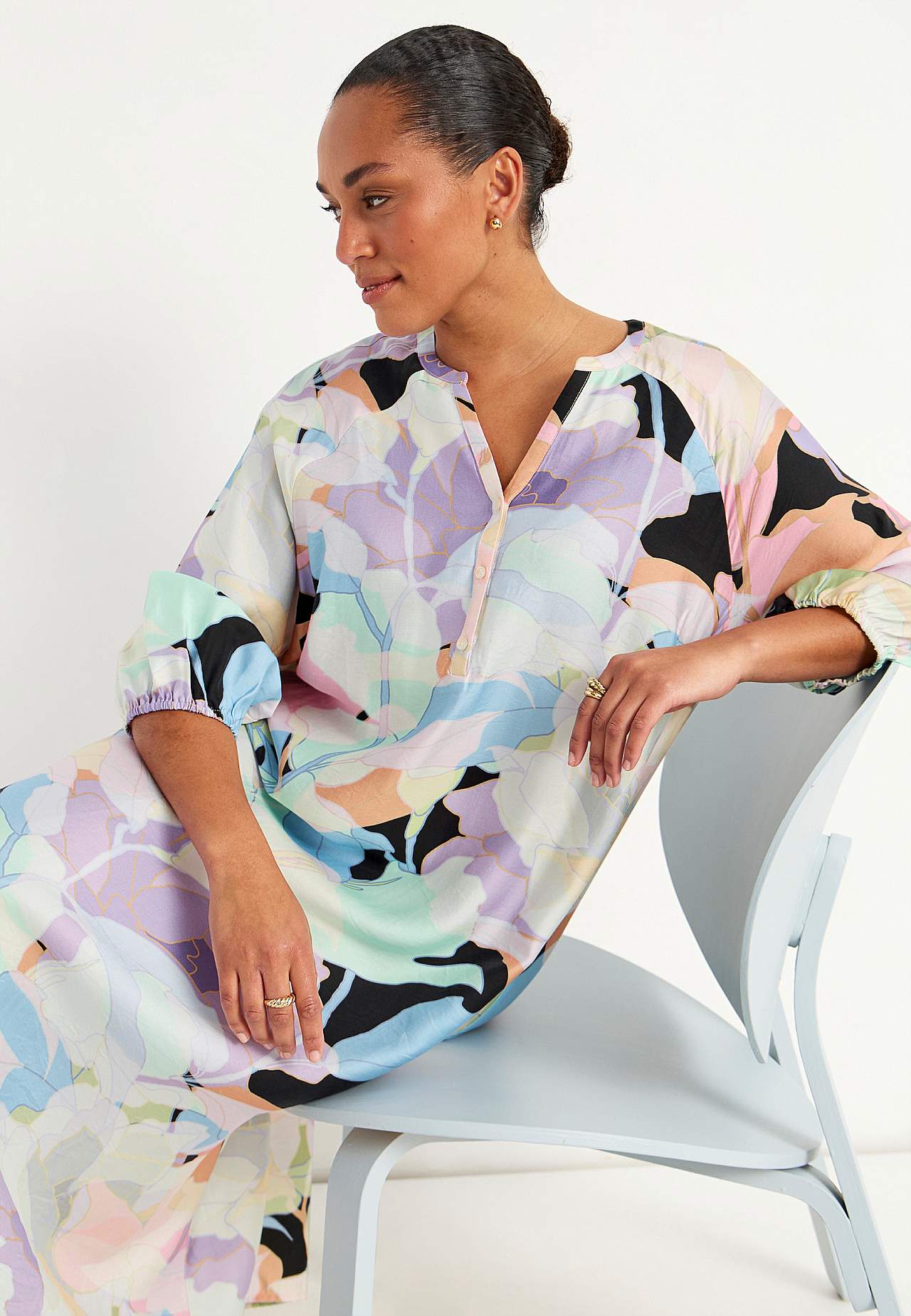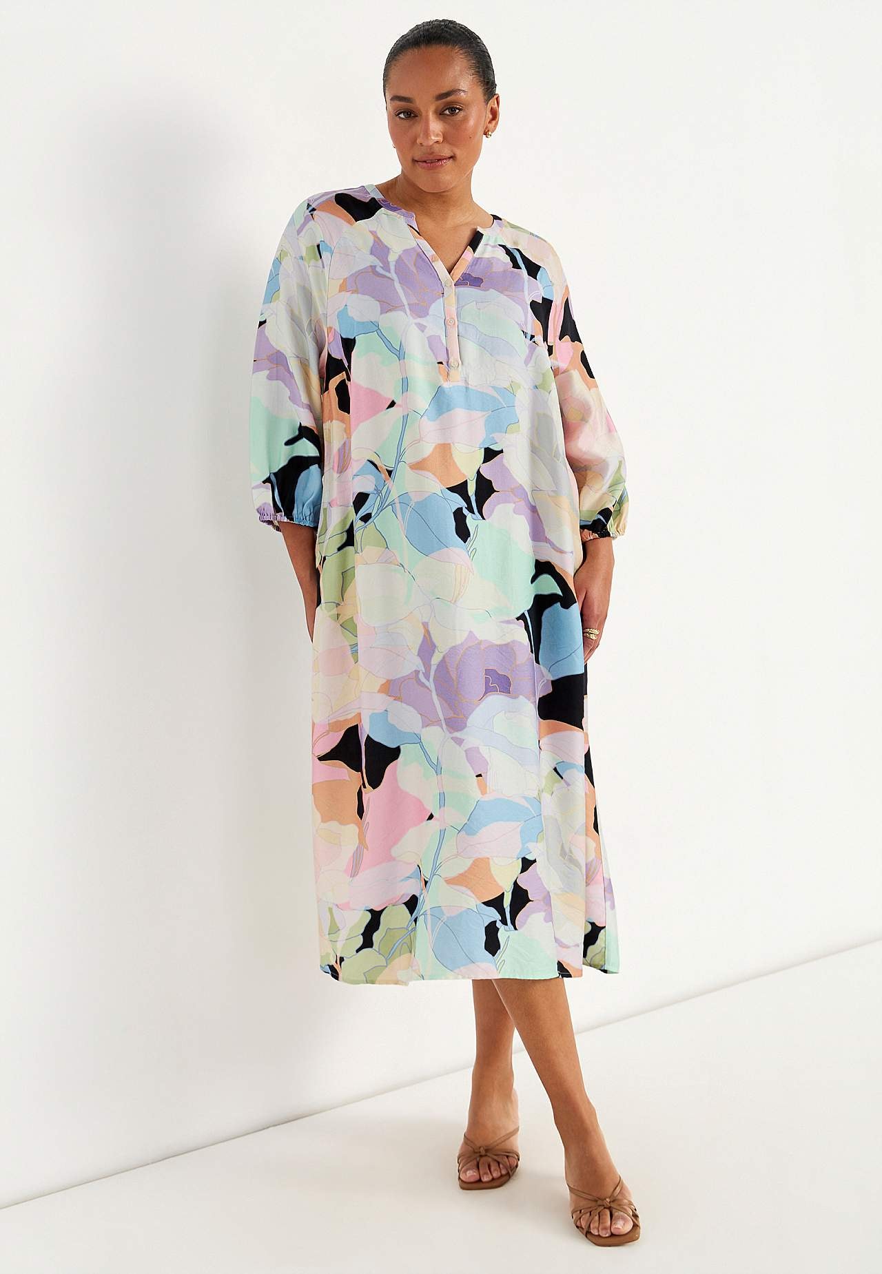 Kjole i viskose med lidt blankt strukturvævet stof. Dejligt fald og kølende følelse. A-linjeformet, løstsiddende og casual pasform. Rund hals med v-hals og knapstolpe med knapper. Brystindlæg. Let afrundet søm. Ryglængden følger størrelsen, ca. 124 cm.