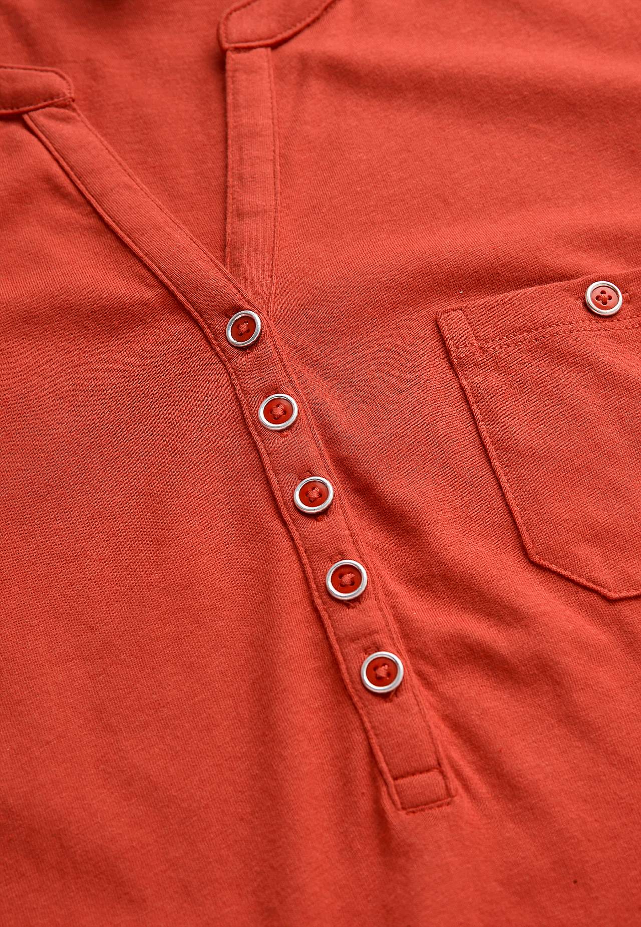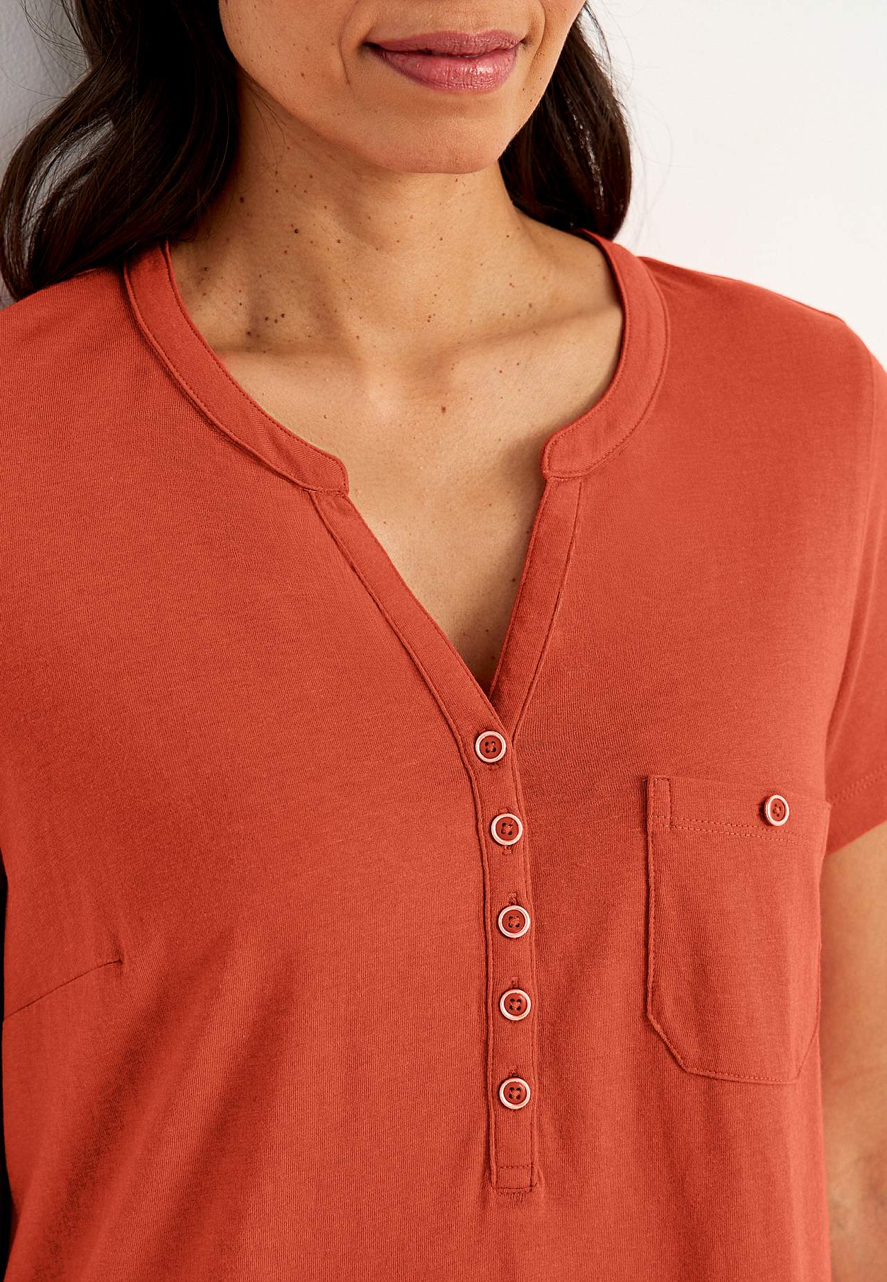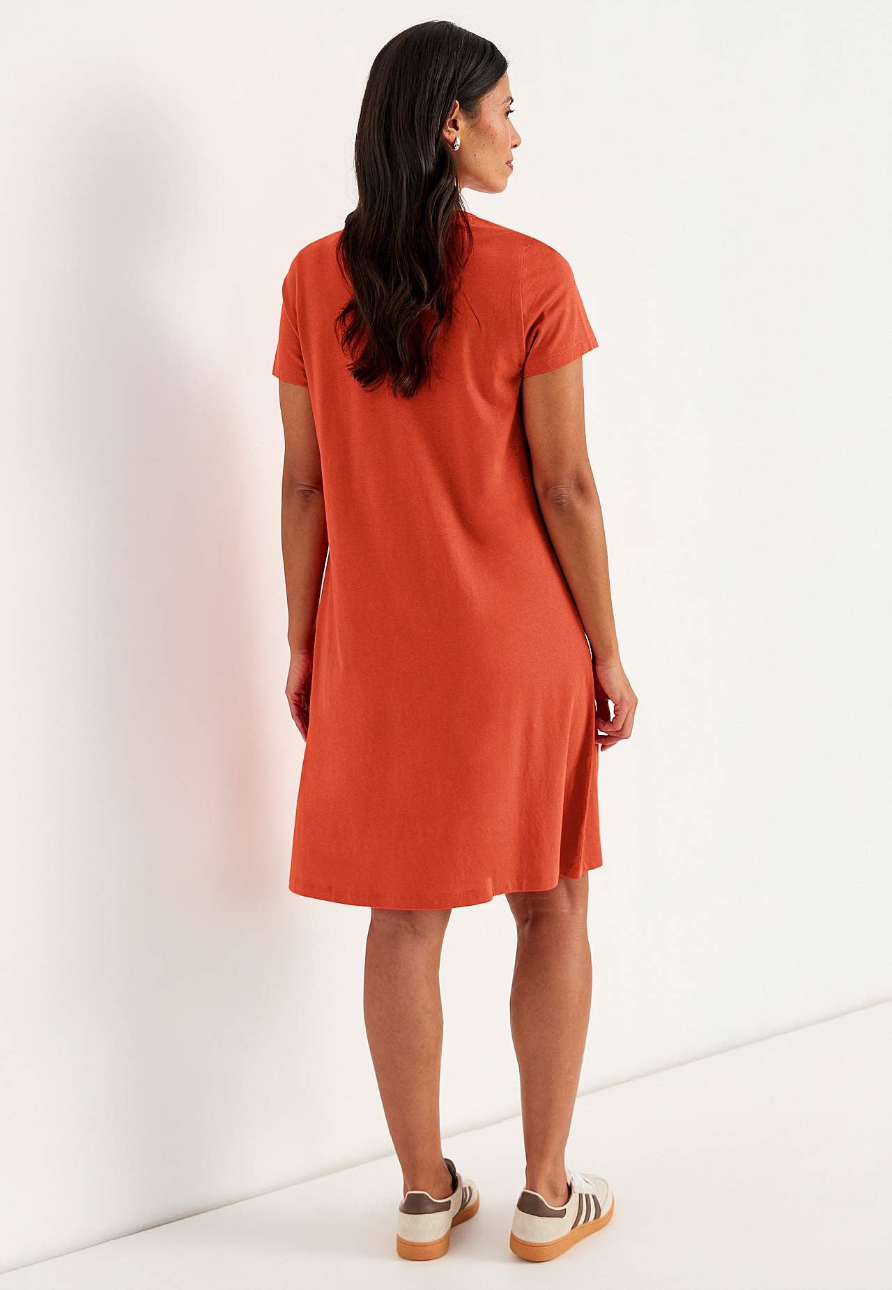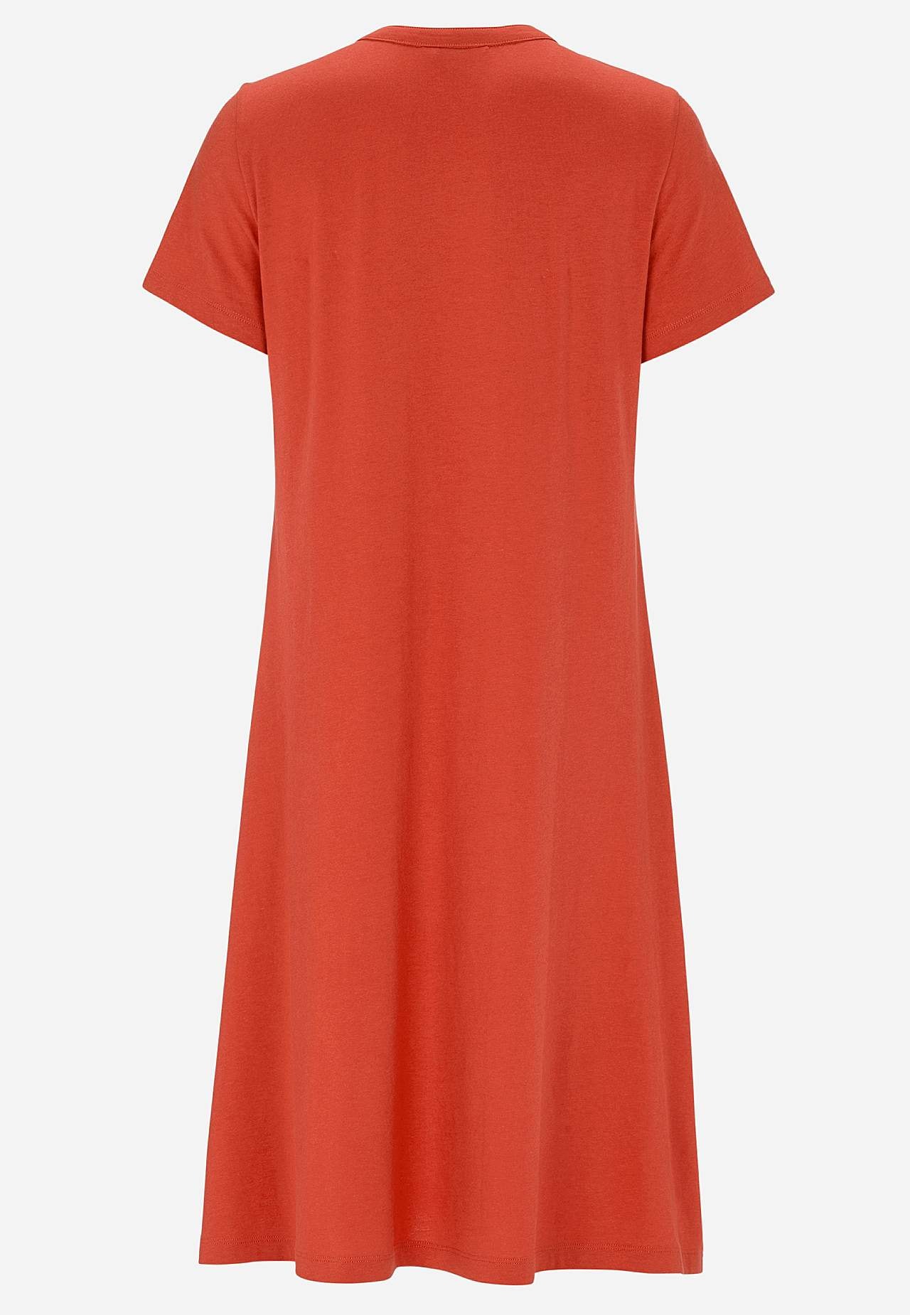 A-linjeformet kjole med korte ærmer. Jersey i dejligt blød økologisk bomuld og modal. Rund halsudskæring med v-udskæring og knapstolpe. Lille brystlomme med knap. Indsnit ved brystet. Let afrundet søm. Længden følger størrelsen, ca. 97-114 cm fra skulderen.