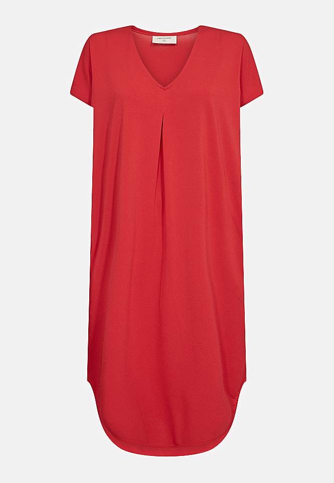 Kjole i jævn, kølende jerseykvalitet. V-udskåret model med flatterende, dekorativt læg både foran og bagpå. Løs pasform. Korte korte ærmer. Praktiske lommer i siderne. Afrundet søm. Længde fra skulder ca. 105 cm i størrelse M (40).