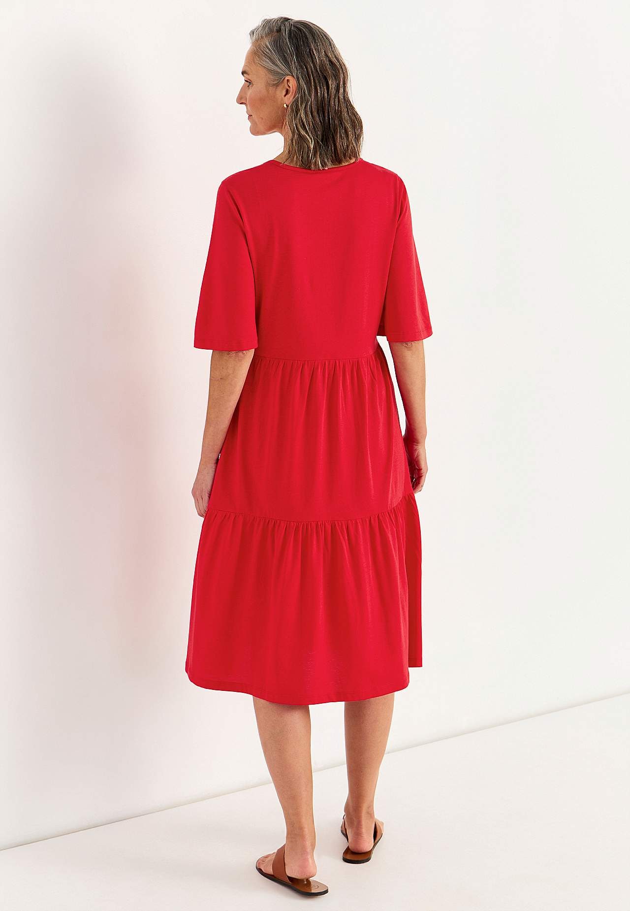 A-linjeformet, løs pasform. Rund hals. Søm under brystet. Skørtdel med volant. Let afrundet søm. Ryglængden følger størrelsen, ca. 108 cm.