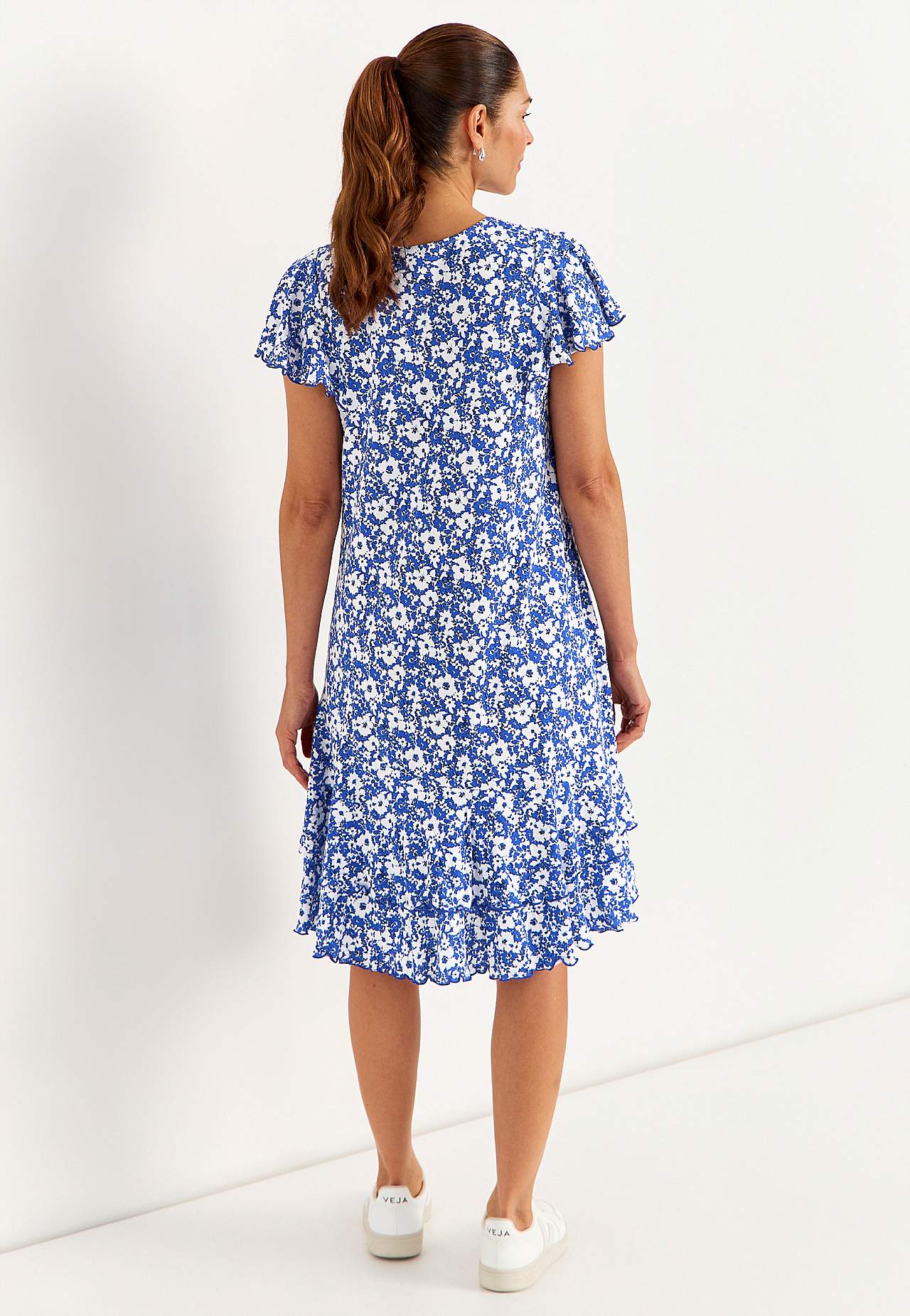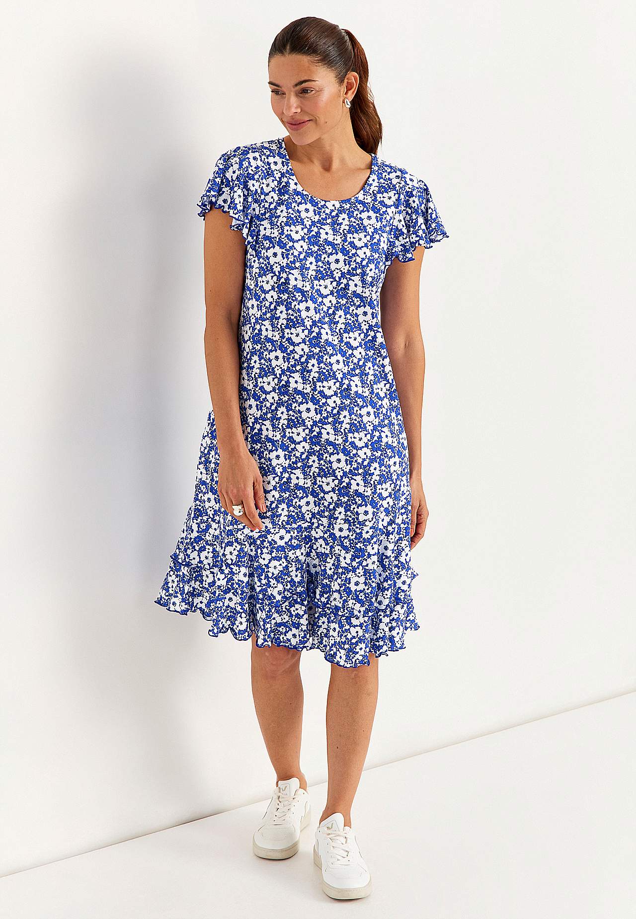 Kjole med asymmetrisk søm og dobbelte volanter nederst. Blød jersey i bomulds-viskoseblanding. Figursyet pasform med bred skørtdel. Rund halsudskæring. Korte sommerfugleærmer med overlocket, dekorativ, waverly kant. Brystindlæg. Volanter nederst med overlocket, waverly kant. Ryglængden følger størrelsen, ca. 104-111 cm.
