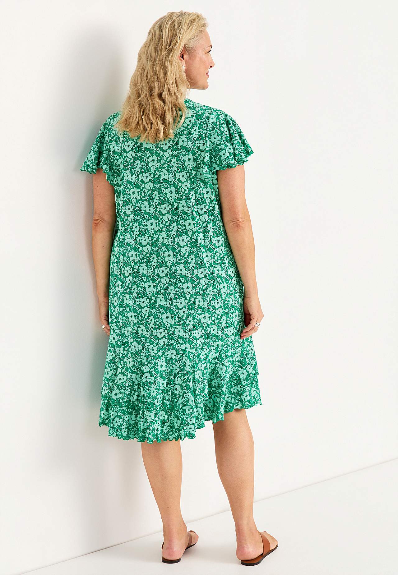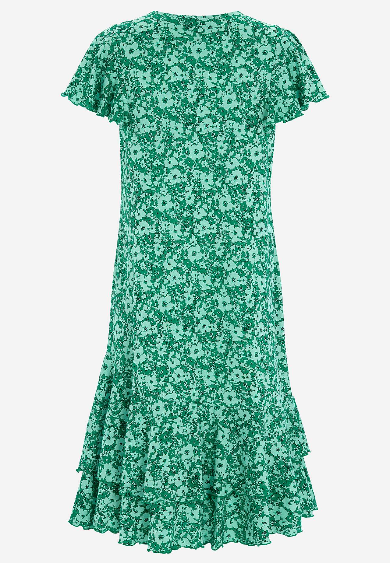 Kjole med asymmetrisk søm og dobbelte volanter nederst. Blød jersey i bomulds-viskoseblanding. Figursyet pasform med bred skørtdel. Rund halsudskæring. Korte sommerfugleærmer med overlocket, dekorativ, waverly kant. Brystindlæg. Volanter nederst med overlocket, waverly kant. Ryglængden følger størrelsen, ca. 104-111 cm.