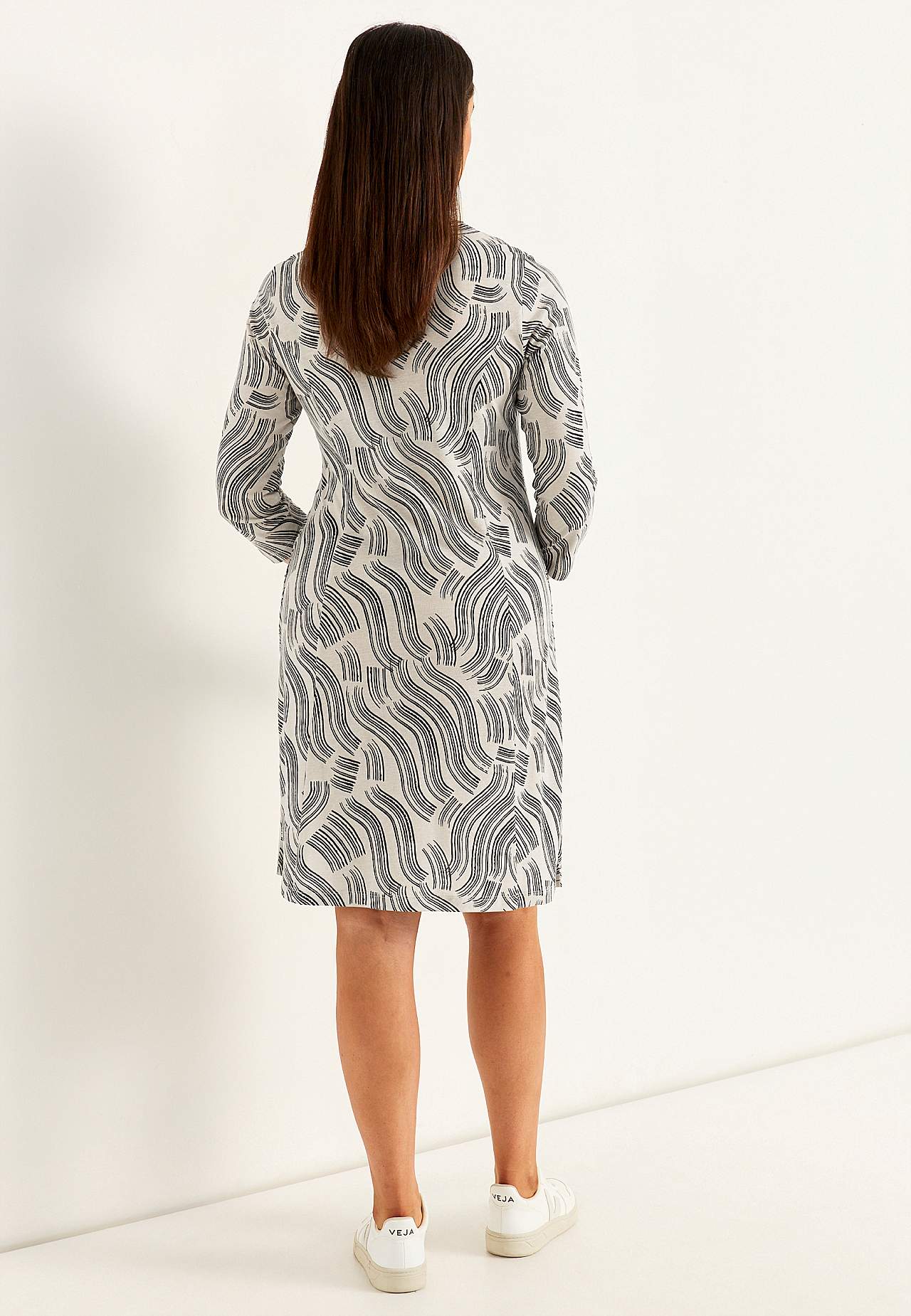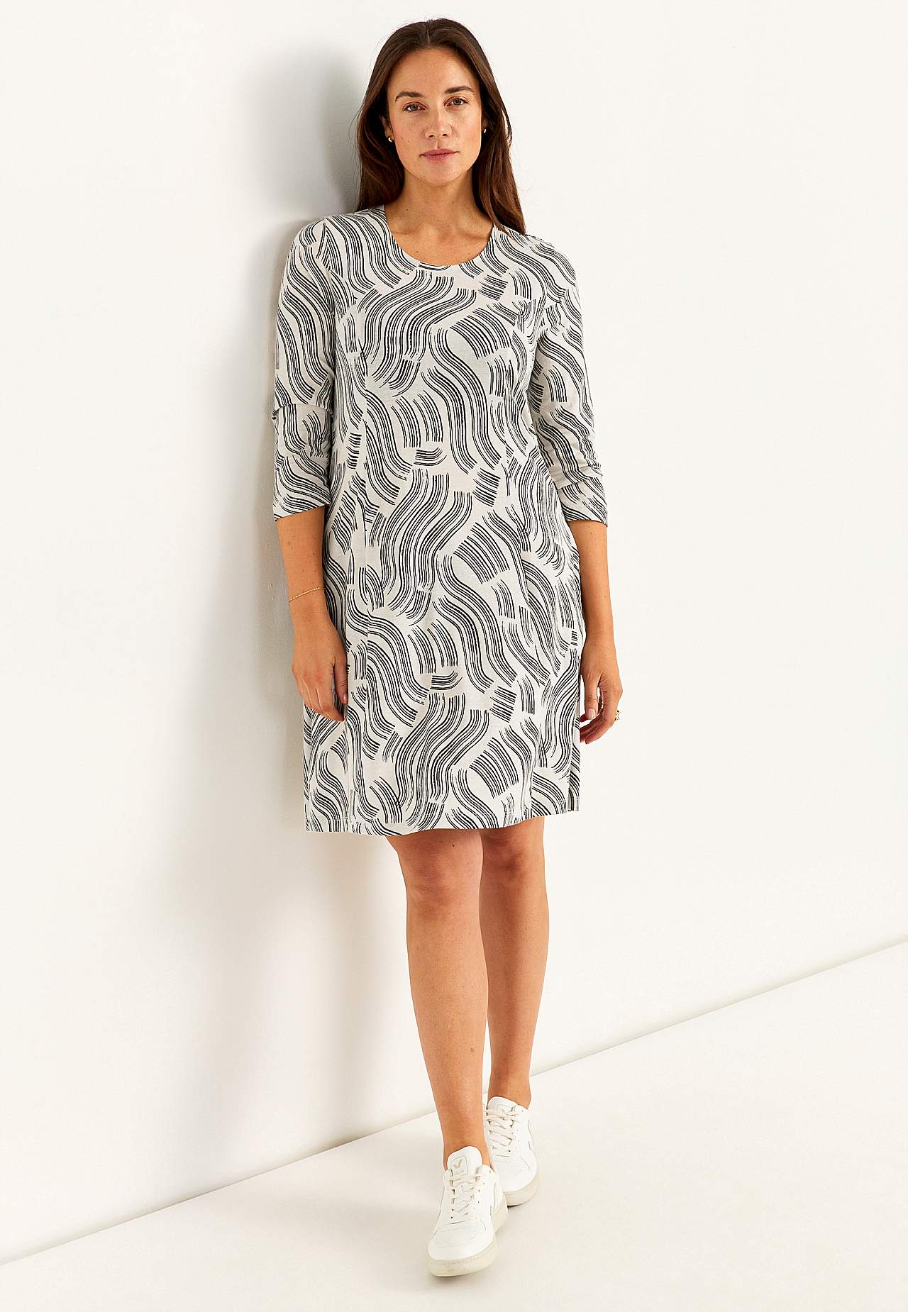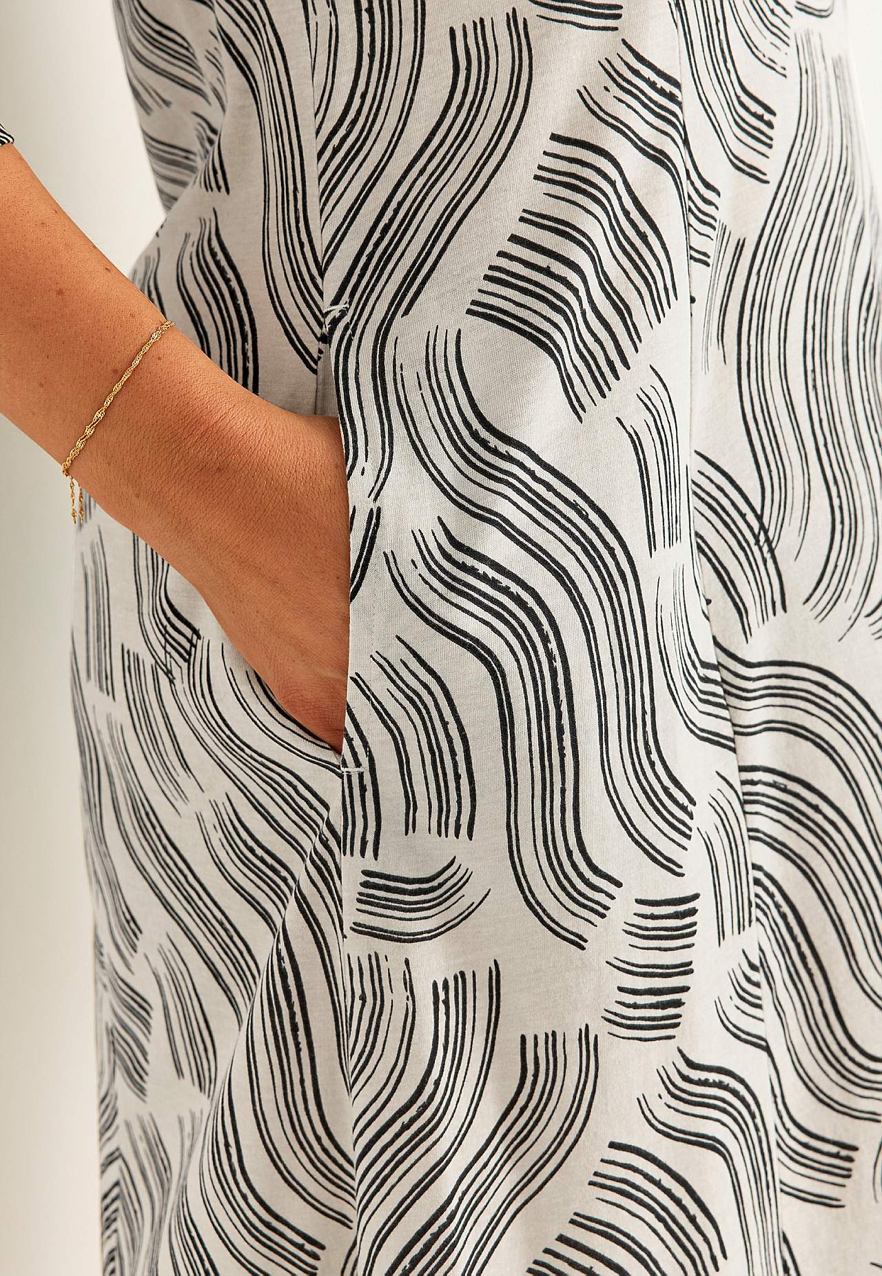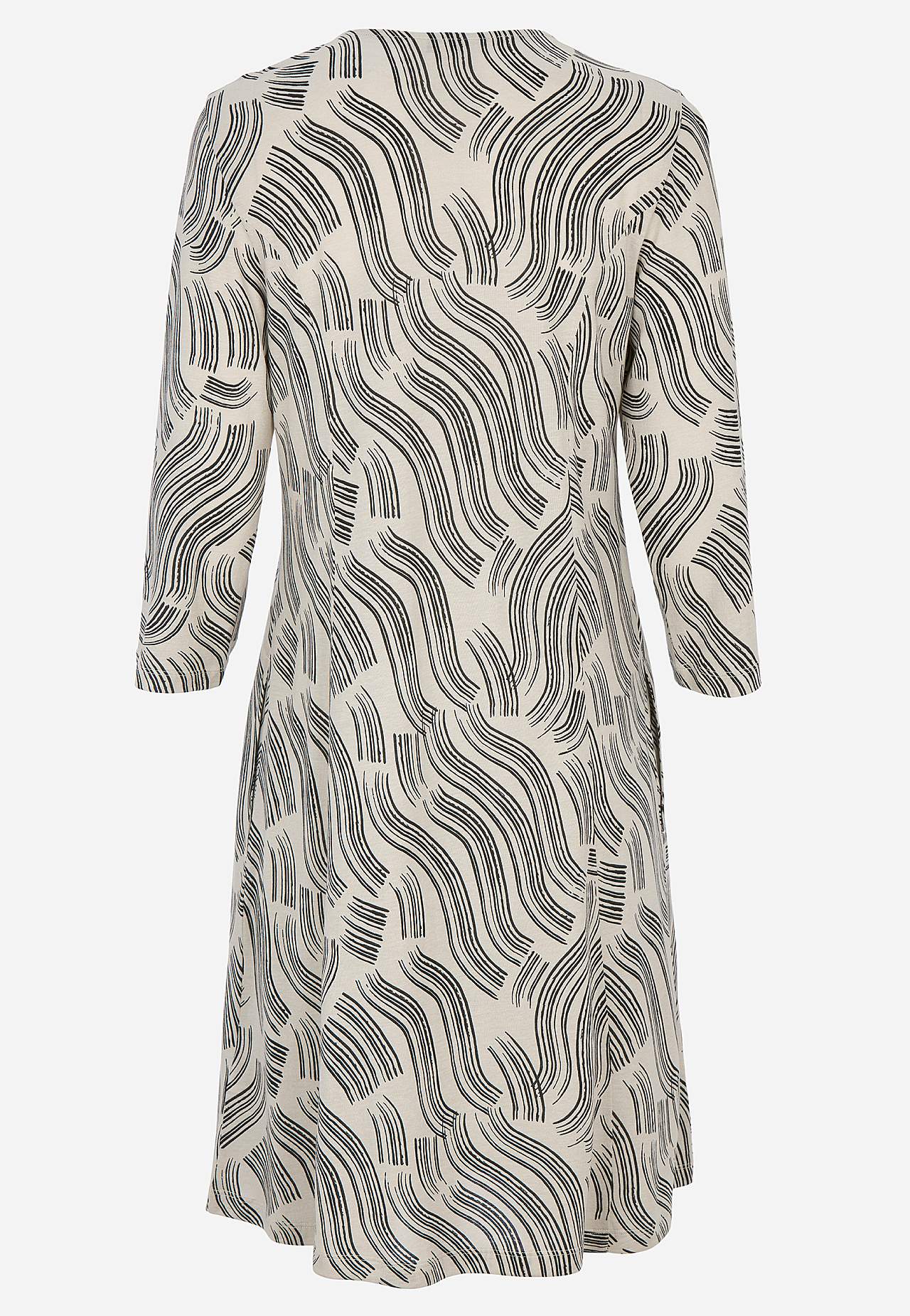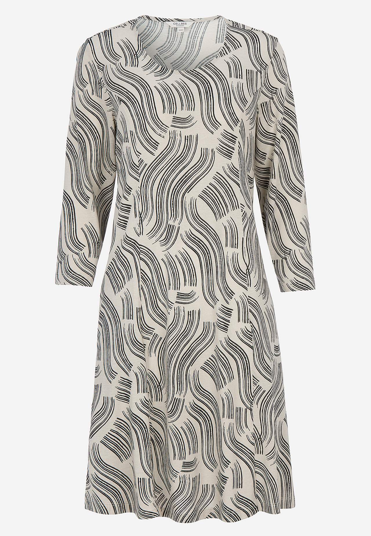 Blød, komfortabel kjole i bomulds-viskoseblanding. Stram pasform over brystet. Model med svaj med panelsømme både foran og bagpå. Afrundet halsudskæring. Bekvemme sidelommer. 3/4 lange, lige ærmer. Længden følger størrelsen, ca. 96-108 cm fra skulderen.