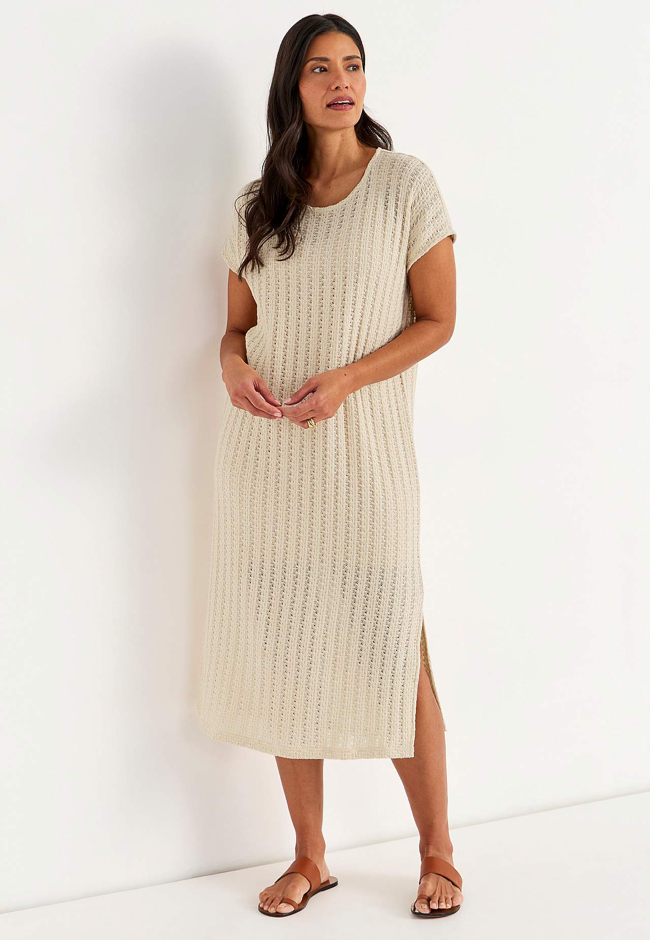 Strikket, luftig jerseykjole med iøjnefaldende hulmønster. Blød, fast bomuldsblanding. Uforet, lang kaftanmodel. Lækker at have på over en tanktop og et par hvide jeans. Uformel pasform. Afrundet halsudskæring. Korte korte ærmer. Let afrundet søm med slids i siden. Ryglængden følger størrelsen, ca. 124 cm.