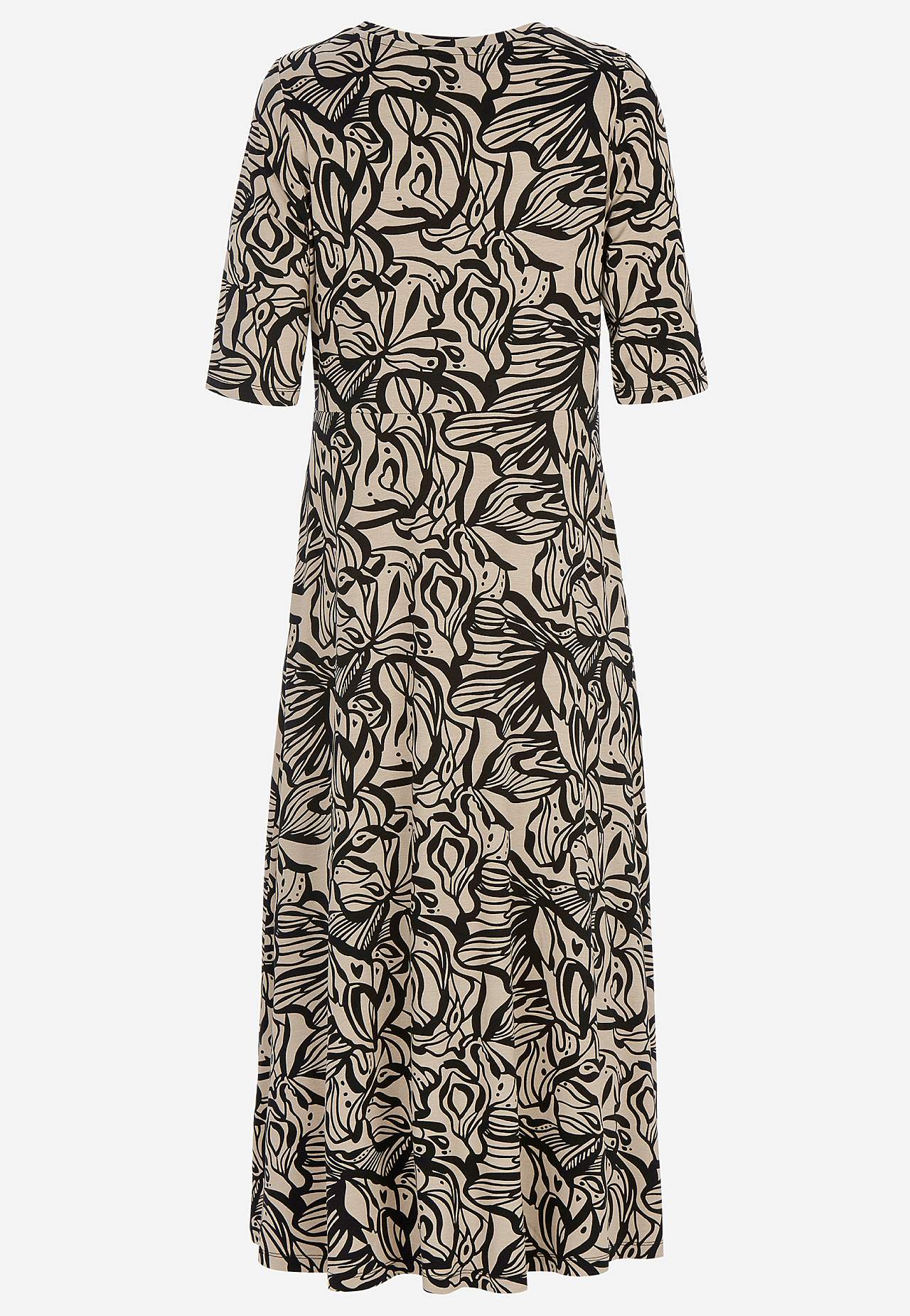 Kjole i jævn, vidunderligt blød viskosejersey. Materiale med kraftigt, dejligt fald. Normal pasform med uformel vidde nederst. V-formet halsudskæring. 3/4 lange, smalle ærmer. Søm ved taljen. Lommer i siden. Ryglængden følger størrelsen, ca. 125 cm.