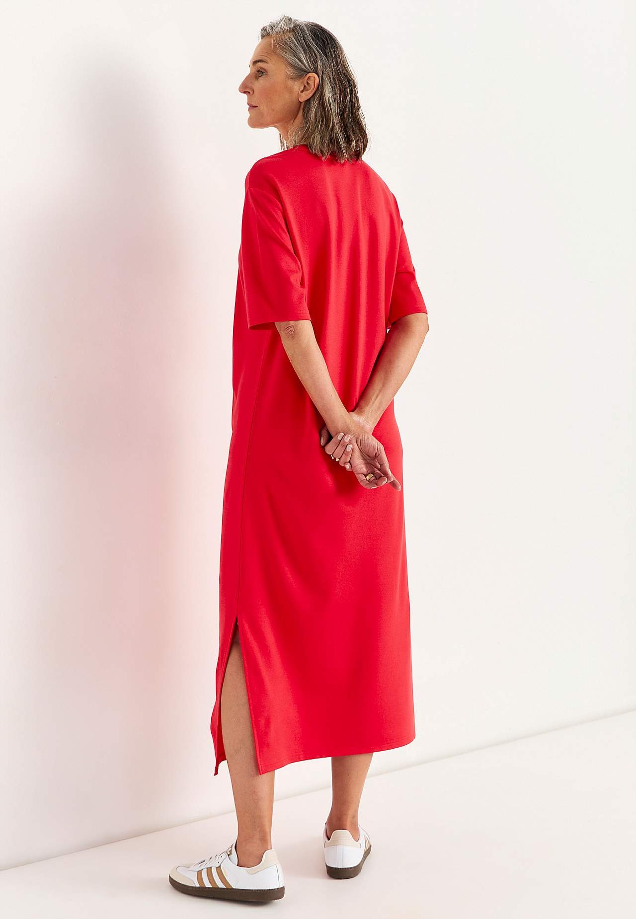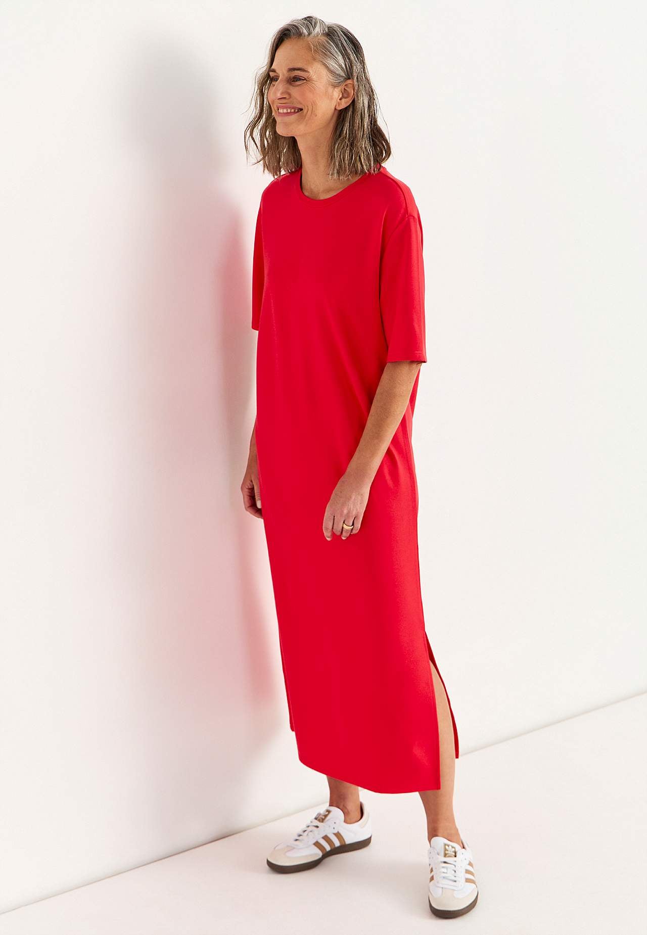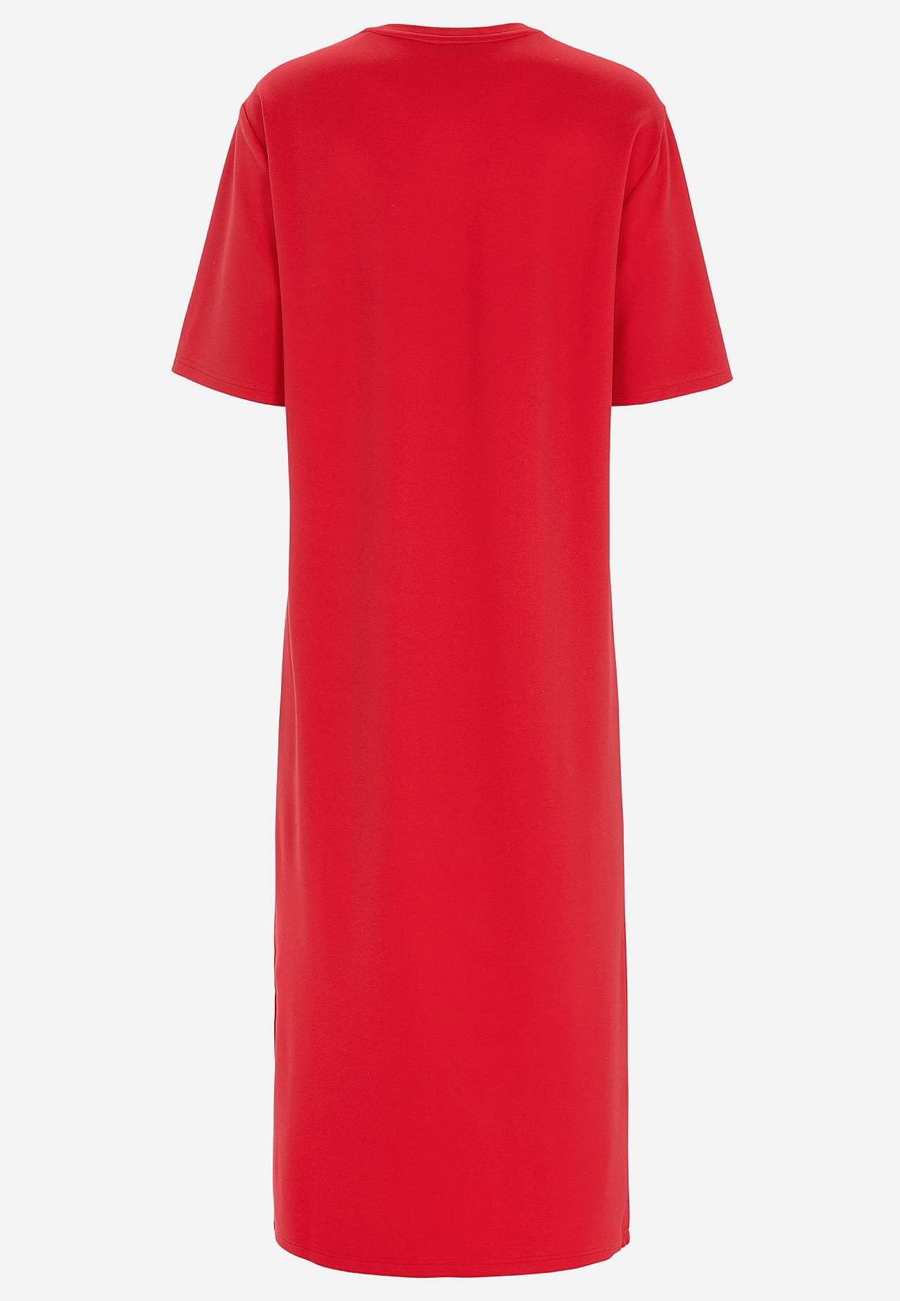 Blød kjole i kraftig jersey med stræk. Lige, løs pasform. Rund halsudskæring. Droppet skulder. Korte ærmer. Lige søm med høj slids i siden. Længde fra skulder ca. 121 cm i alle størrelser.