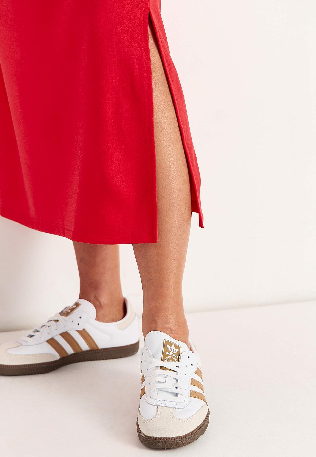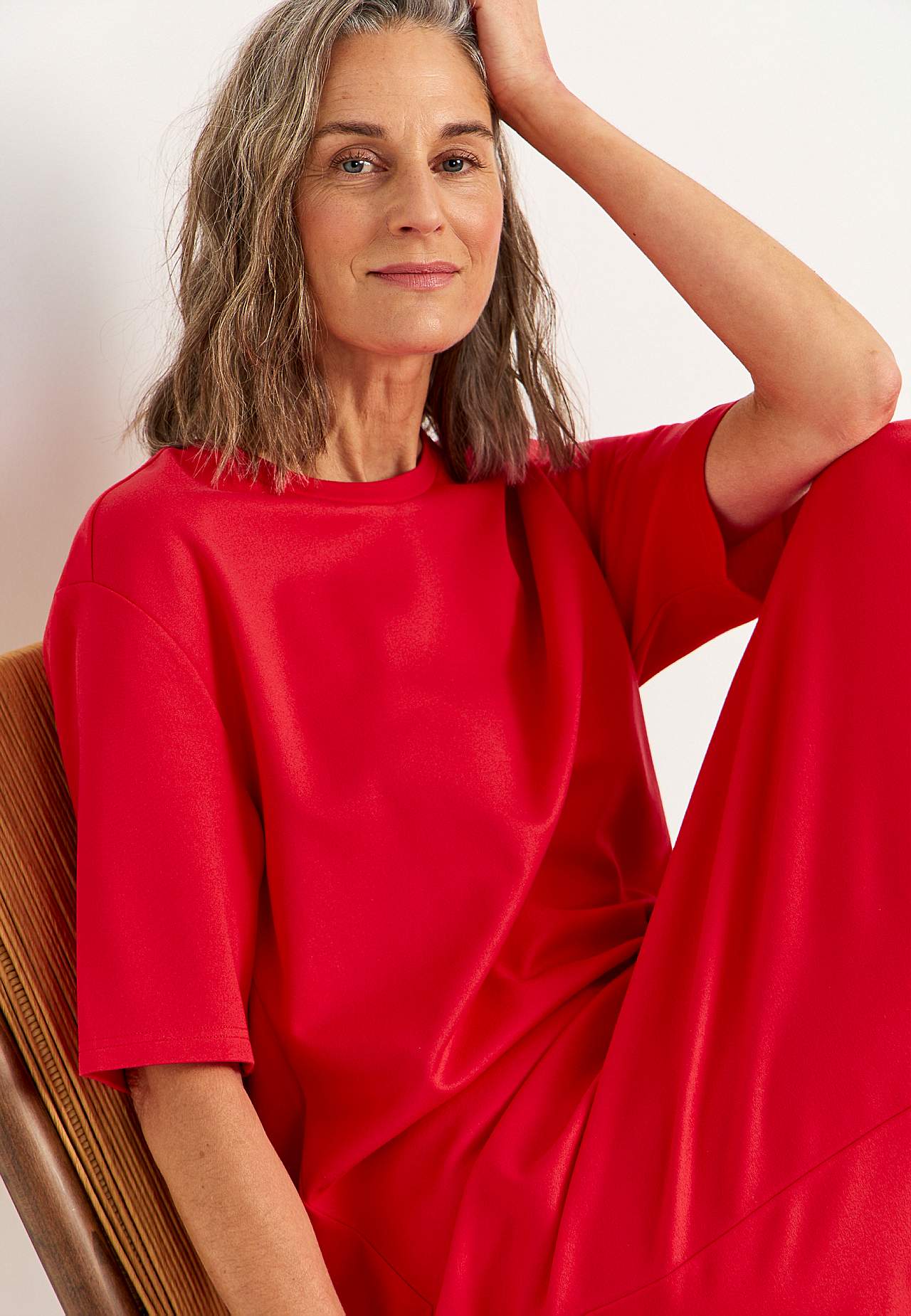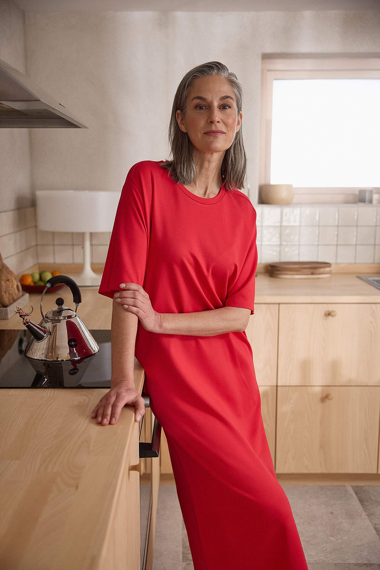 Blød kjole i kraftig jersey med stræk. Lige, løs pasform. Rund halsudskæring. Droppet skulder. Korte ærmer. Lige søm med høj slids i siden. Længde fra skulder ca. 121 cm i alle størrelser.