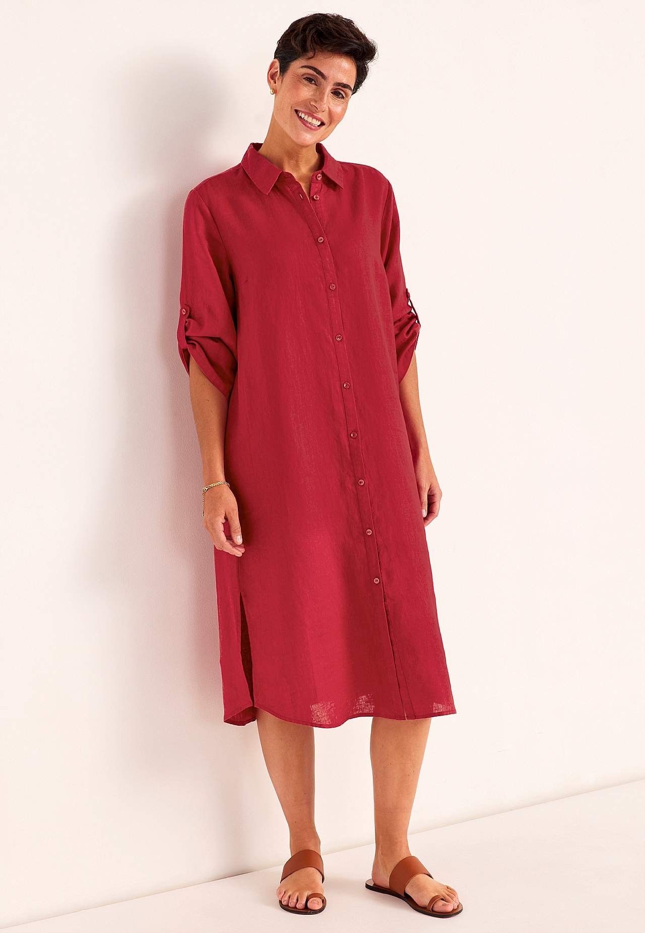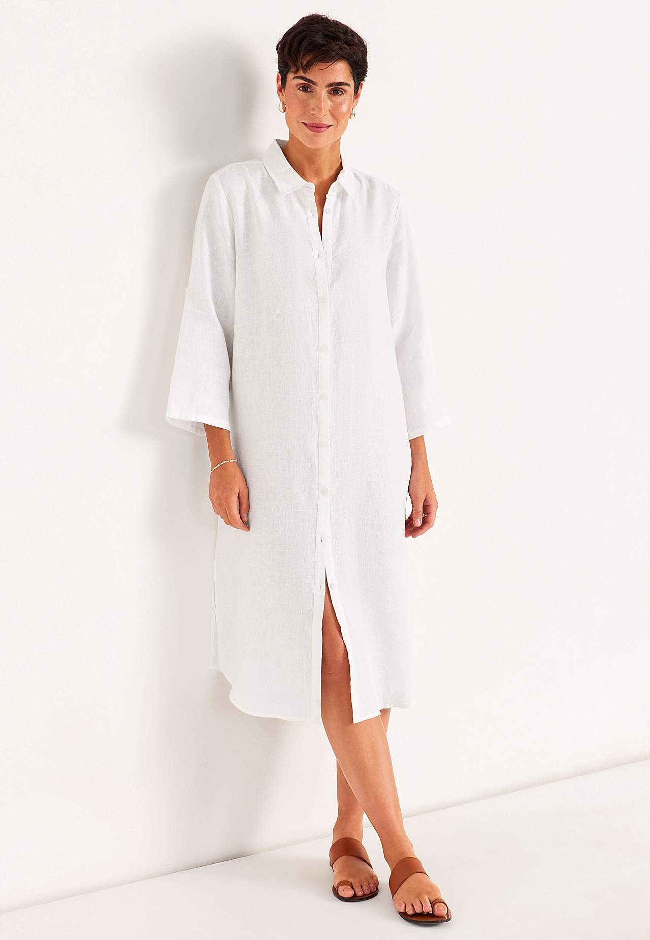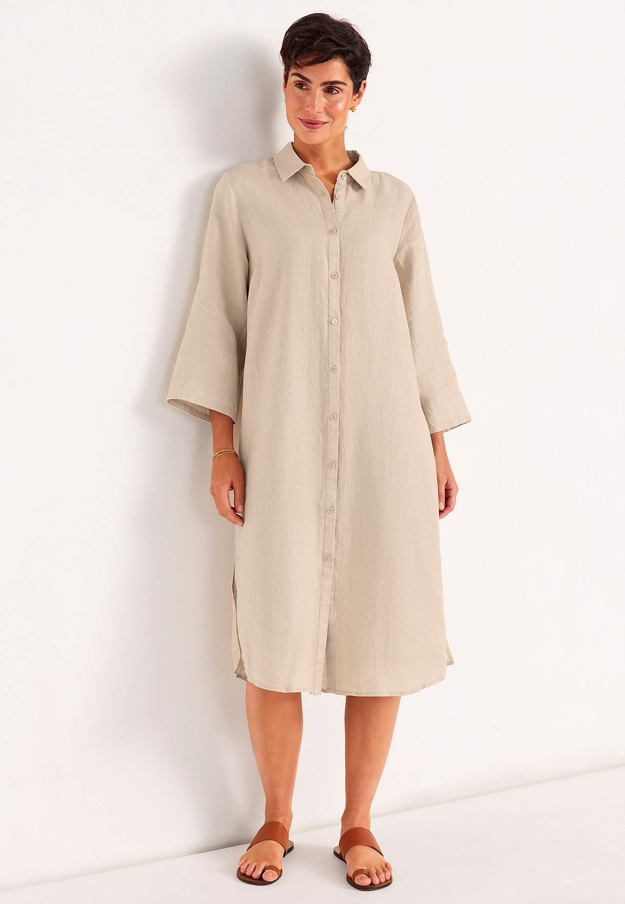 Skjortekjole i 100 % hør. Luftigt materiale. Rummelig, lige snit pasform. Knapstolpe fra top til bund. Foldbart langt ærme med knapdetalje. Indsnit ved brystet for den bedste pasform. En rigtig hverdagsfavorit. Længden følger størrelsen, ca. 116-124 cm fra skulderen.