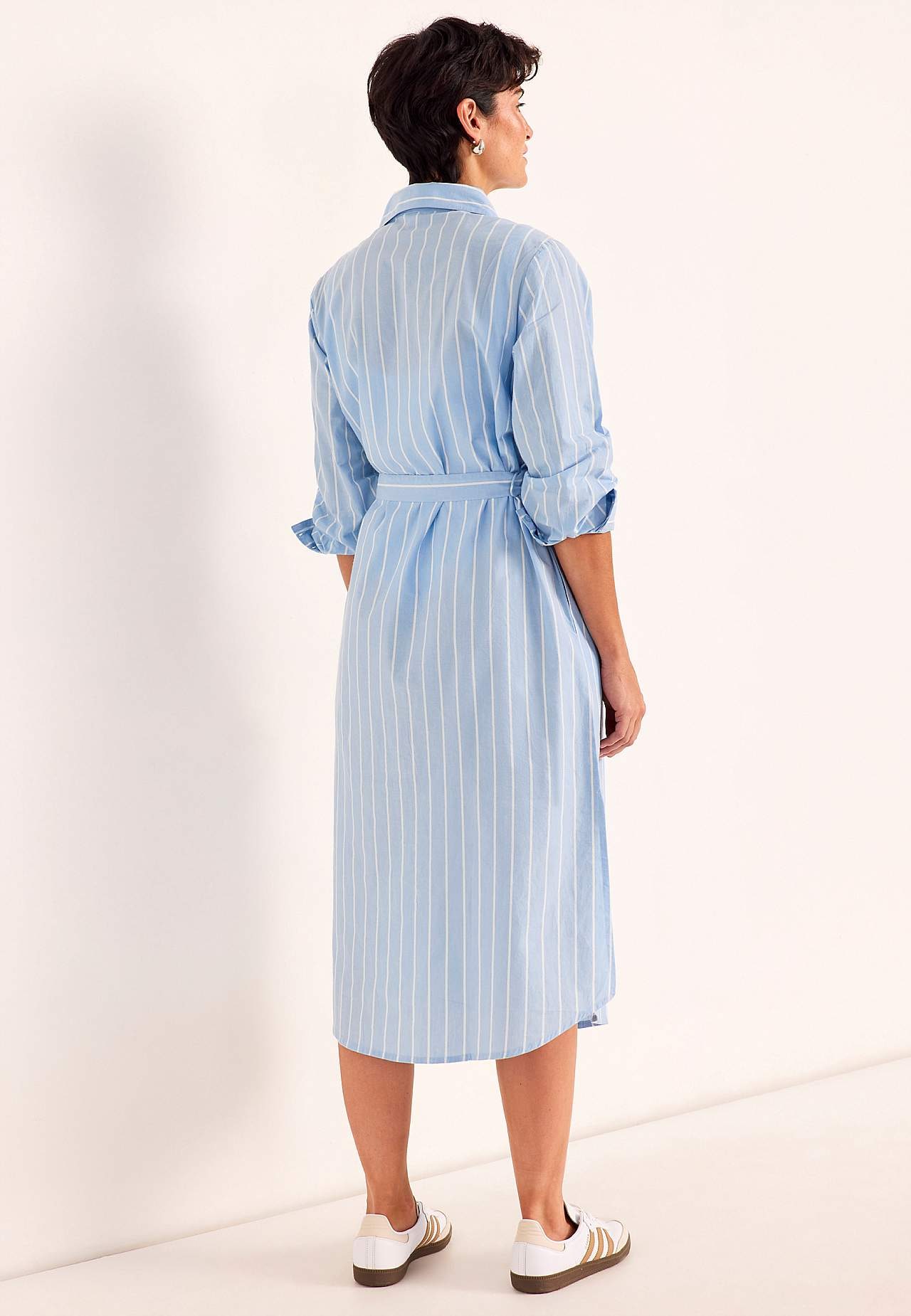 Skjortekjole med klassisk krave og aftageligt bindebælte. Vævet, blødt materiale med frisk følelse. Garnfarvet stribe. Løstsiddende og casual pasform. Klassisk krave. Gennemknappet model. Lange ærmer med manchet og knapper. Aftageligt bindebælte. Flot at have på med eller uden bælte. Lommer i sidesømmen. Afrundet søm med sl... Læs mere