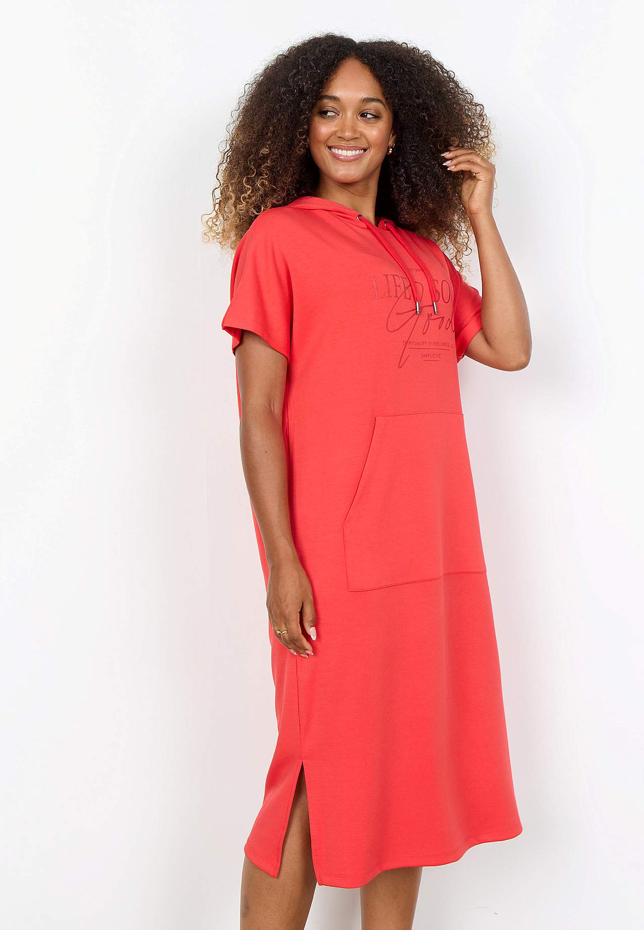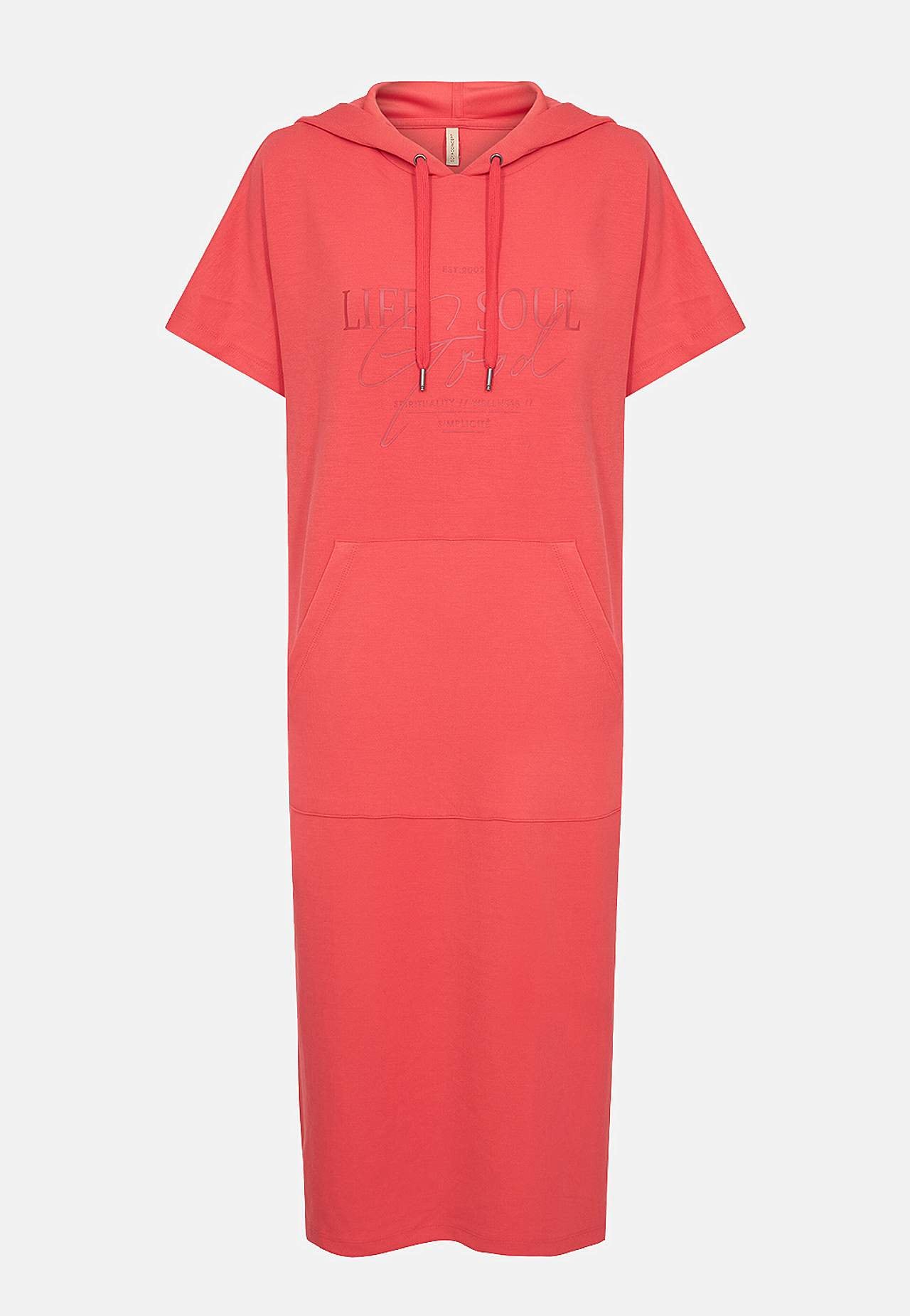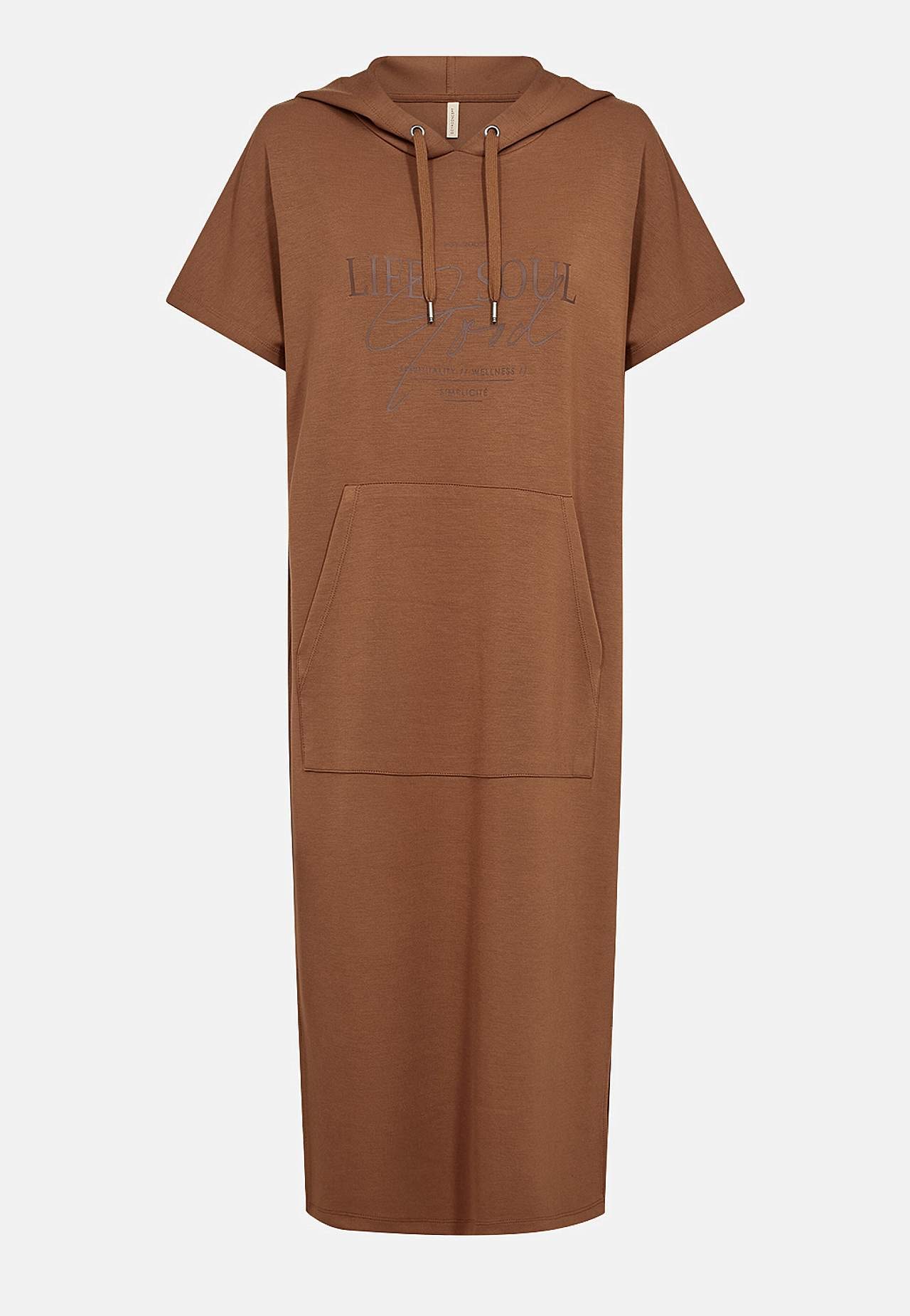 Kjole i dejligt blødt modalmiks og noget kraftigere jersey. Lige pasform. Stor hætte med træksnøre. Tekstudskrift foran. Kængurulomme på fronten. Korte ærmer. Lige søm med slids i siderne. Længde fra skulder ca. 114 cm i størrelse S (38).