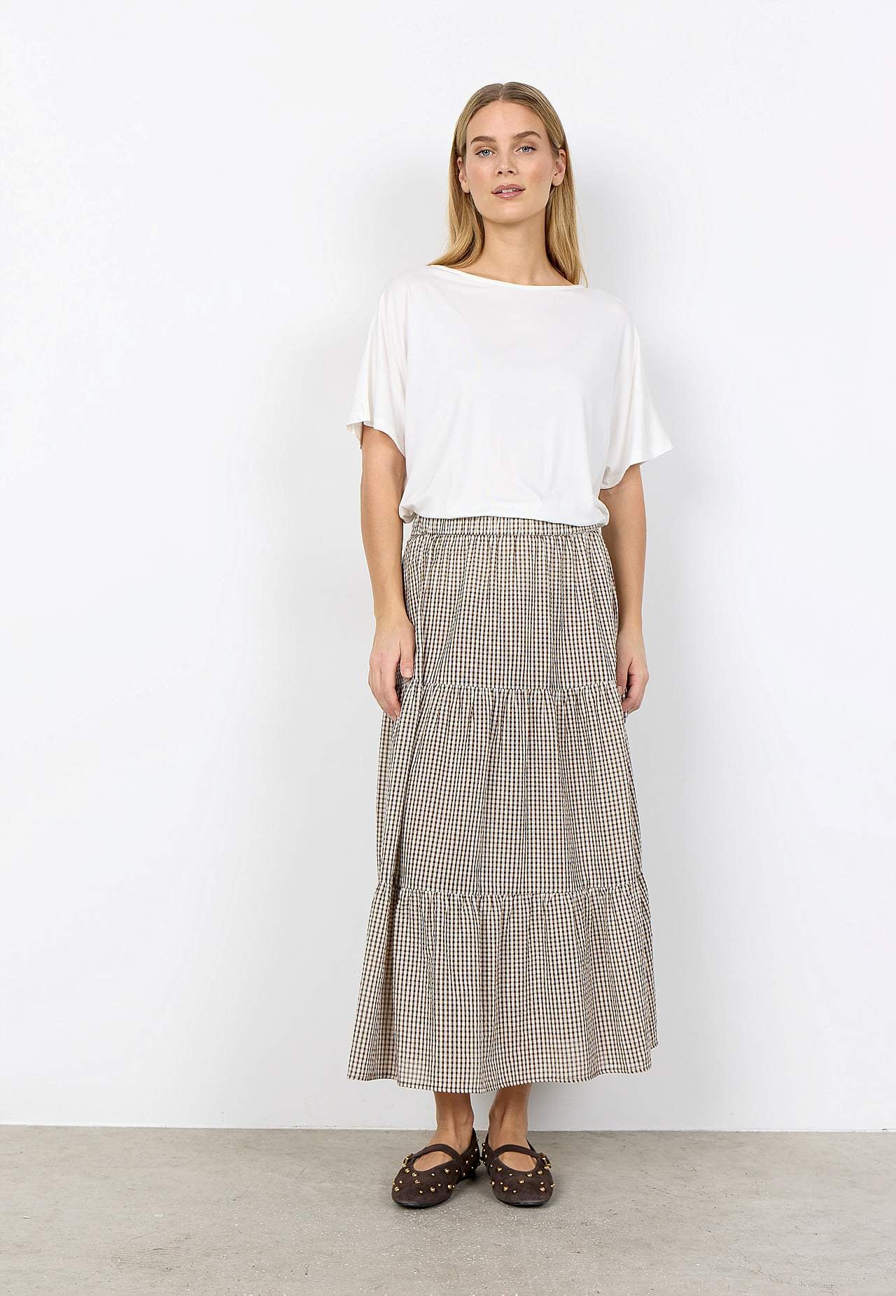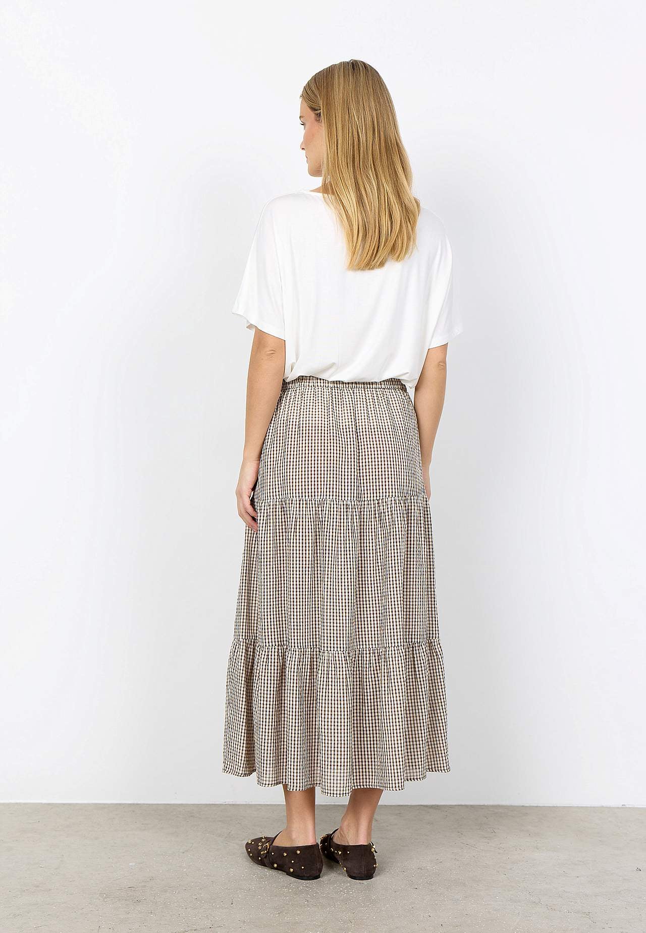 Foret volantnederdel med garnfarvede, små tern. Luftigt materiale i økologisk, blød bomuld. A-linjeformet pasform med herlig vidde nederst. Komfortabel, bred elastisk talje. For i blød viskose. Lige søm. Længde ca. 90 cm i størrelse S (38).
