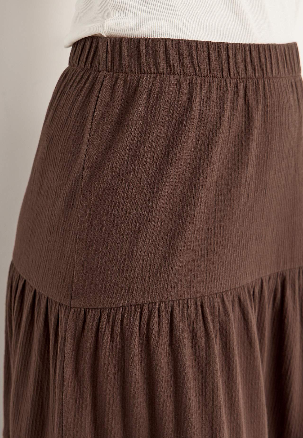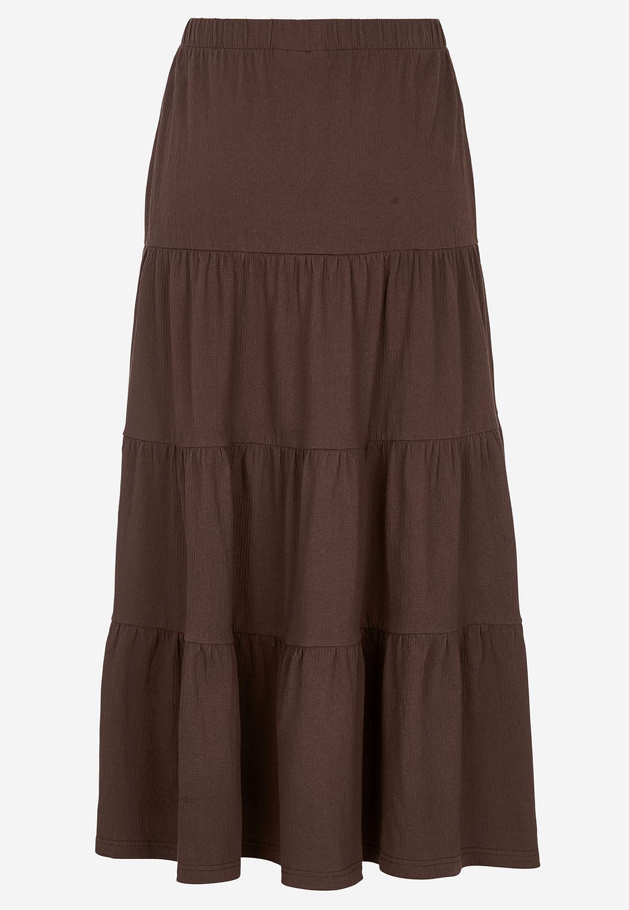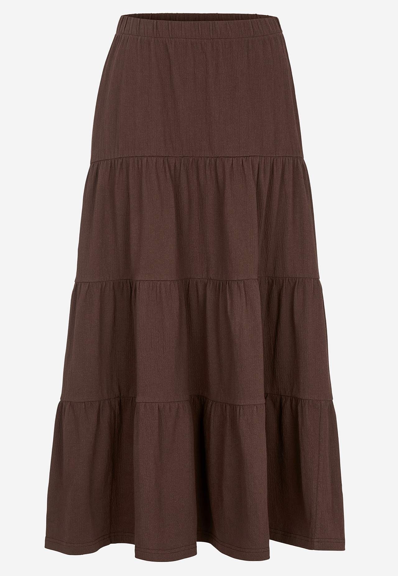 Blød, elastisk nederdel med bølget struktur. A-linjeformet pasform med vidde nederst. Talje med blød, bred elastik. Afrundet søm. Match gerne med 701369. Længde: 90 cm.