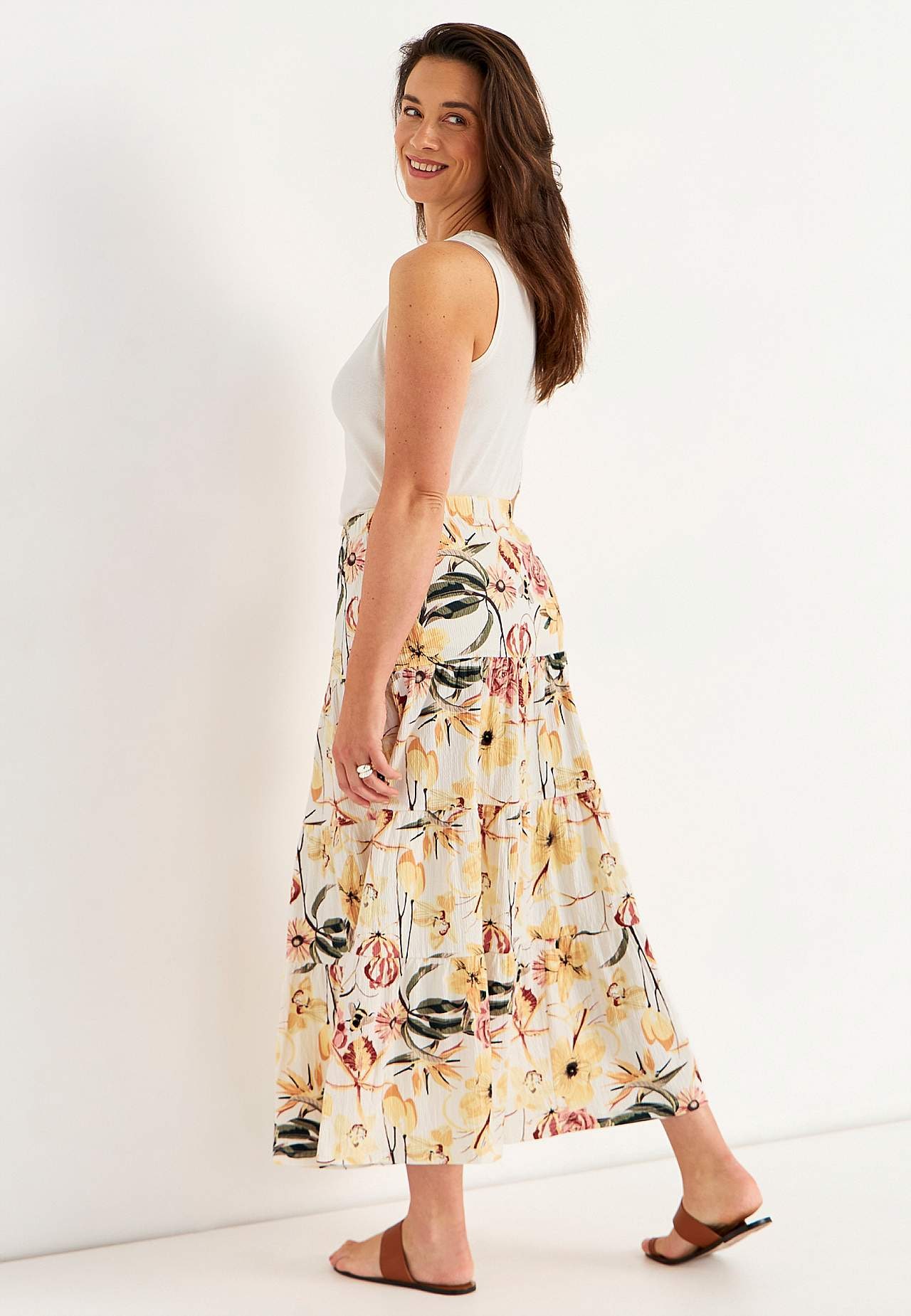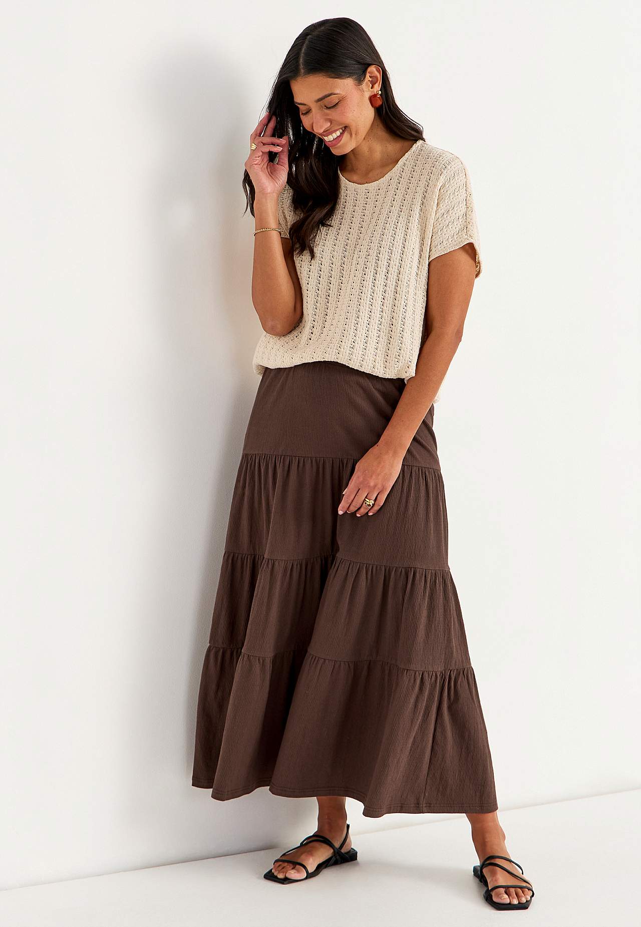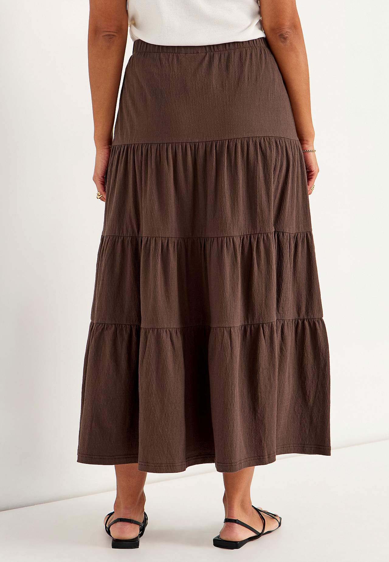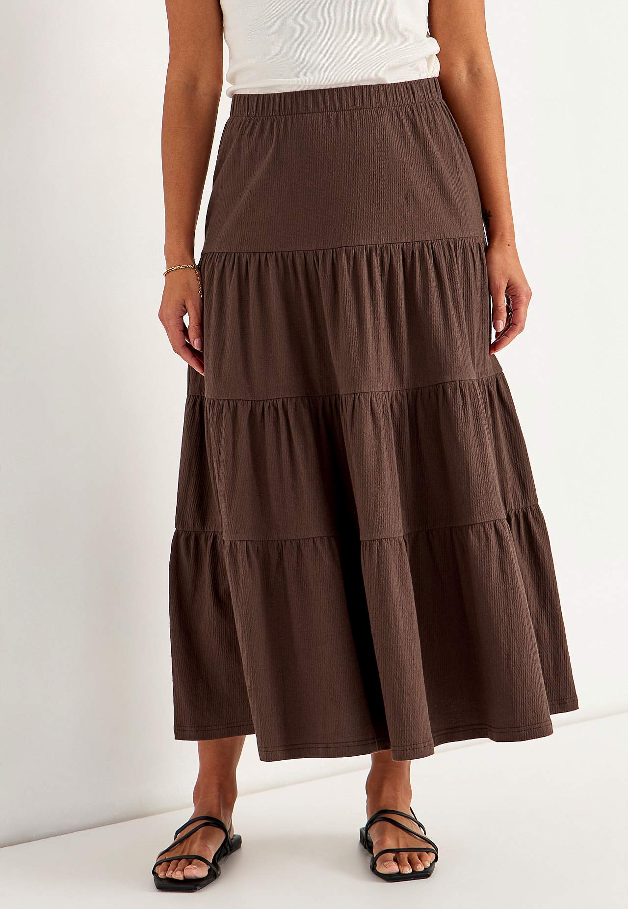 Blød, elastisk nederdel med bølget struktur. A-linjeformet pasform med vidde nederst. Talje med blød, bred elastik. Afrundet søm. Match gerne med 701369. Længde: 90 cm.