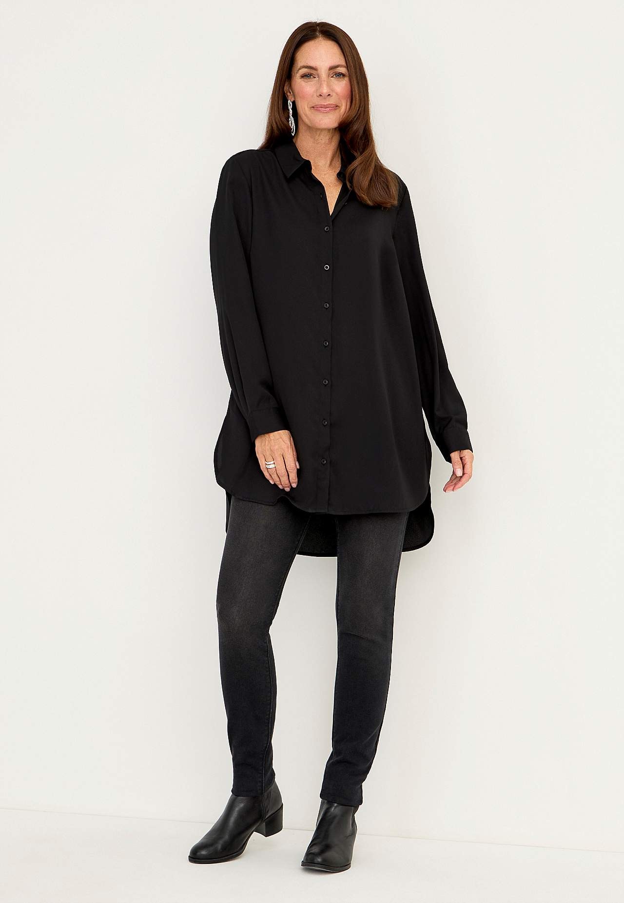 Herligt stræk. Normal talje. Linning med elastik. Jeanslook. Indvendig benlængde ca. 72 cm i alle størrelser. Skridthøjden følger størrelsen ca. 30-40 cm.