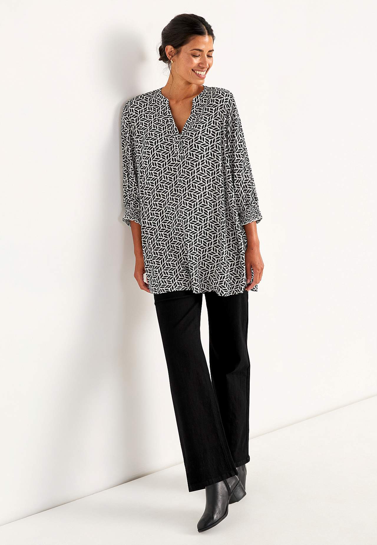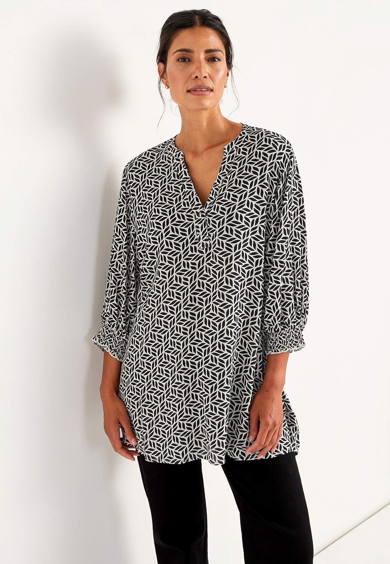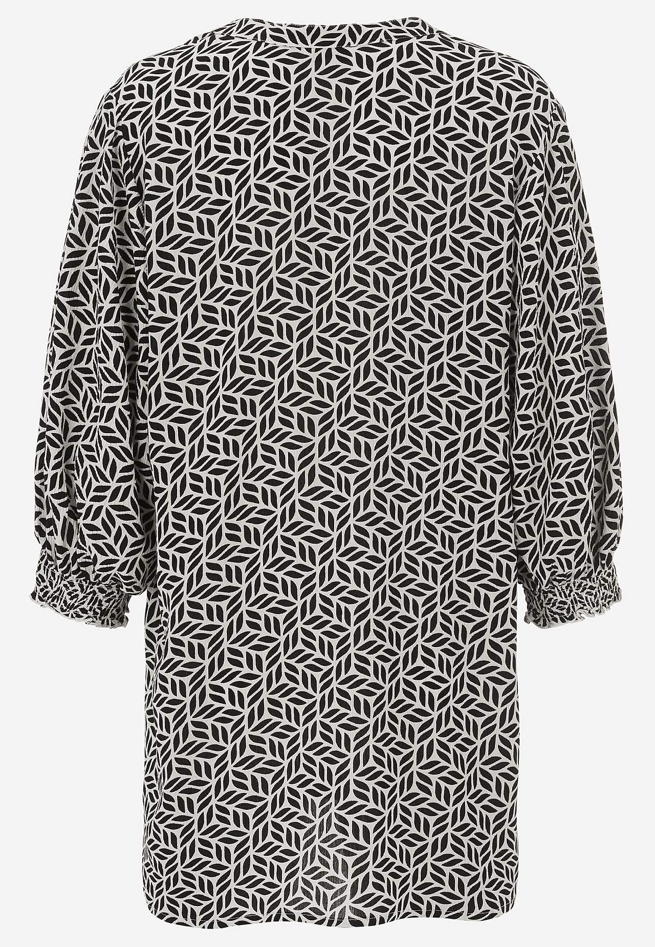 Vævet, kreppet tunika. Rummelig pasform. 3/4 lange ærmer med smock på ærmeafslutningerne. Længden følger størrelsen, ca. 78-88 cm fra skulderen.